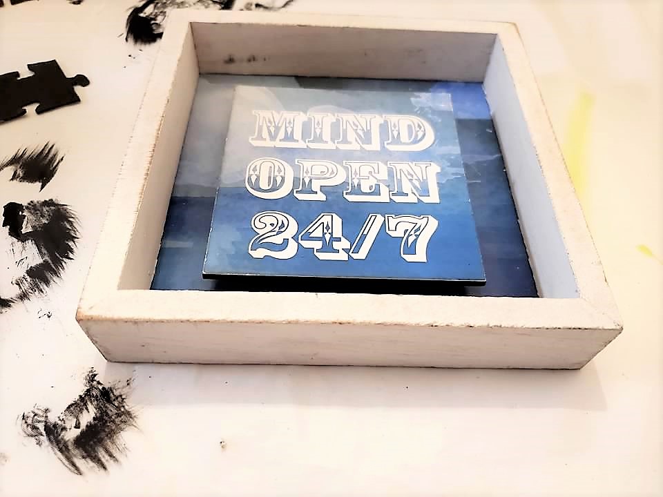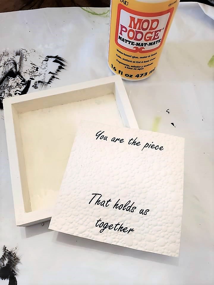 Using modpodge I glued the MOM puzzle piece in the center and then the other two pieces to each side of it. I gave one good coat of modpodge on the entire inner surface.