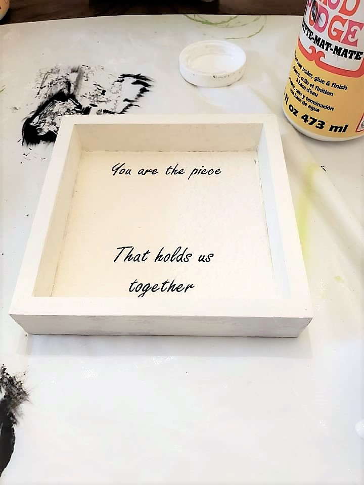 Cut my card stock with the saying to fit inside my frame. Using modpodge I coated the inside of my frame. Placed my piece of cardstock inside.