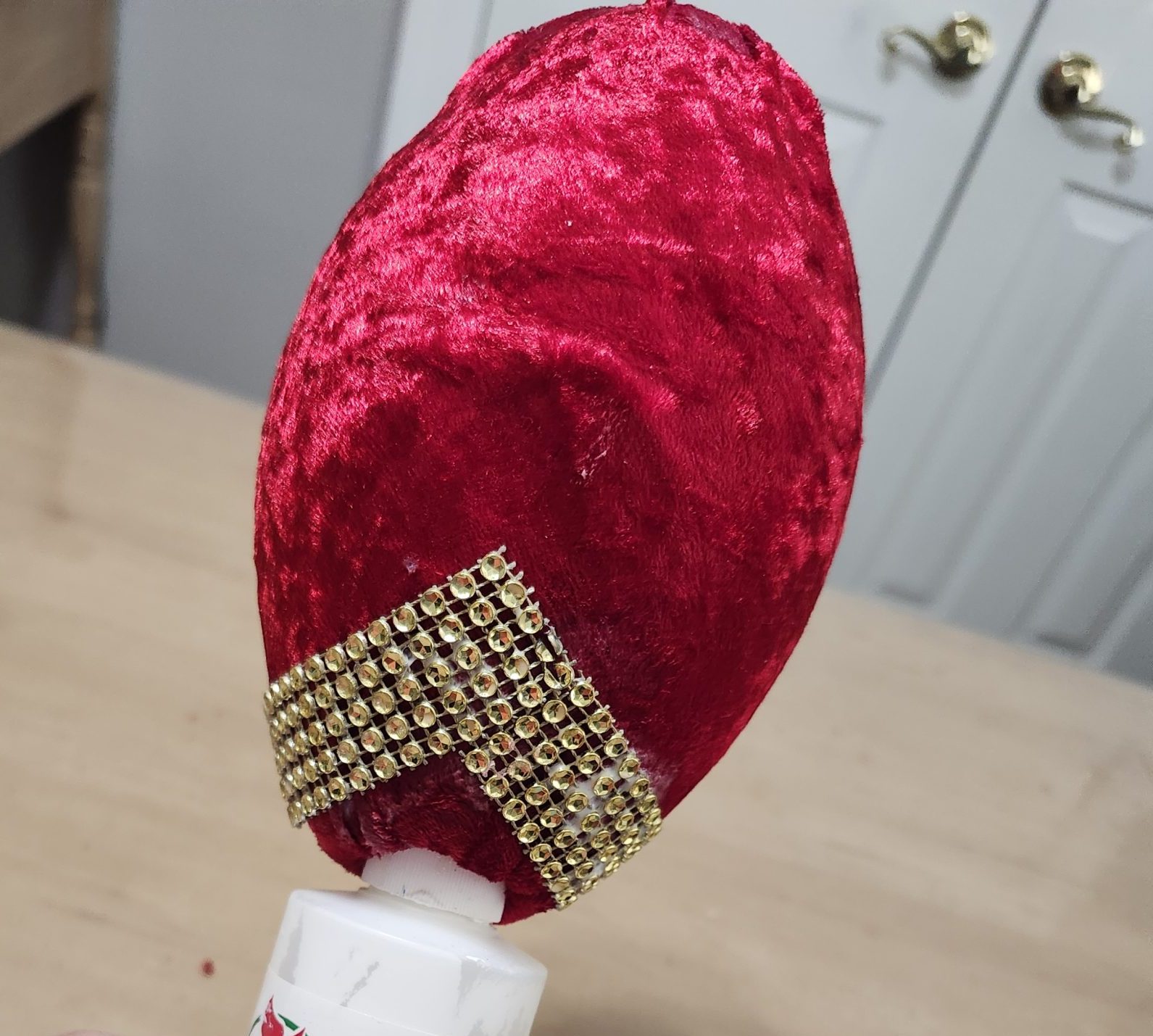 I used several materials to create his clothing. Black sequence for his shirt, red crush velvet for his coat with a pretty gold trim. The shoulders I covered the boxes with Dollar Tree’s gold glitter vinyl, added a fringe and more of the diamond wrap ribbon. I create a ruffle cuff out of the plaid material and gold trim detail with Dollar Tree gold glitter ribbon. For his belt, I used the black faux leather and a garment from a curtain I had, spray painted it gold.