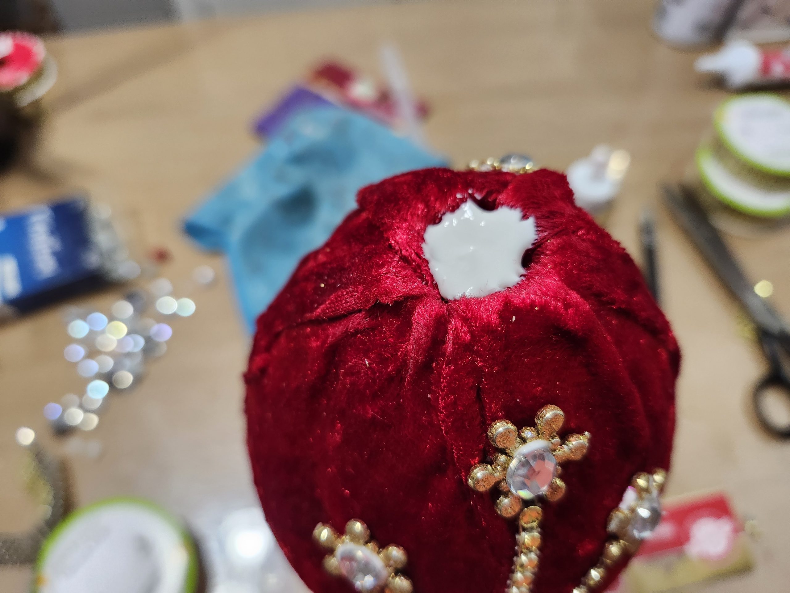 I wanted to give it a layer effect, so I added a Dollar Tree ornament on top by adding power grab into the top hole and placing the bottom of the ornament inside the glued hole.
