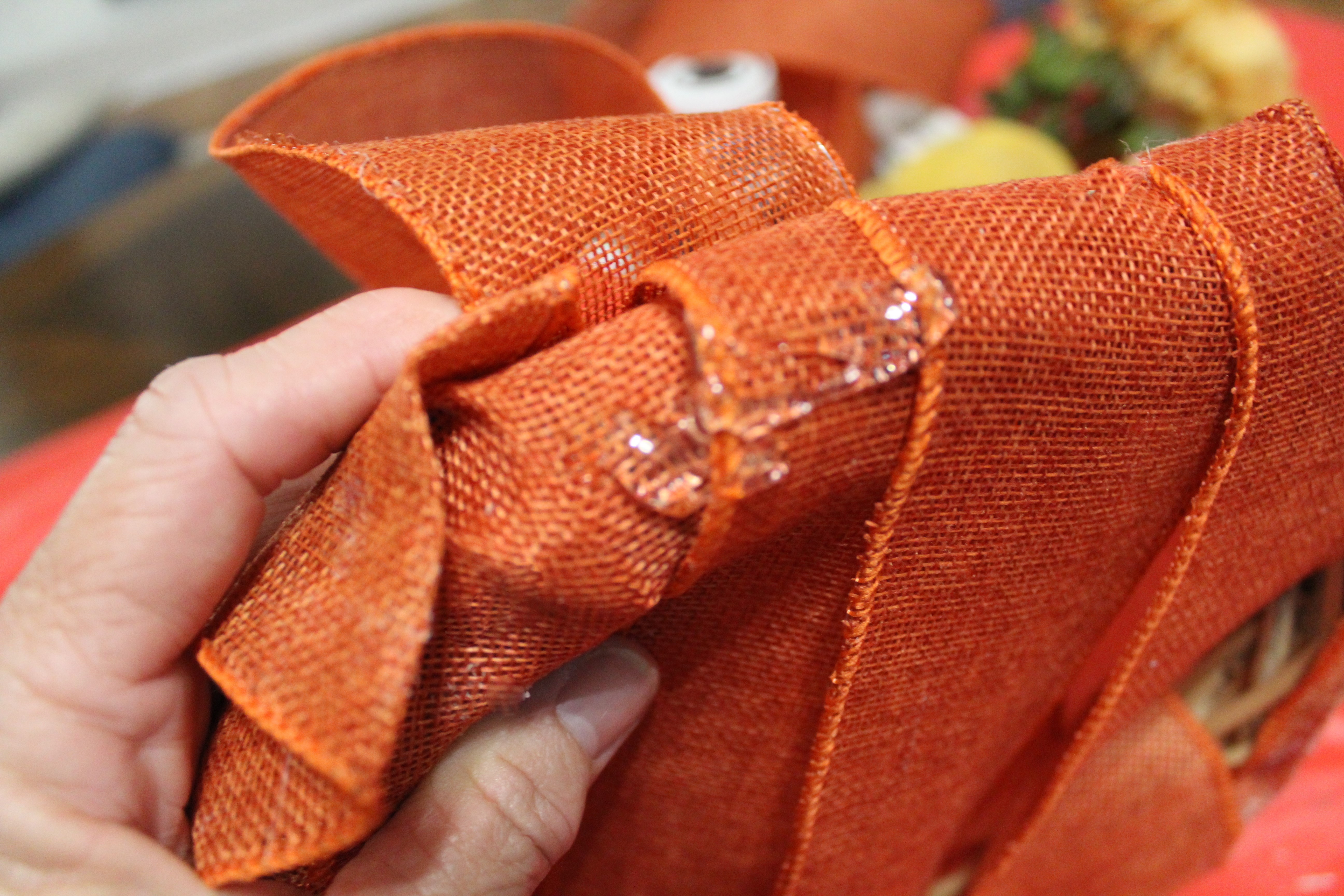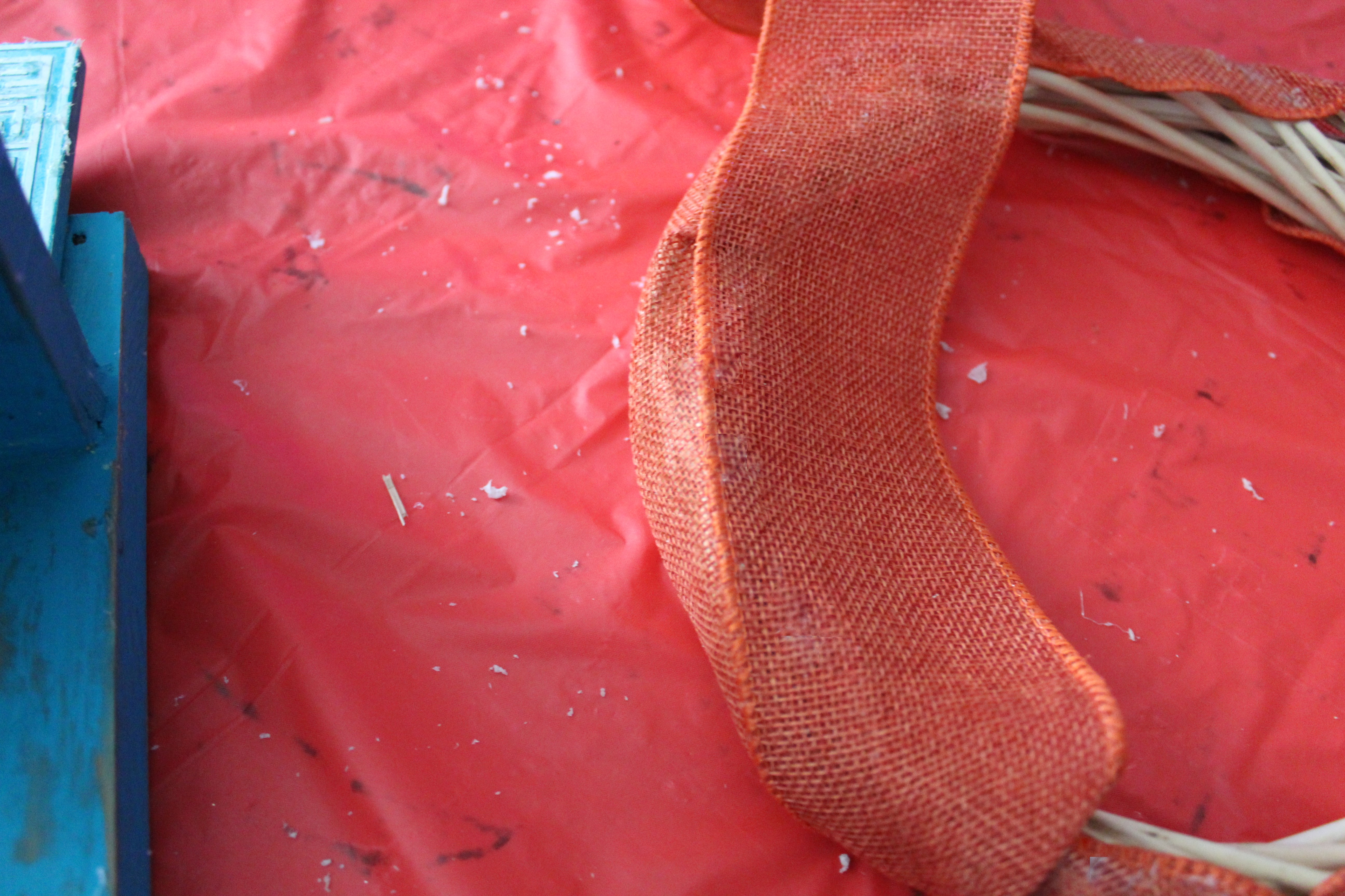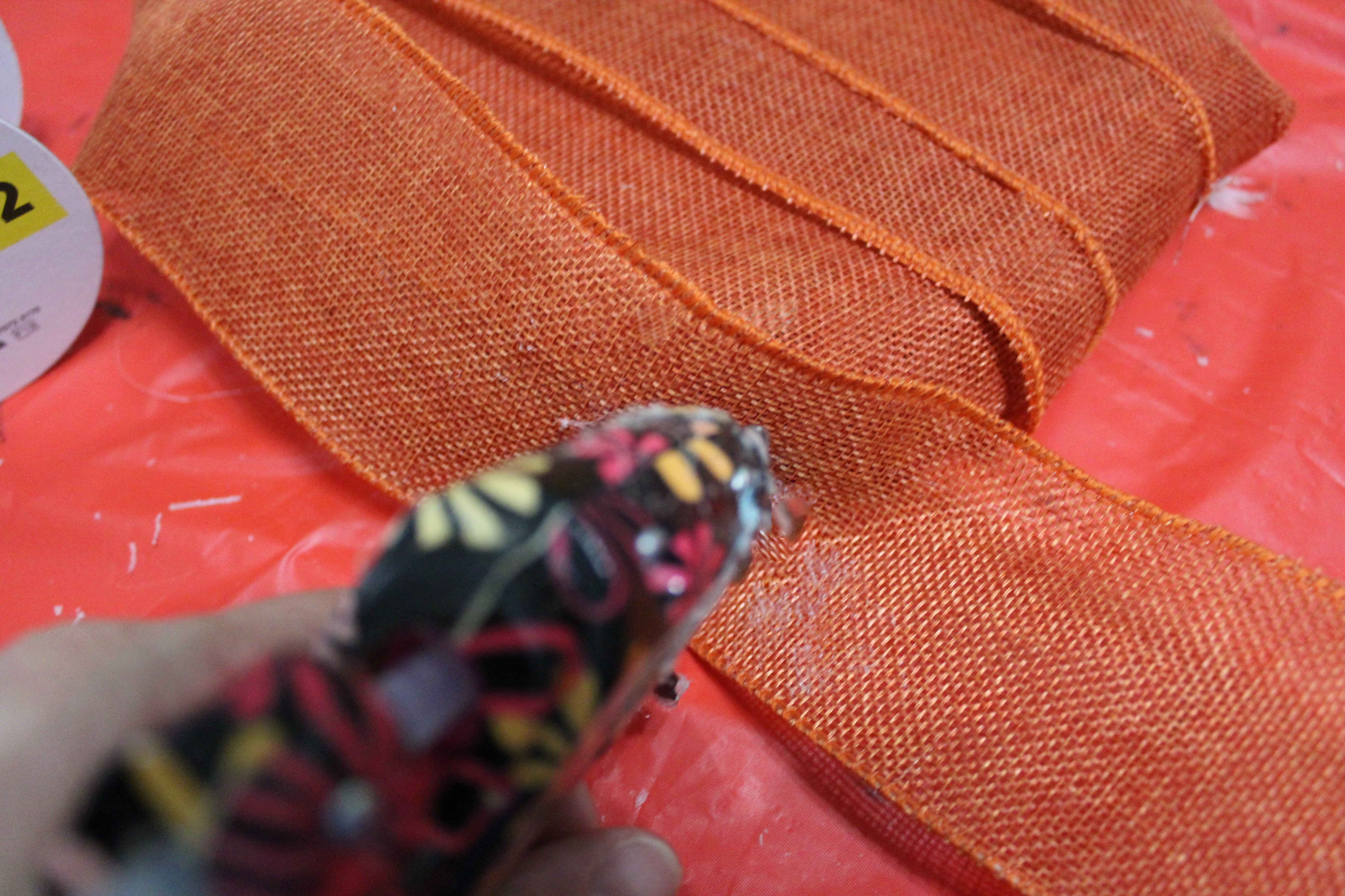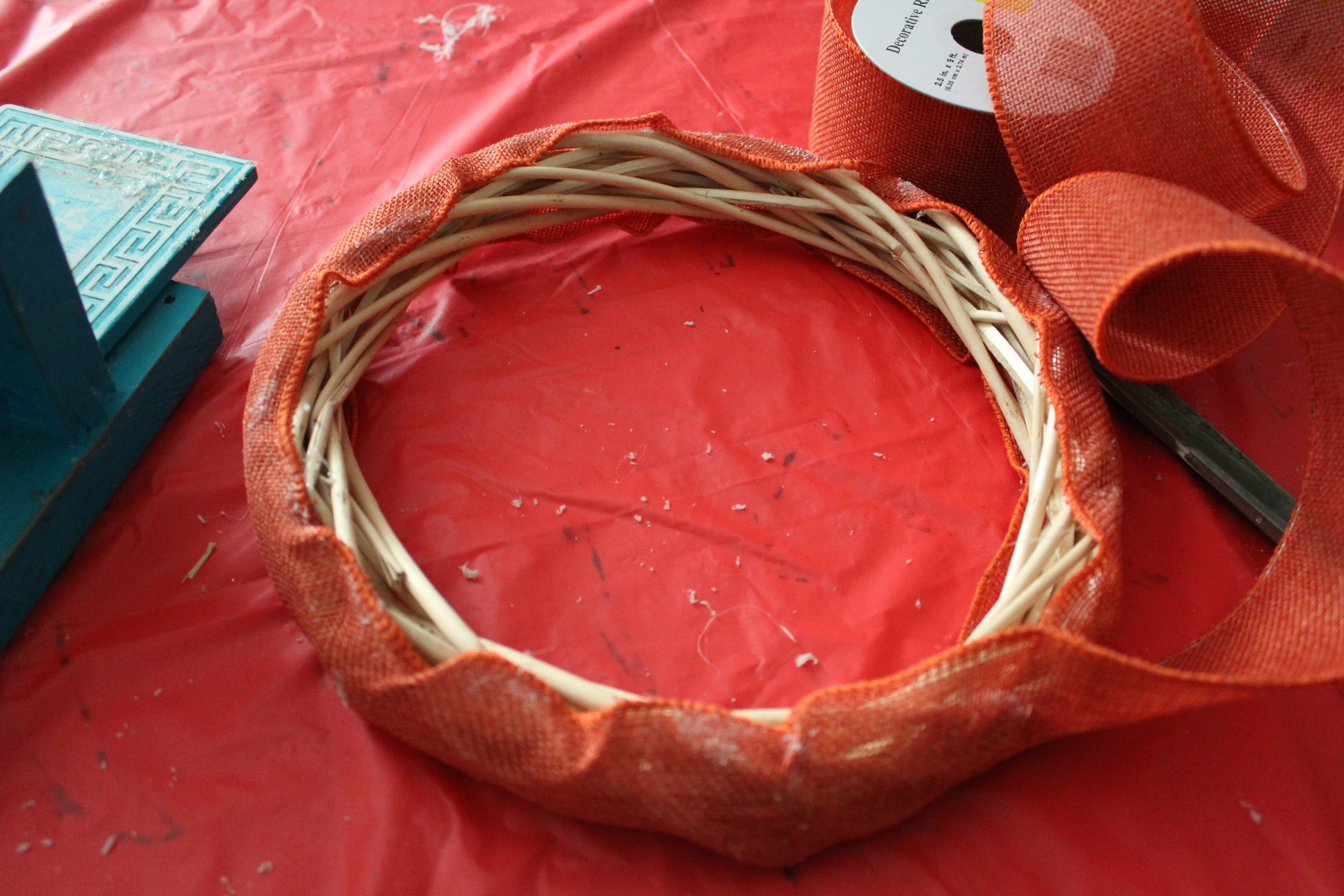 I took the orange ribbon and the wreath.  I hot glued the ribbon around the outer part of the wreath.