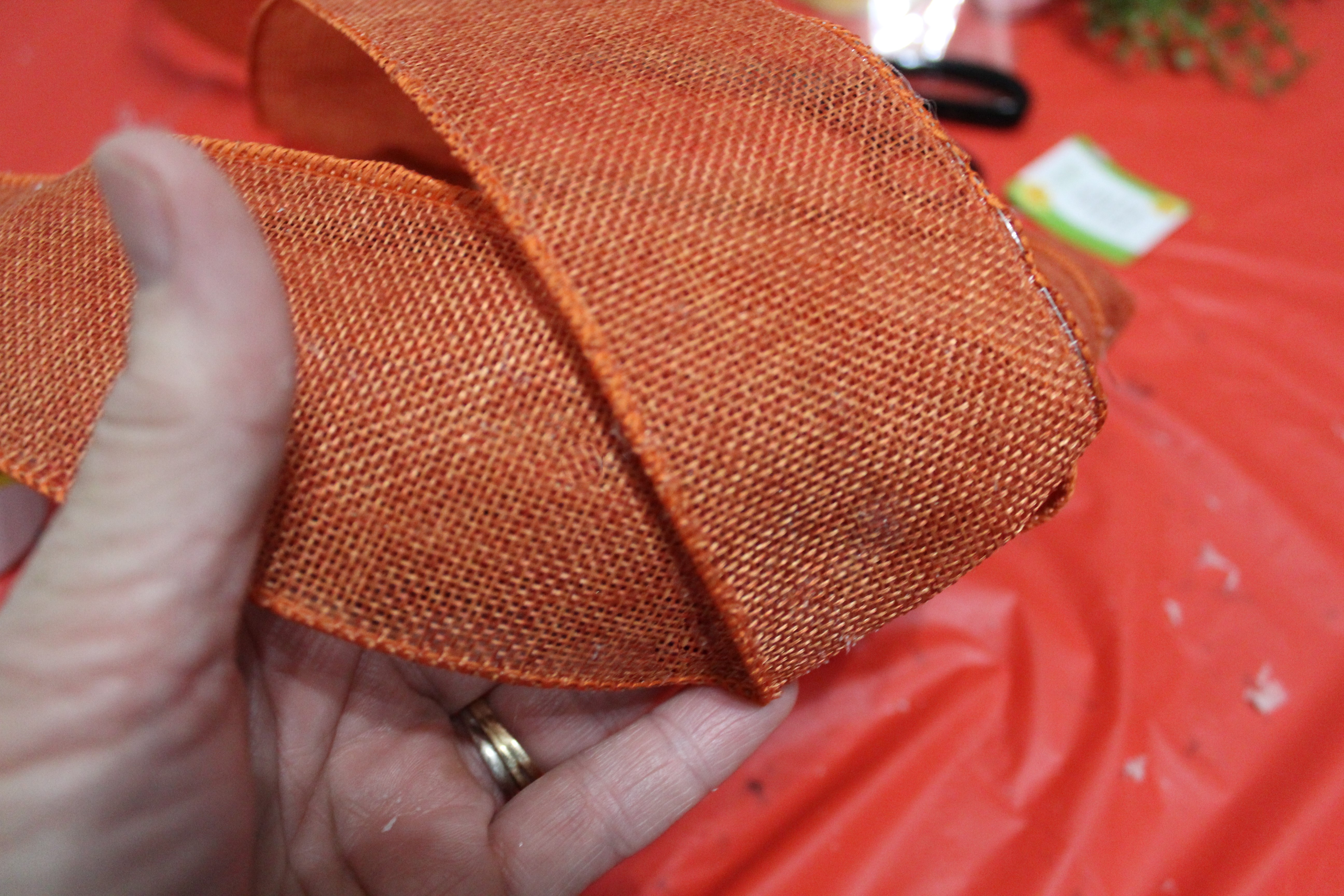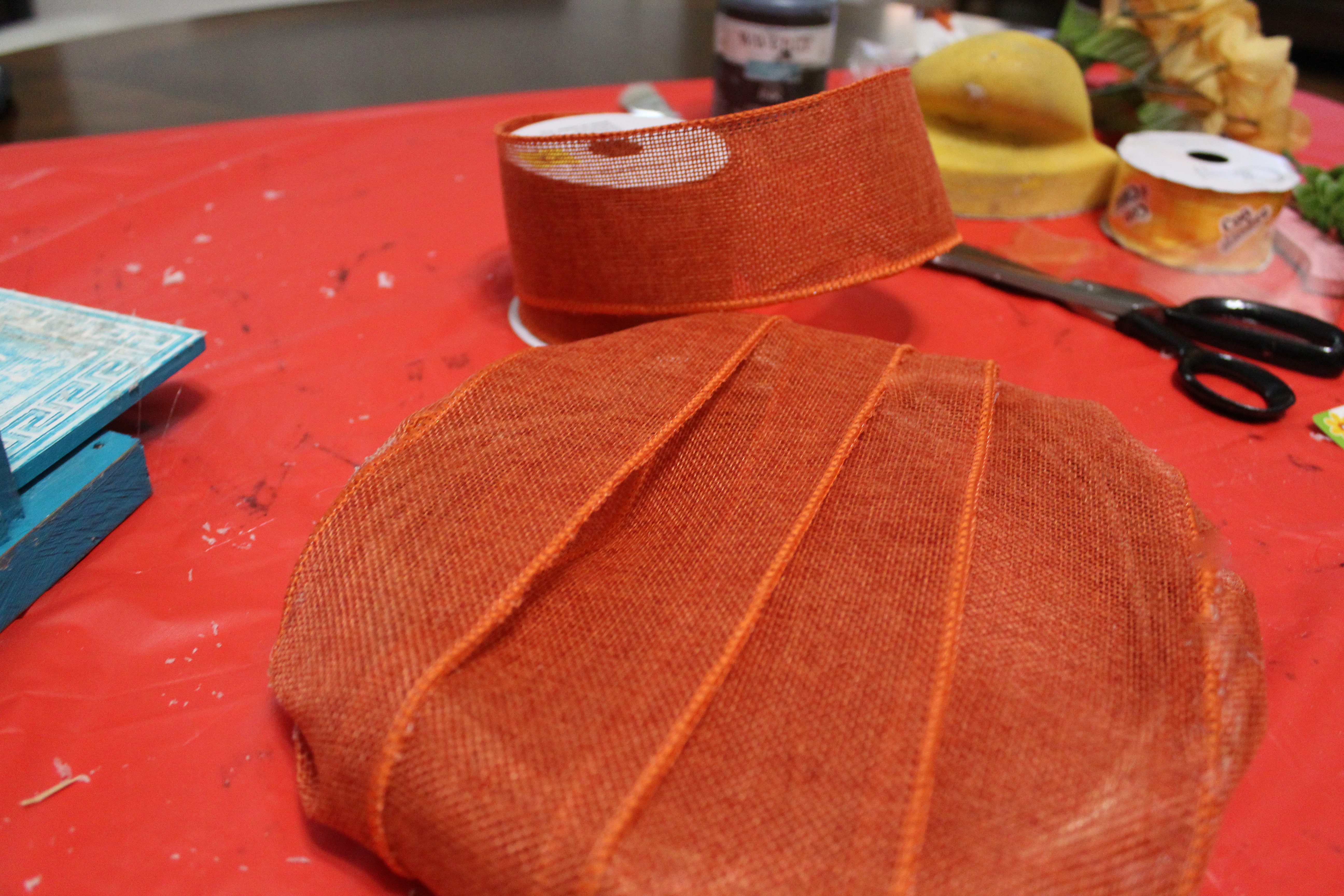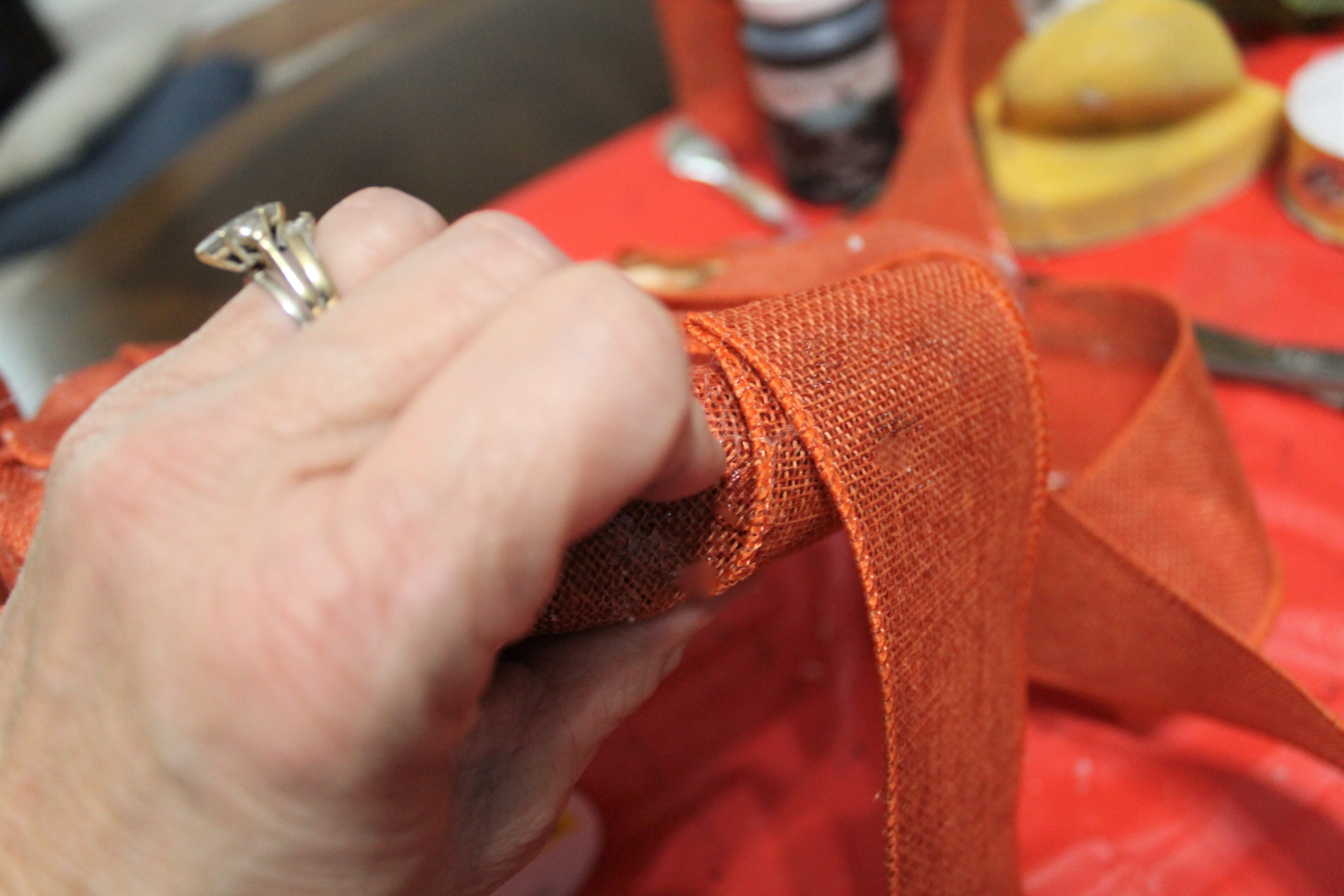 I took the orange ribbon and the wreath.  I hot glued the ribbon around the outer part of the wreath.