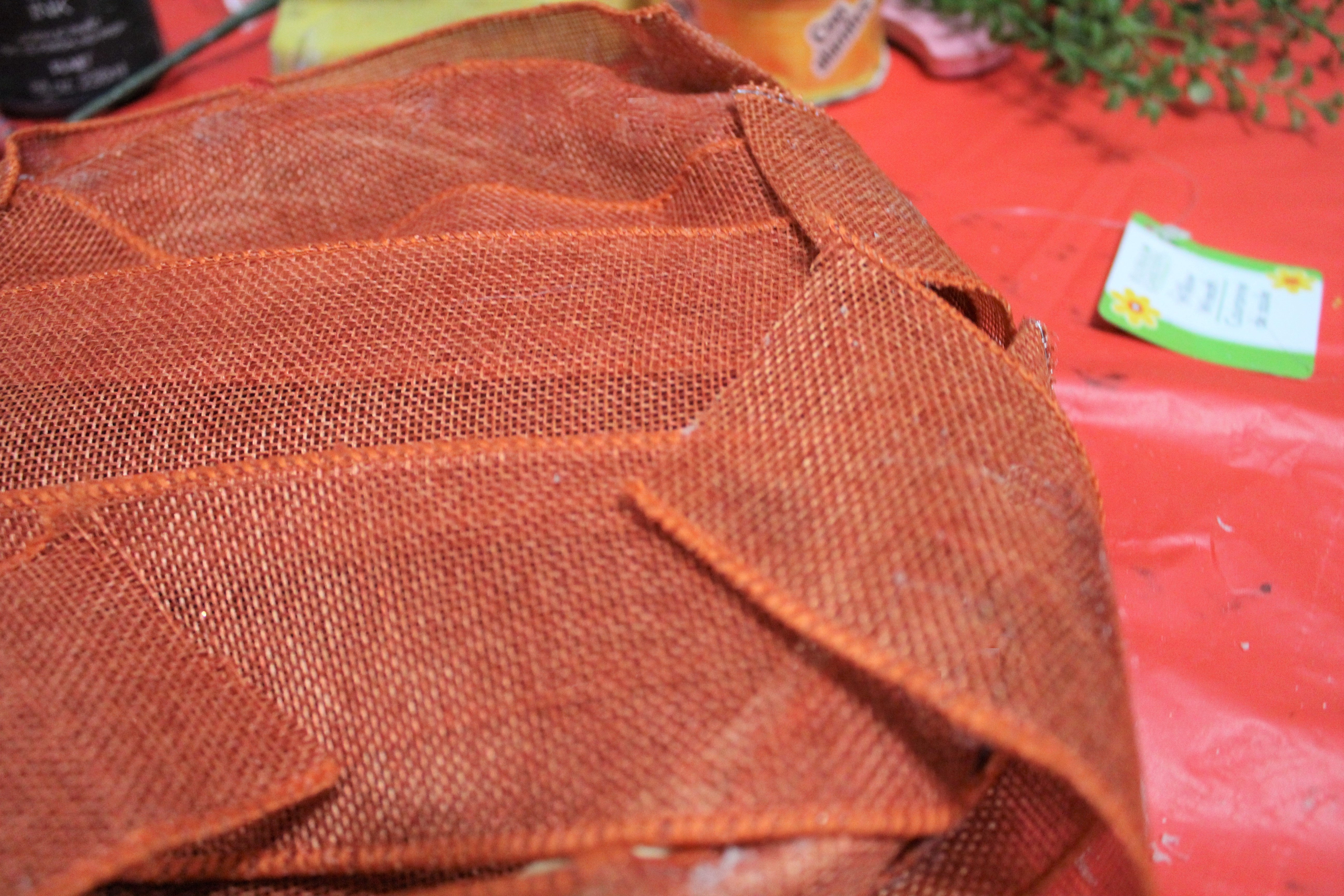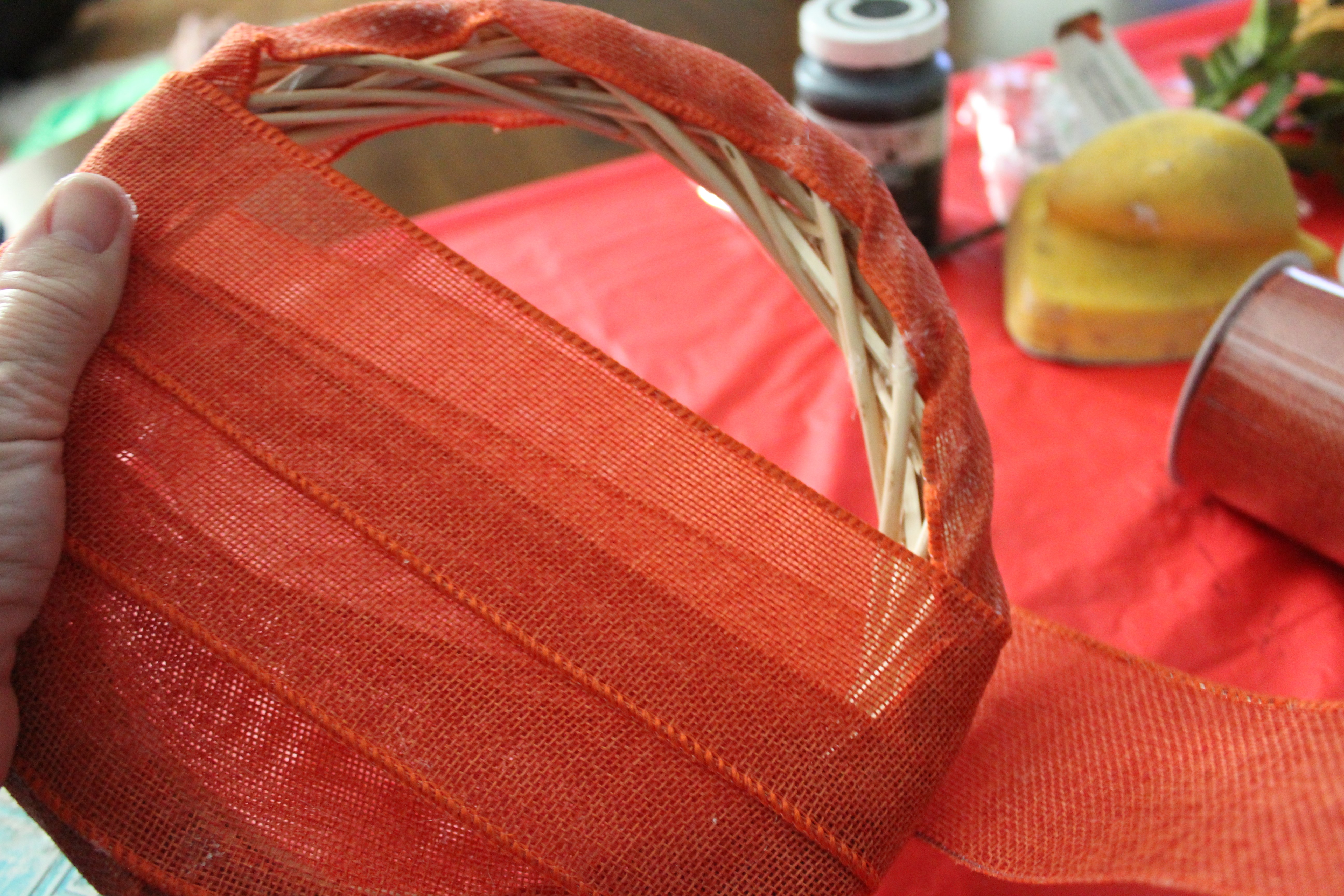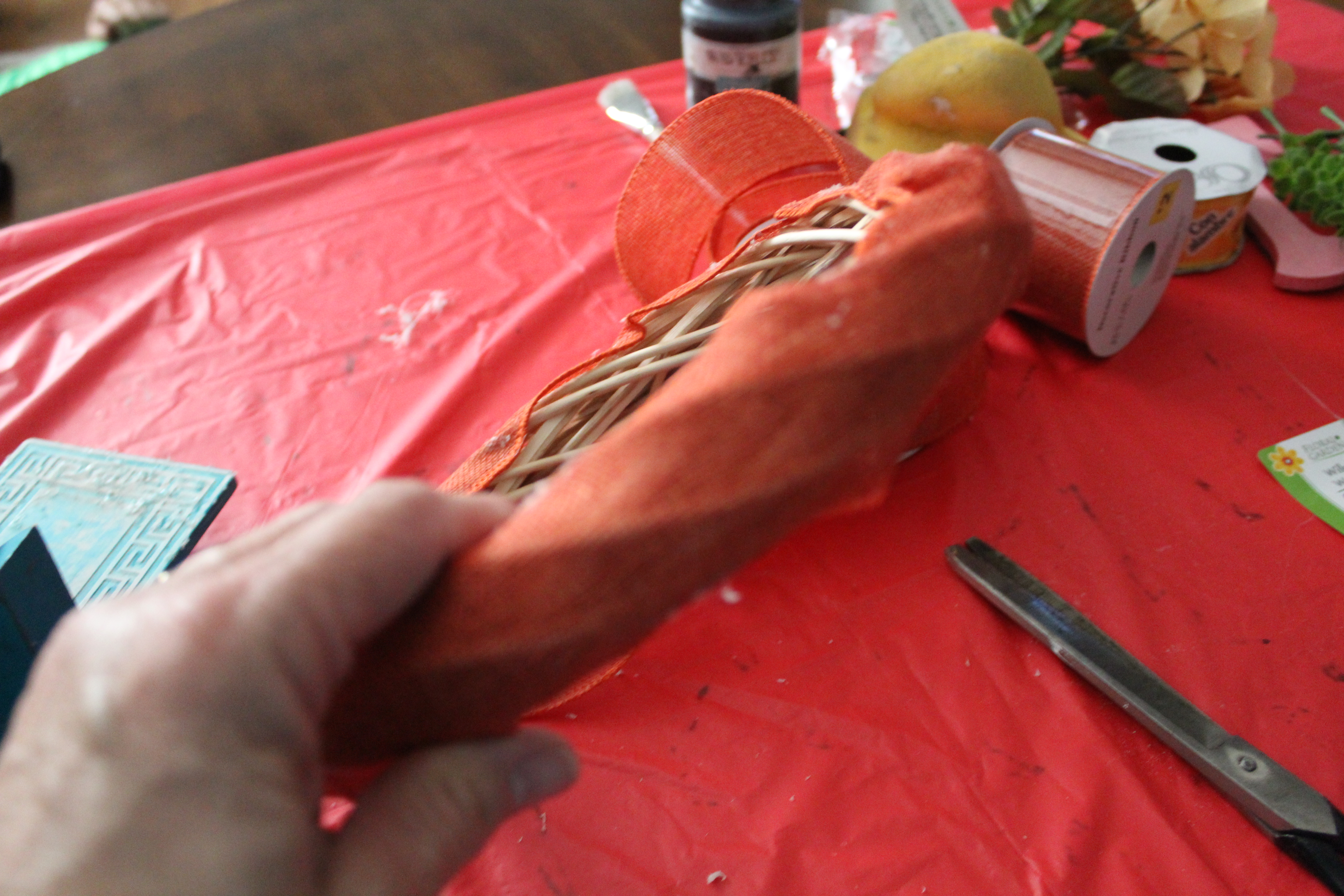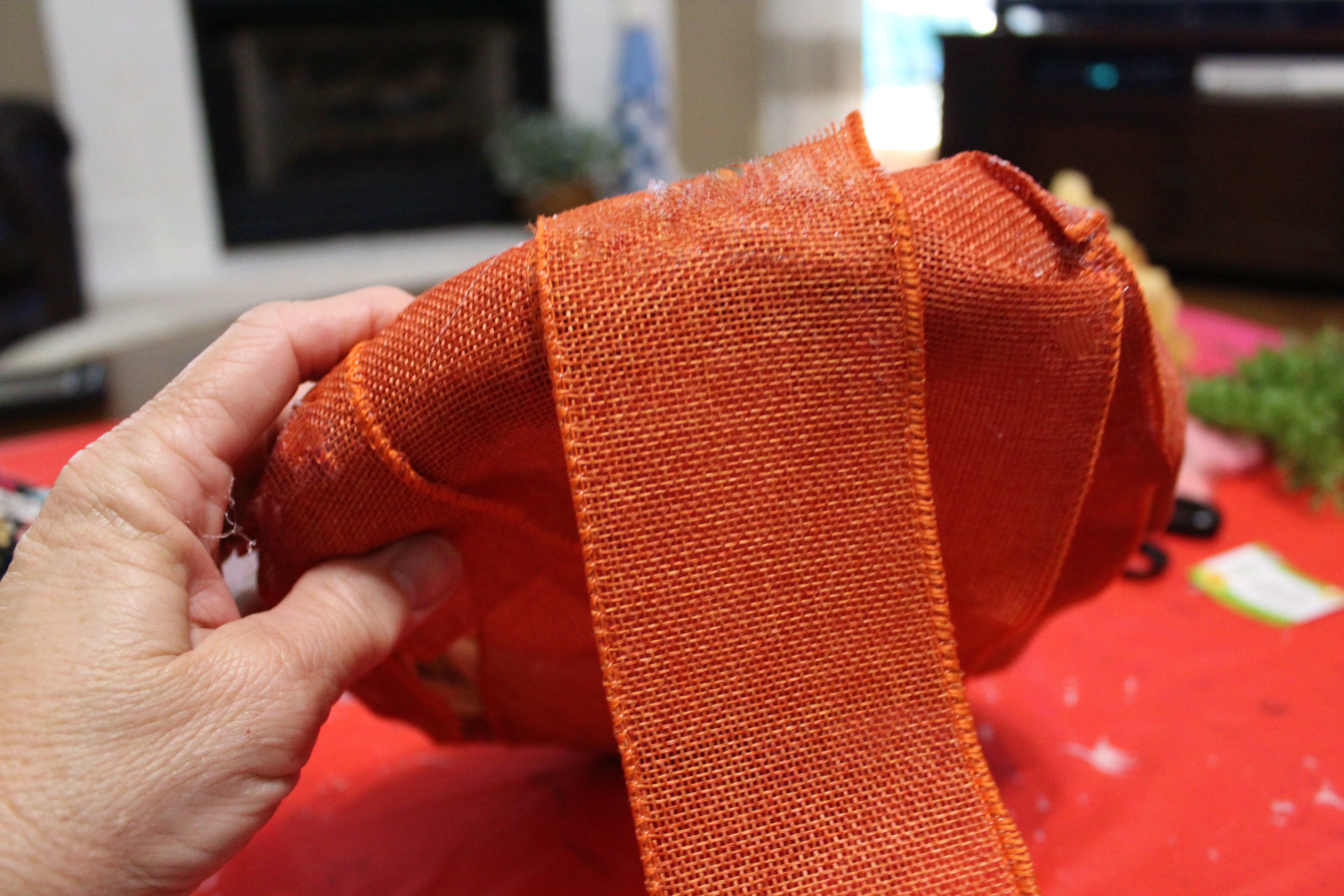 I took the orange ribbon and the wreath.  I hot glued the ribbon around the outer part of the wreath.