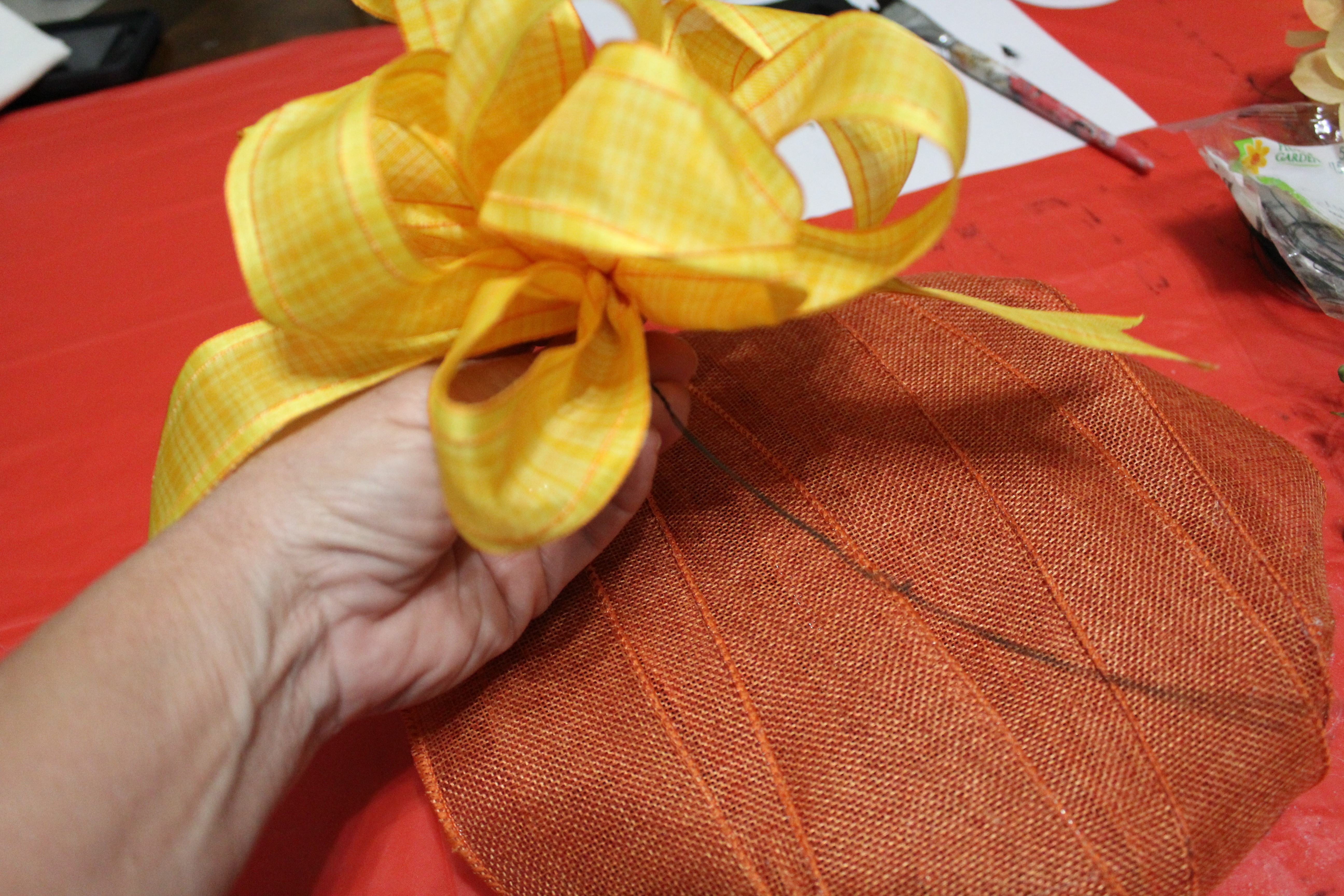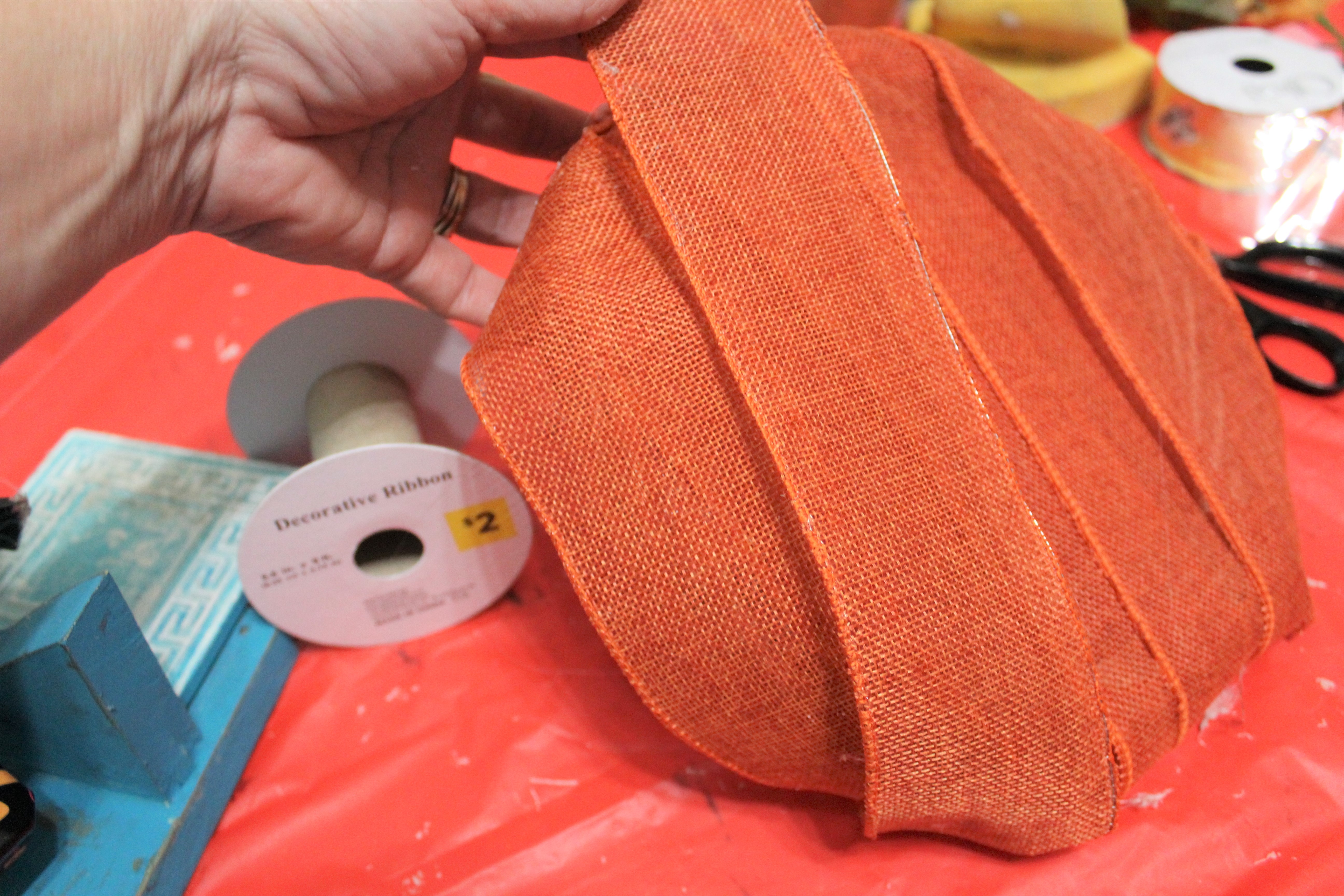 I did one more layer in the front.  I started on the top and folded over the ribbon with the hot glue at the bottom and back to the top continuing up and down until I covered the front of my wreath.  The more laps you make the more lines you create on your pumpkin design.