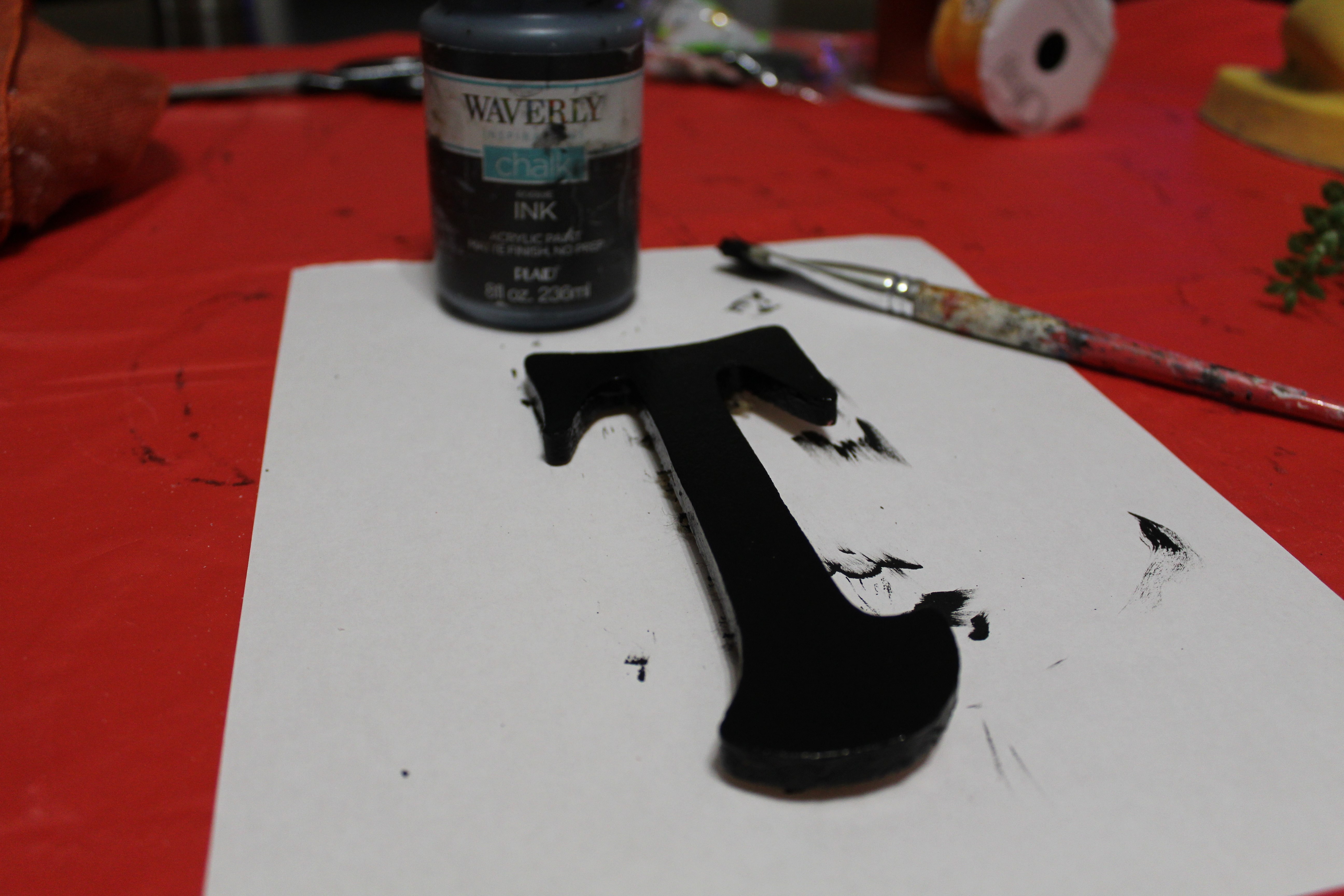 I had an old wooden monogram T,  I sanded off the glitter and painted it black with Ink chalk paint.