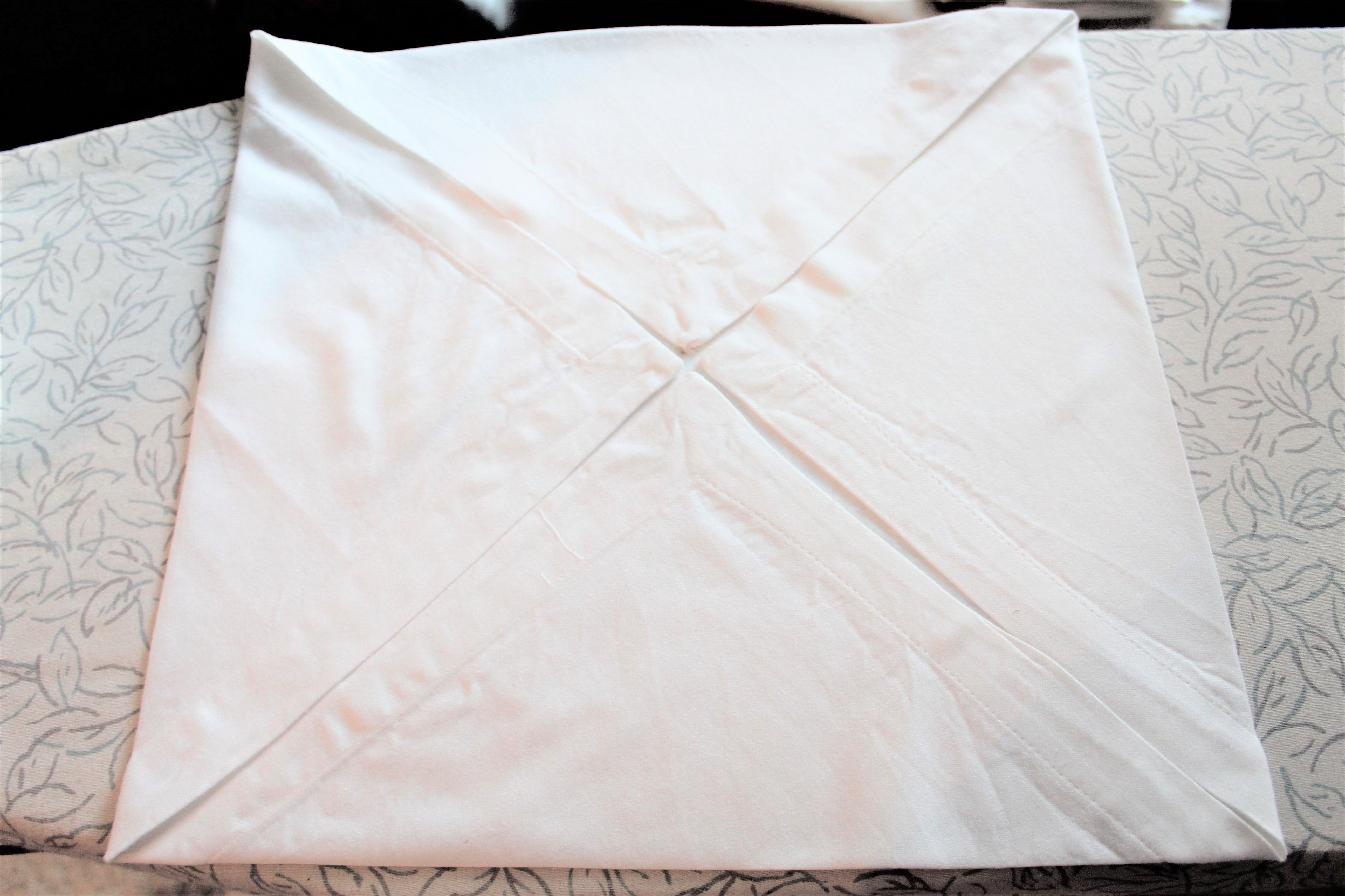 Take your napkin and lay it out flat. Taking all 4 corners meeting in the middle making 4 triangles. PRESS!