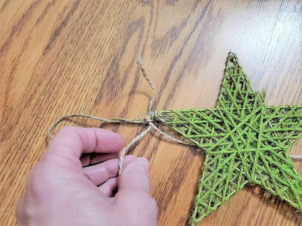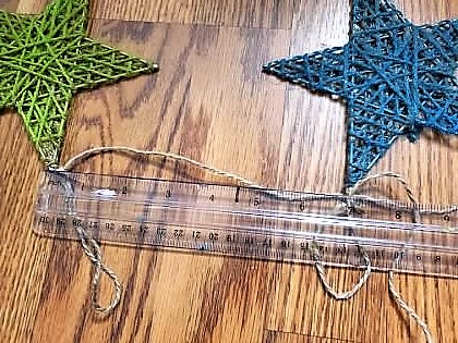 To tie the stars onto the twine I used the loop of the ornament, cut the loop and tied the ornament onto the twine. I spaced the ornaments 7 inches apart.