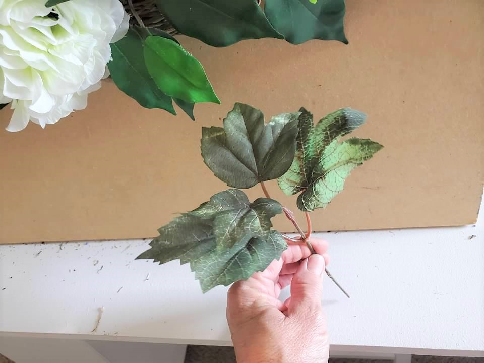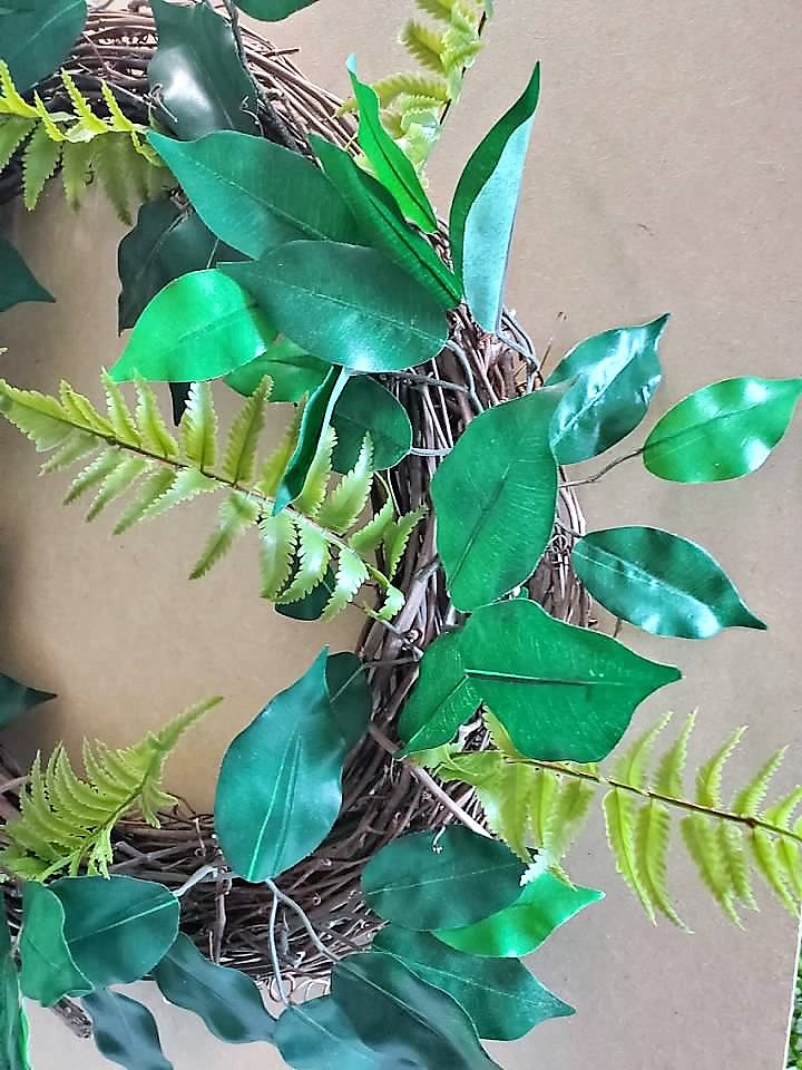 Here are a few of my favorite greenery stems I use for my grapevine wreaths.  Stems can be securely placed into the wreath where glue is not needed.