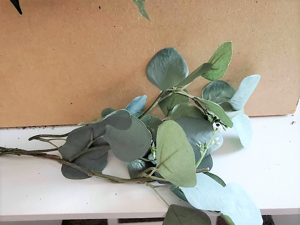 I like to add different textures and colors of greenery.  Adding boxwood stems, leaves and eucalyptus to the wreath.