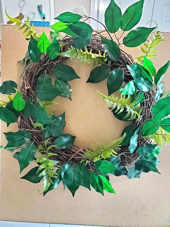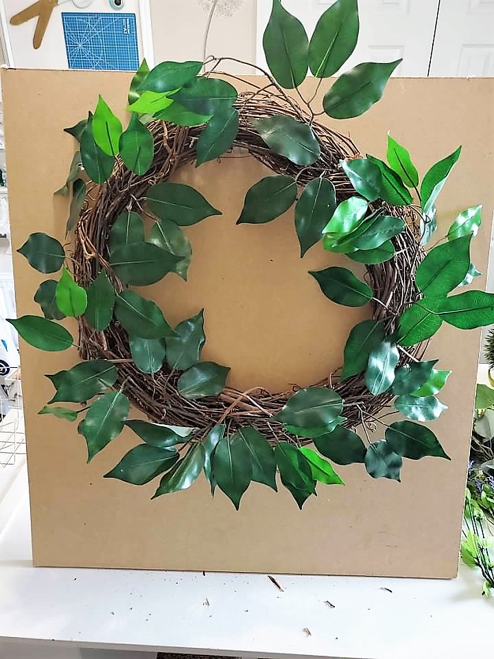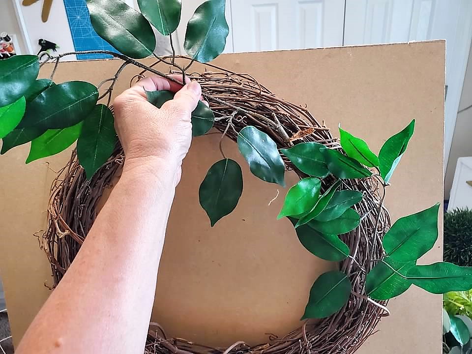 Start out with your grapevine wreath and the fiscus branches, sticking them in the wreath.