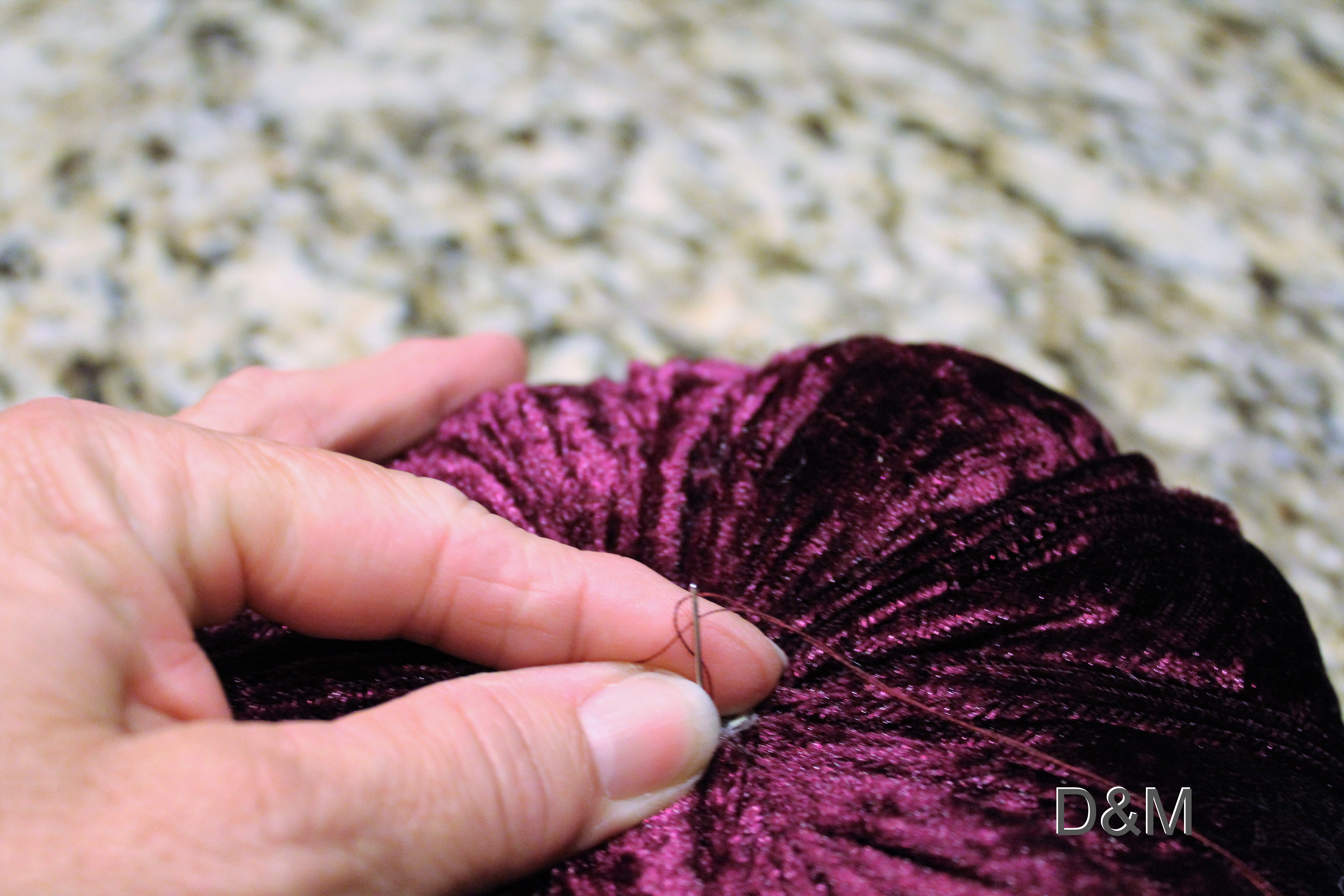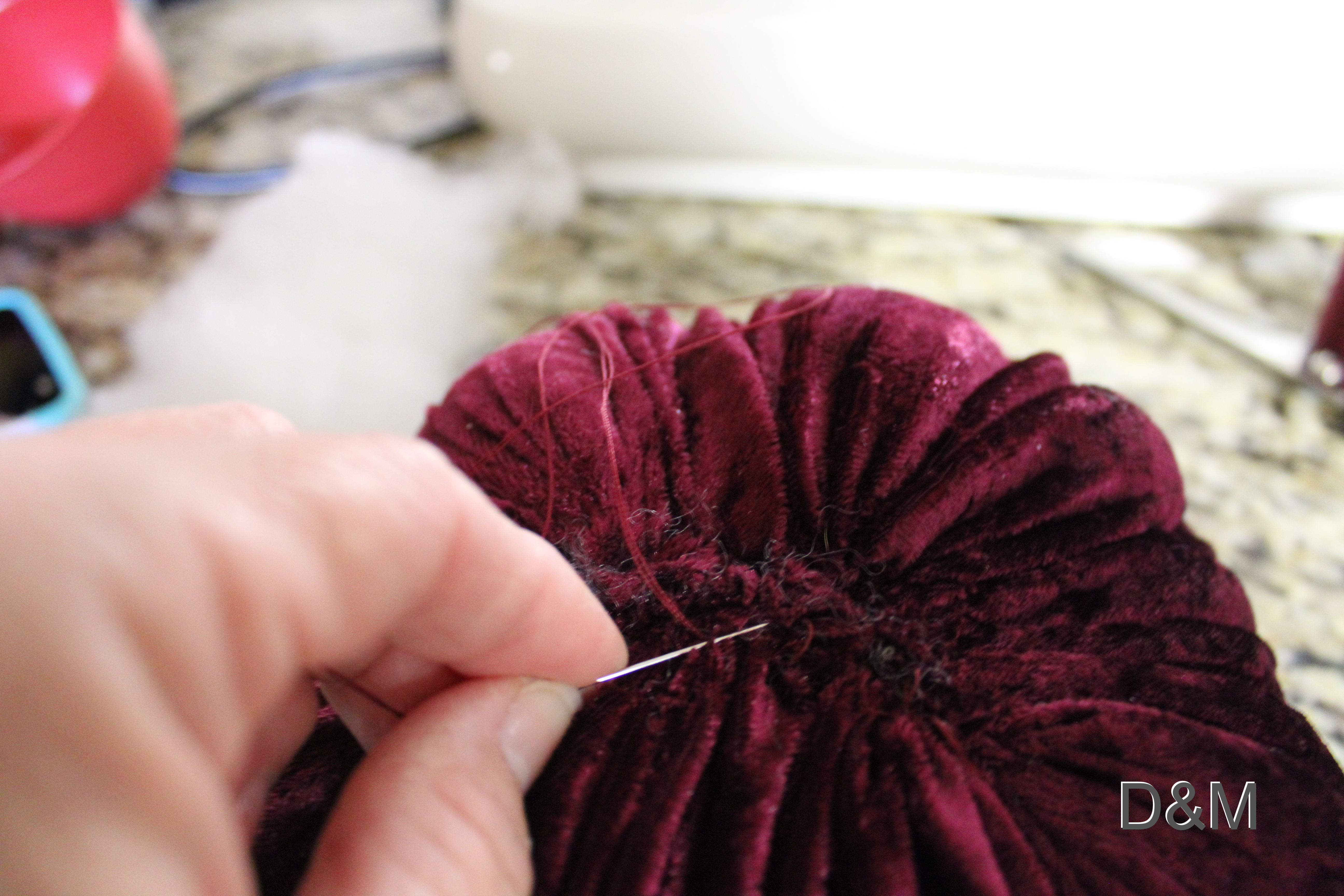 One last step….You might want to grab your thimble for this step.  Take your needle and place it in the center pushing all the way through your pumpkin until it pokes out the center bottom.  Pull it tight and pull it through the bottom up through the top.  Do this step a couple times.