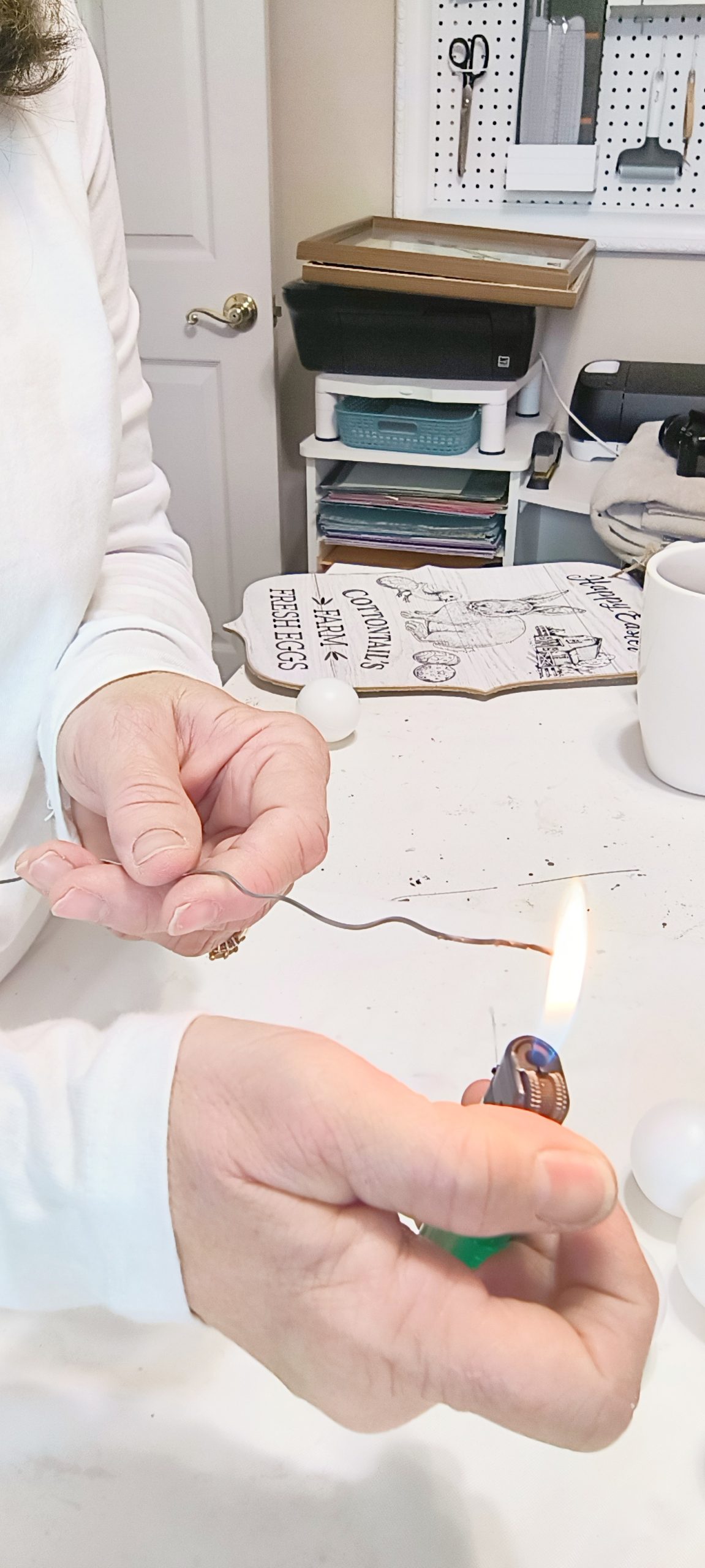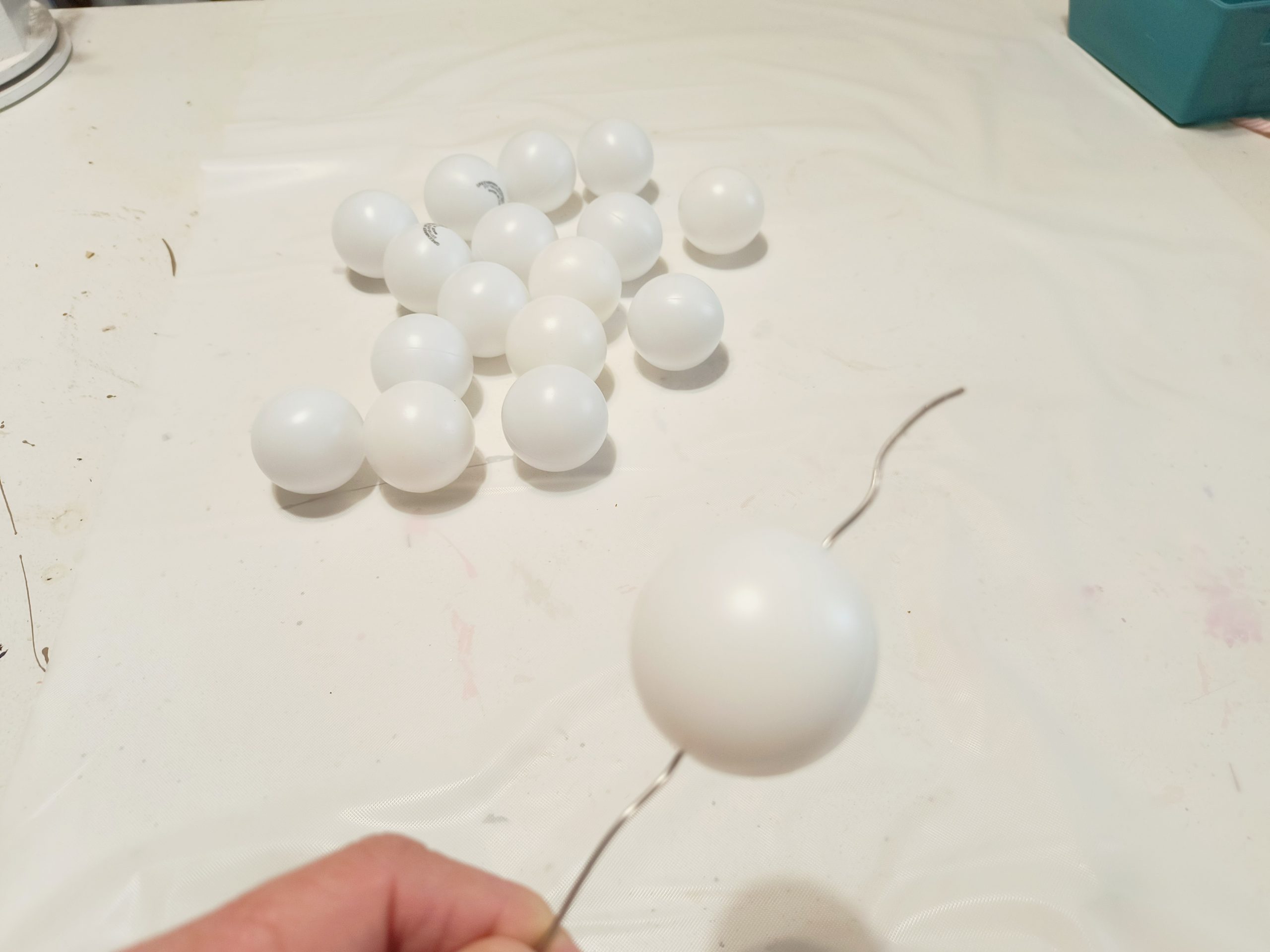 2.  String your ping pong balls on the wire, using a lighter heat up the end of the wire.  ( I kept the flame on the end of the wire for 10 seconds).  This allows the wire to go easily through the ping pong ball.