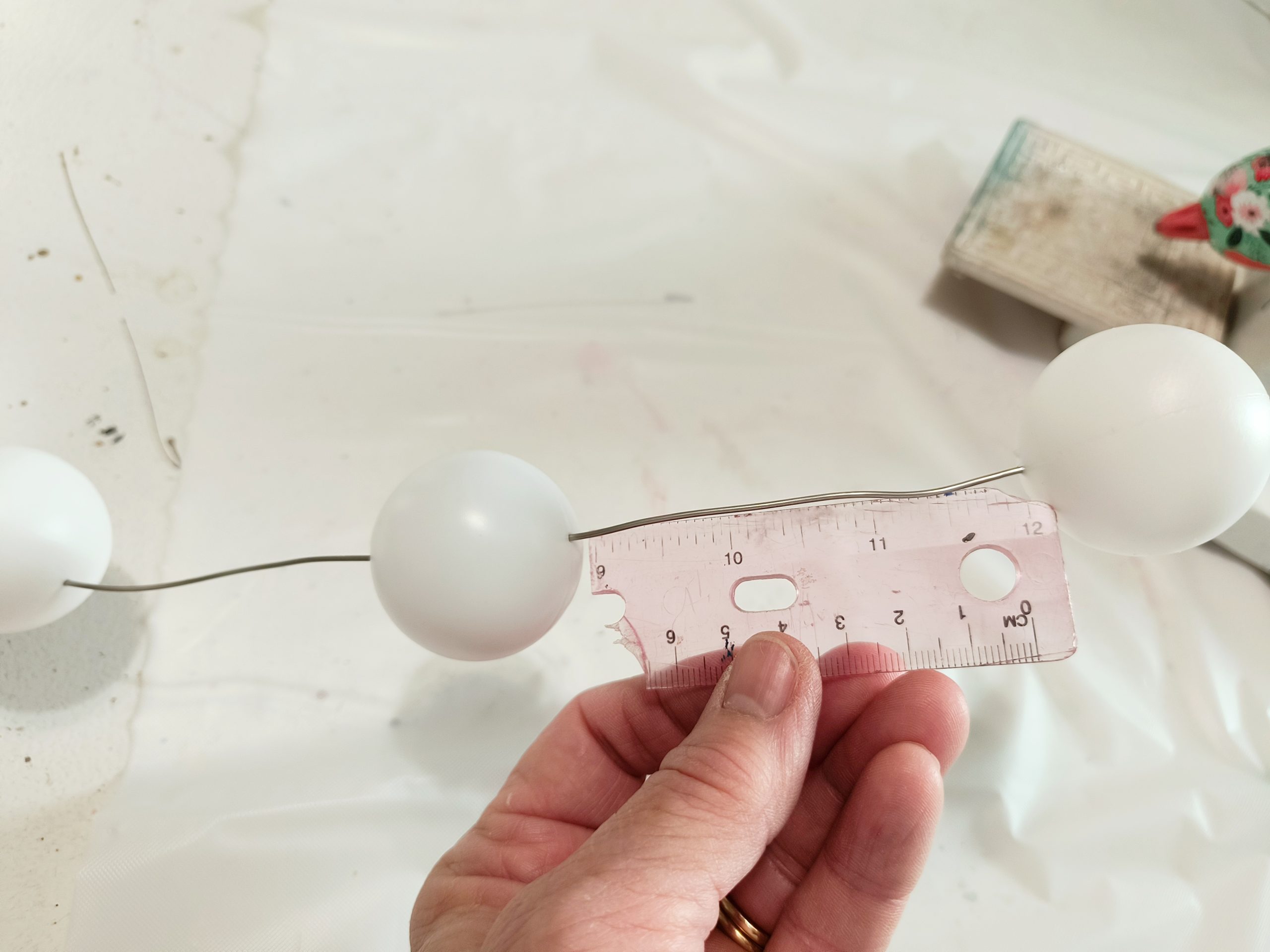 3.  Secure ping pong ball in place.  I measured out 2.5 inches between each ball, used hot glue at each hole of the ball.