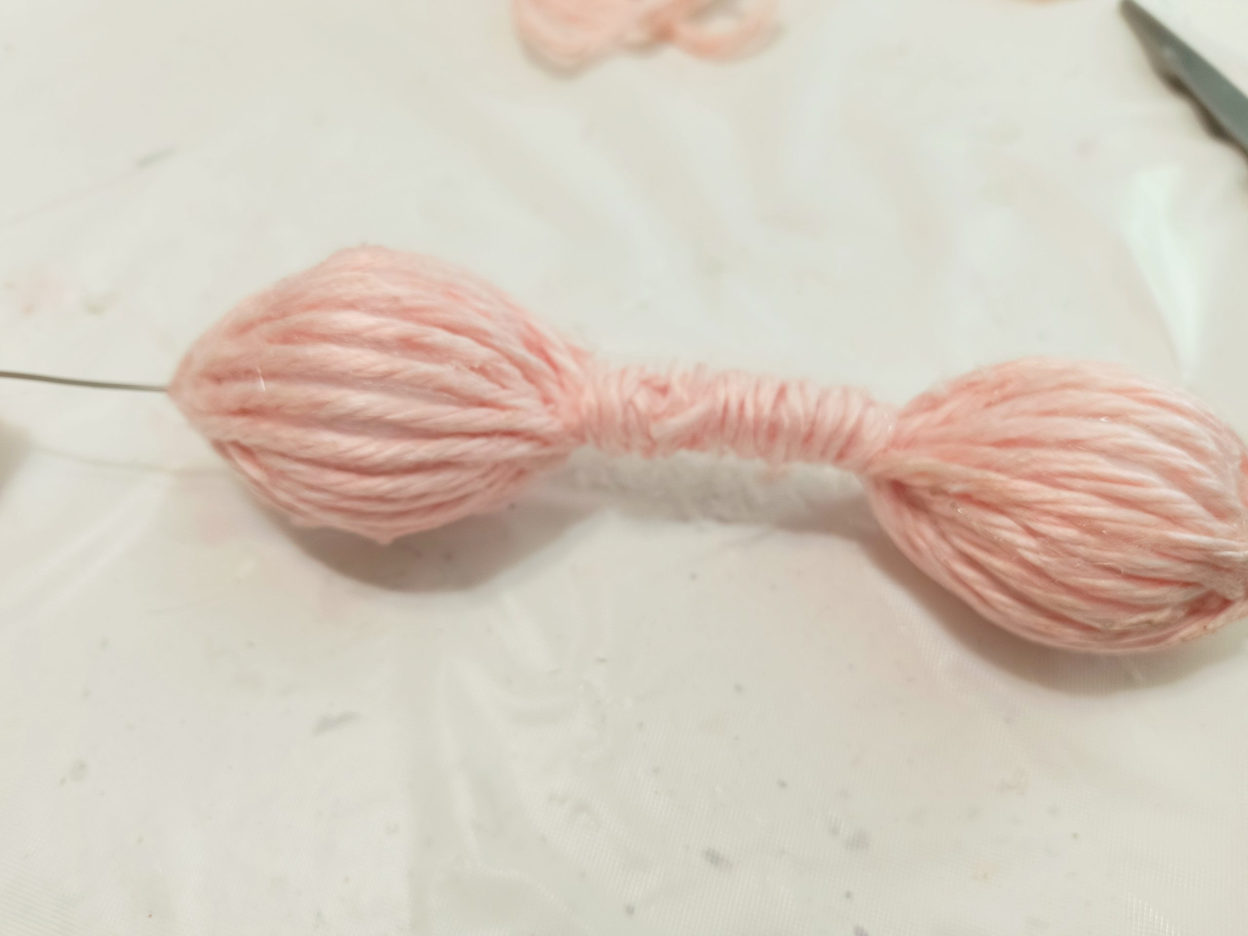 I made two tassels with both the yarn and butcher’s twine, tied it on at the loop.