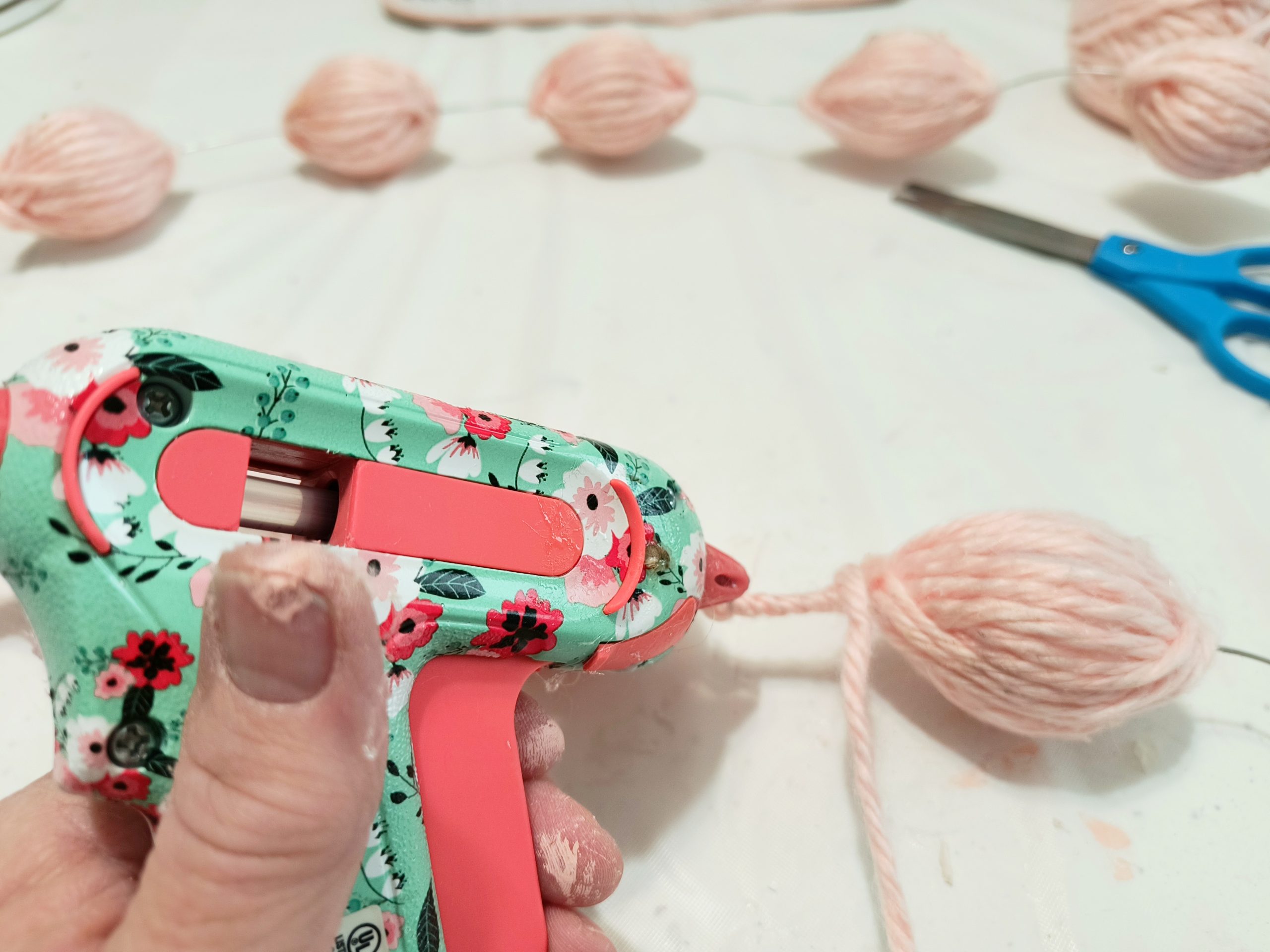 • Wrap the yarn around the wire with hot glue at every layer of yarn.