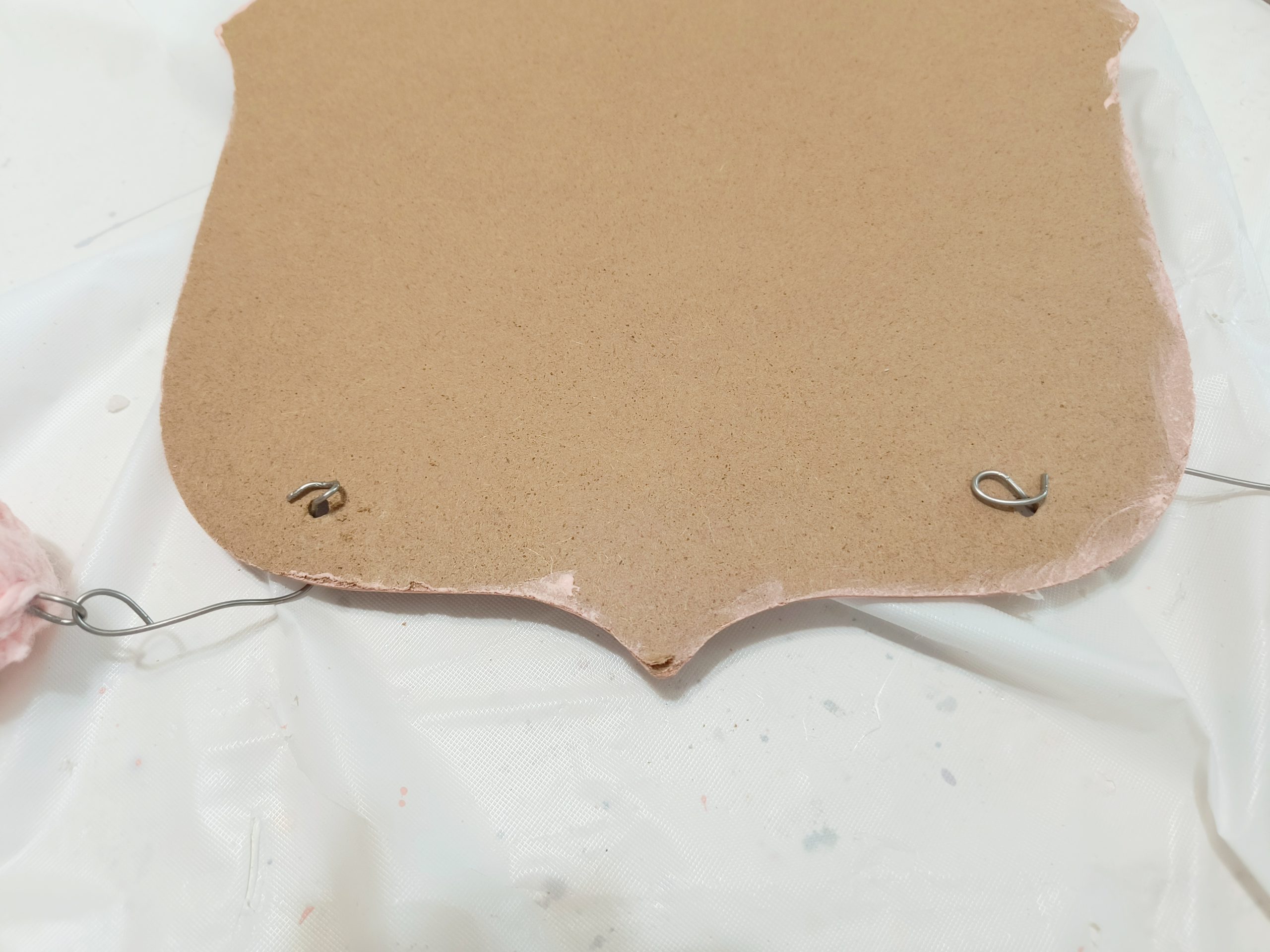 7.  Attach each end of the garland to the Dollar Tree sign.  Place the wire through the drilled hole, curl the end to prevest from slipping out of the holes.