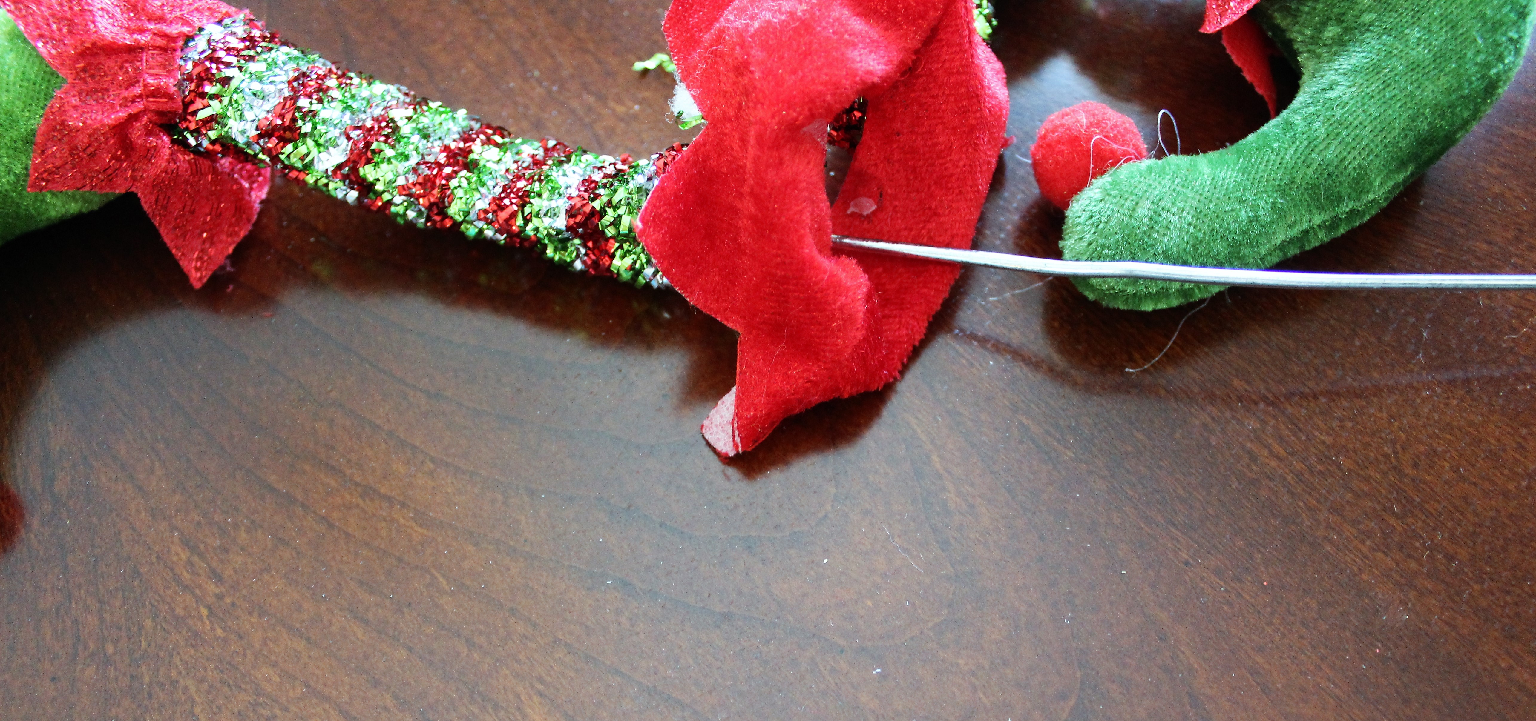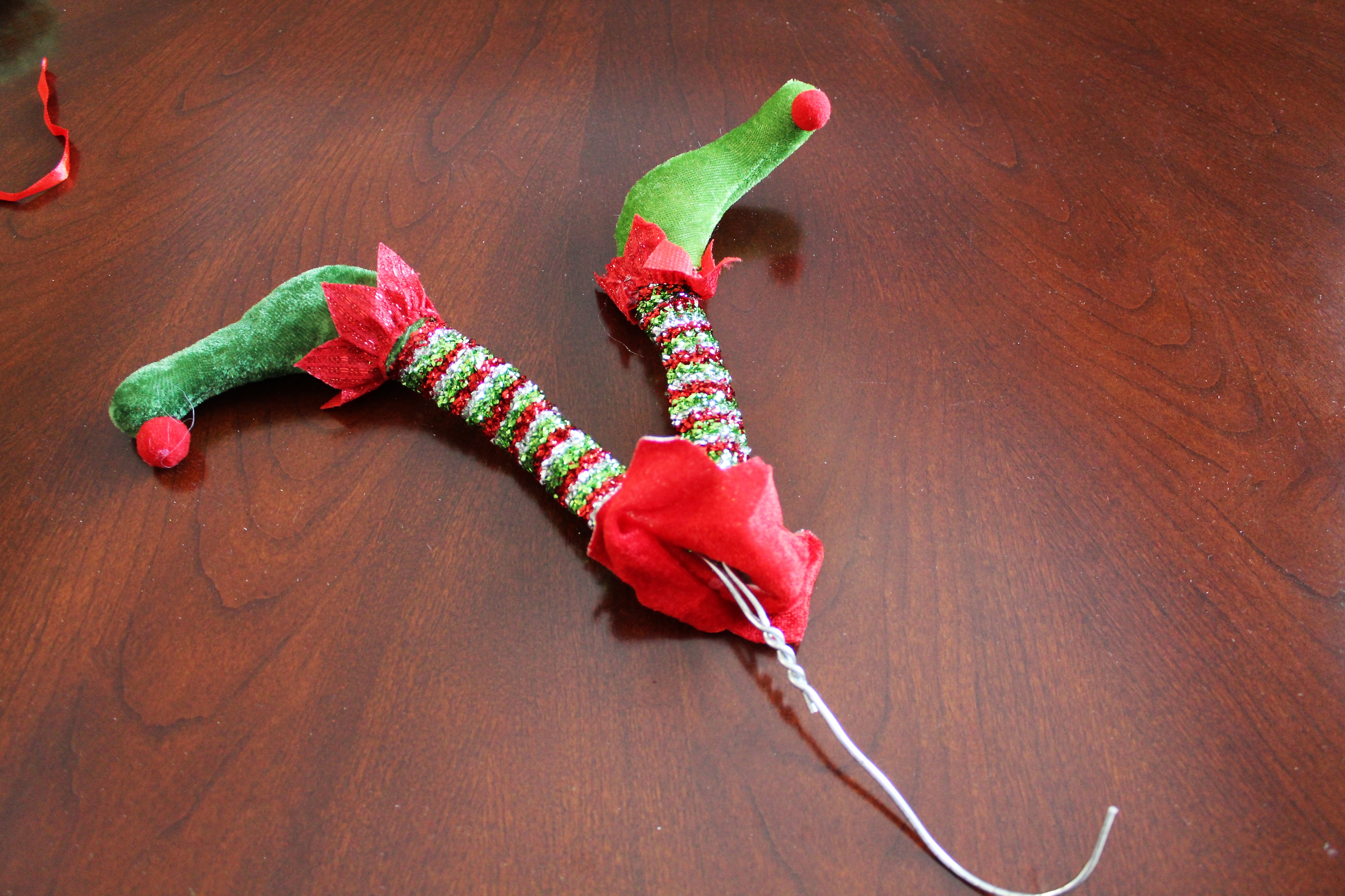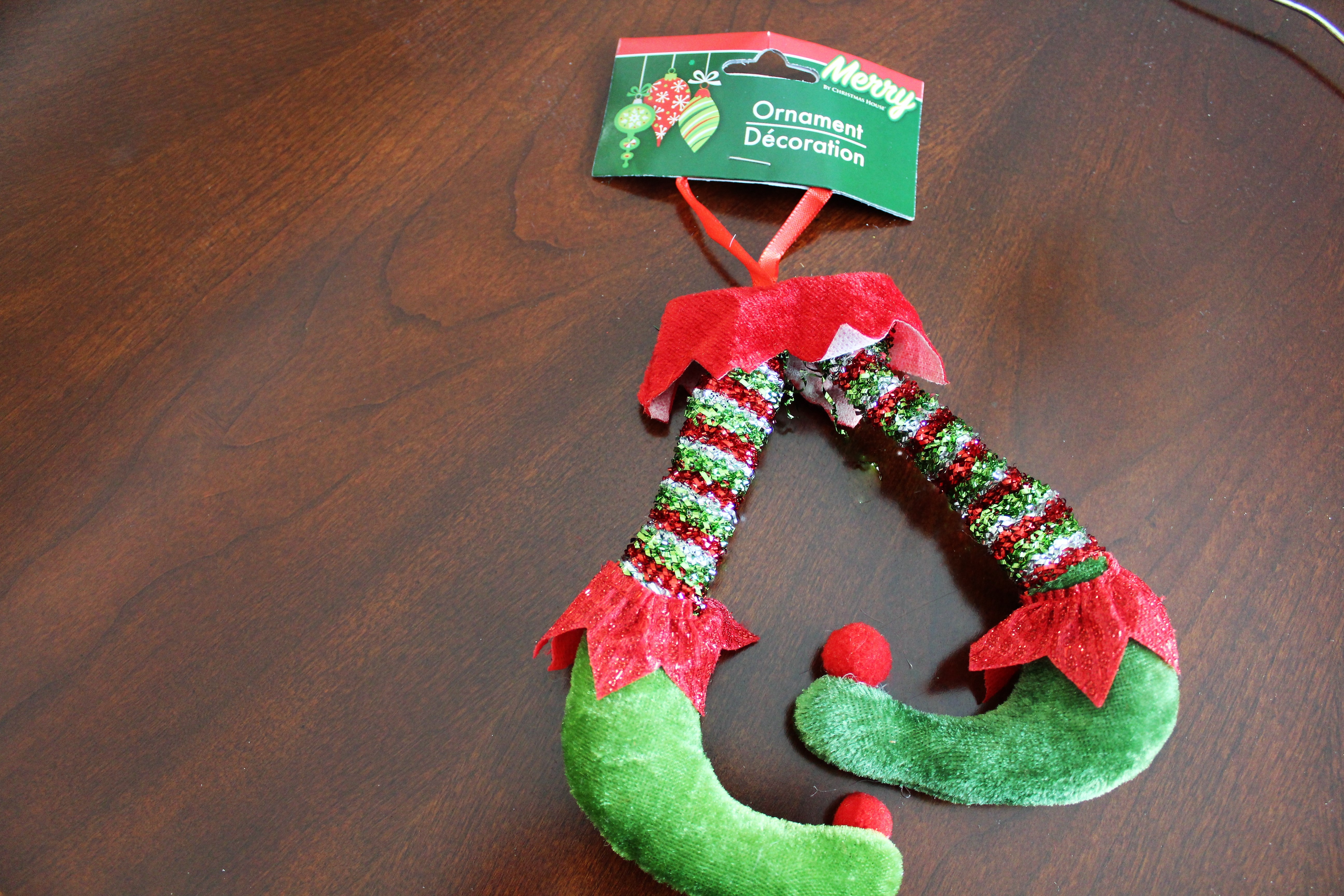 While walking through the Dollar Tree the other day I saw little elf feet ornaments. I had an idea to make a fun ornament with it. So I bought a couple, brought them home and put my own spin on them.