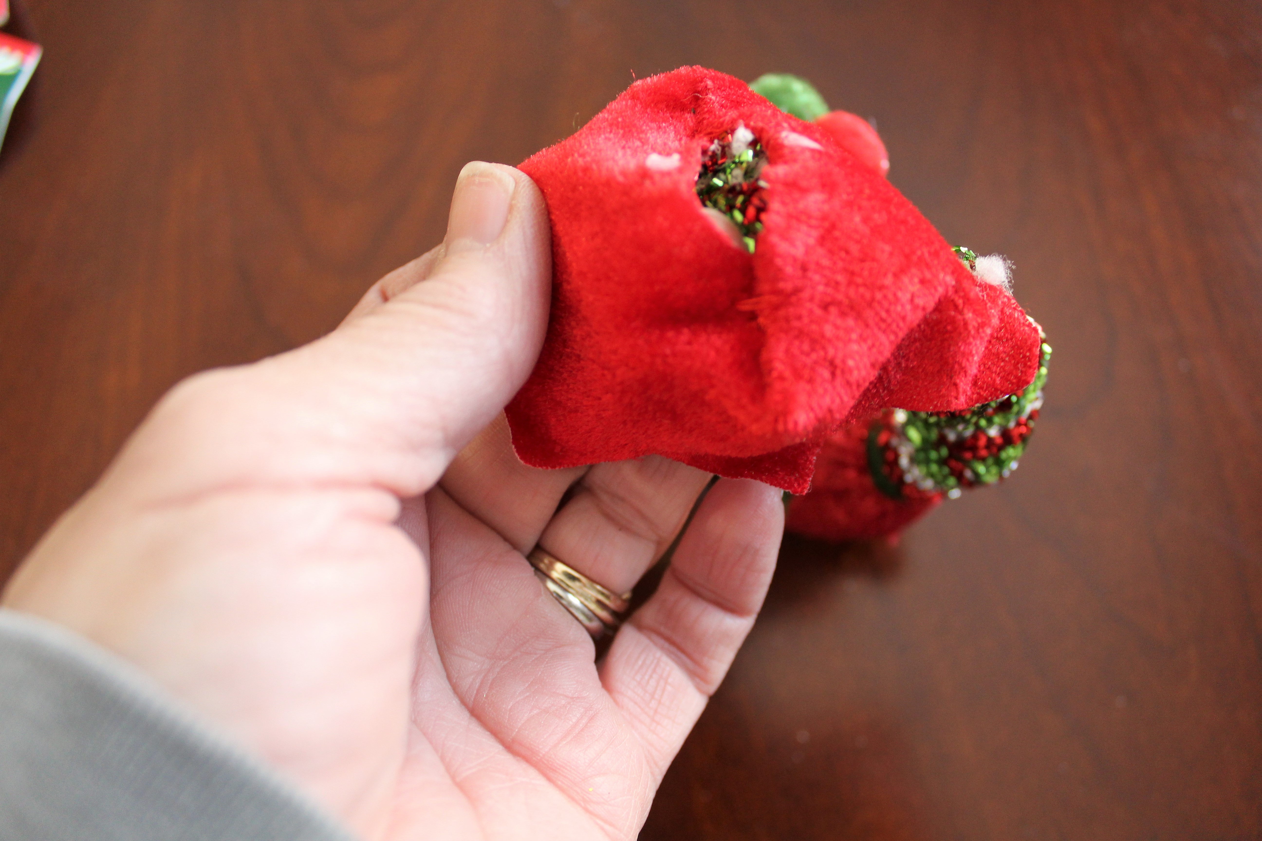 Take the ornament, remove the ribbon which will rip the seam of the skirt.