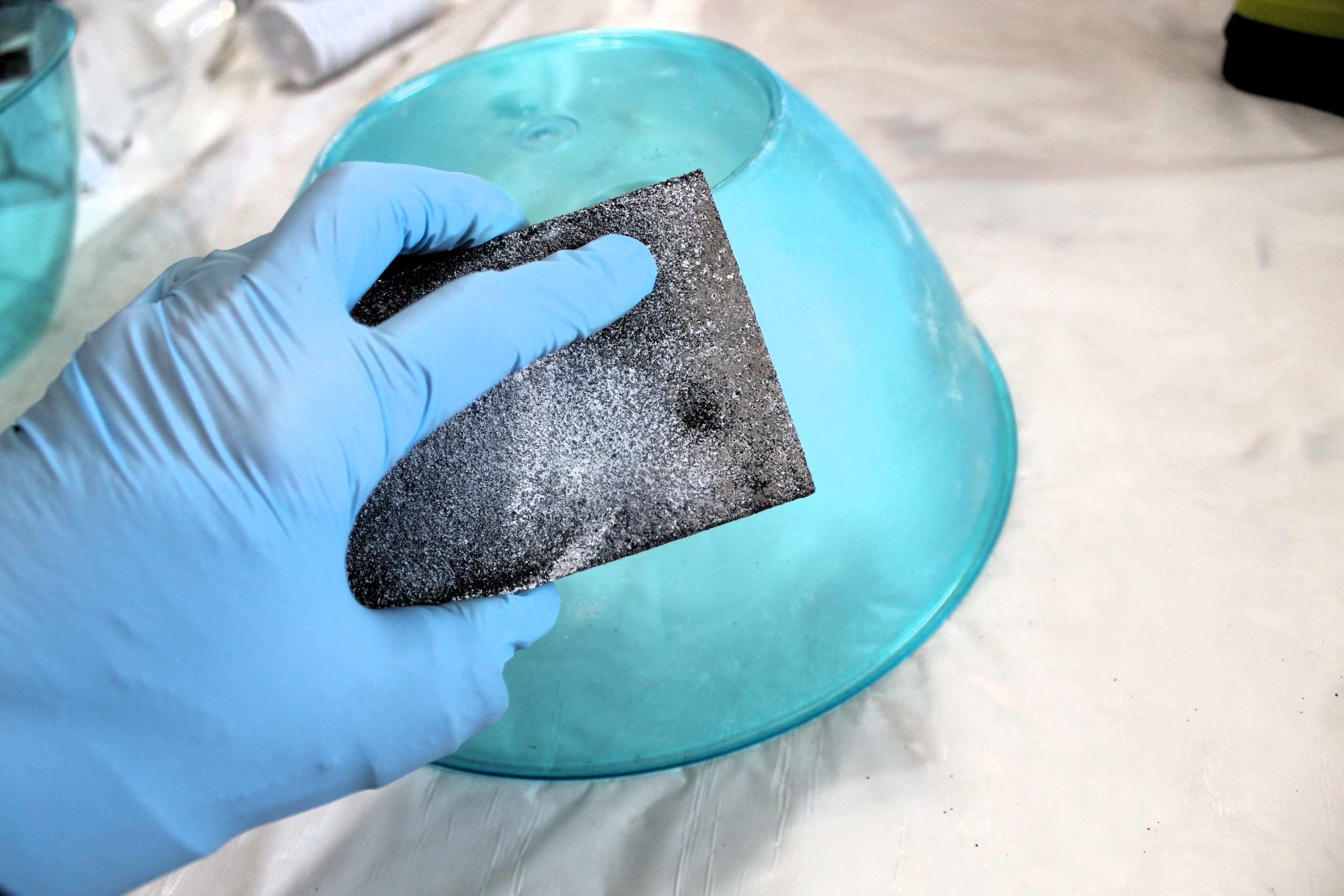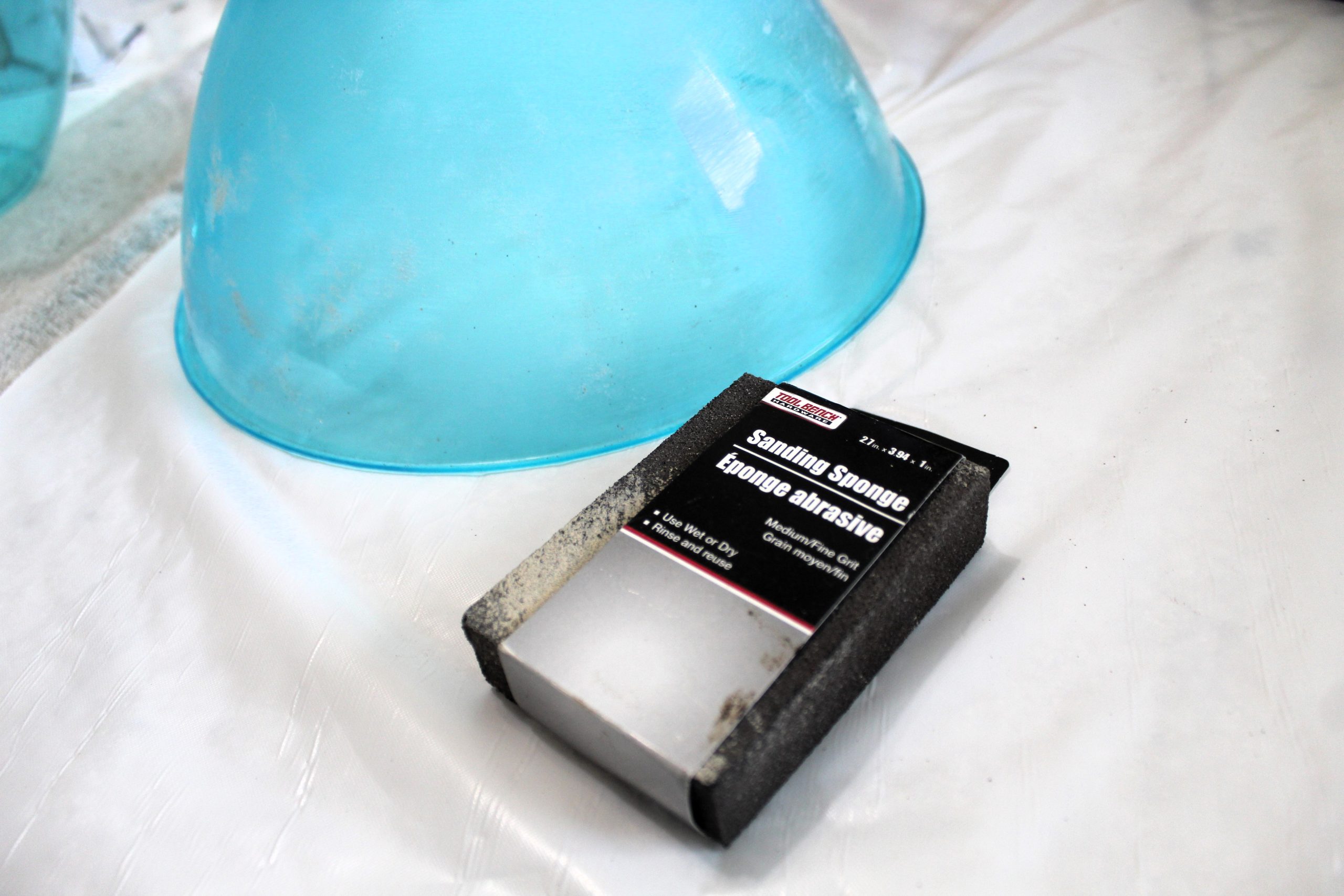 Taking the two bowls, removing the stickers and giving them a quick sanding to rough up the outer surface of both bowls. I purchased the sanding block from Dollar Tree as well.