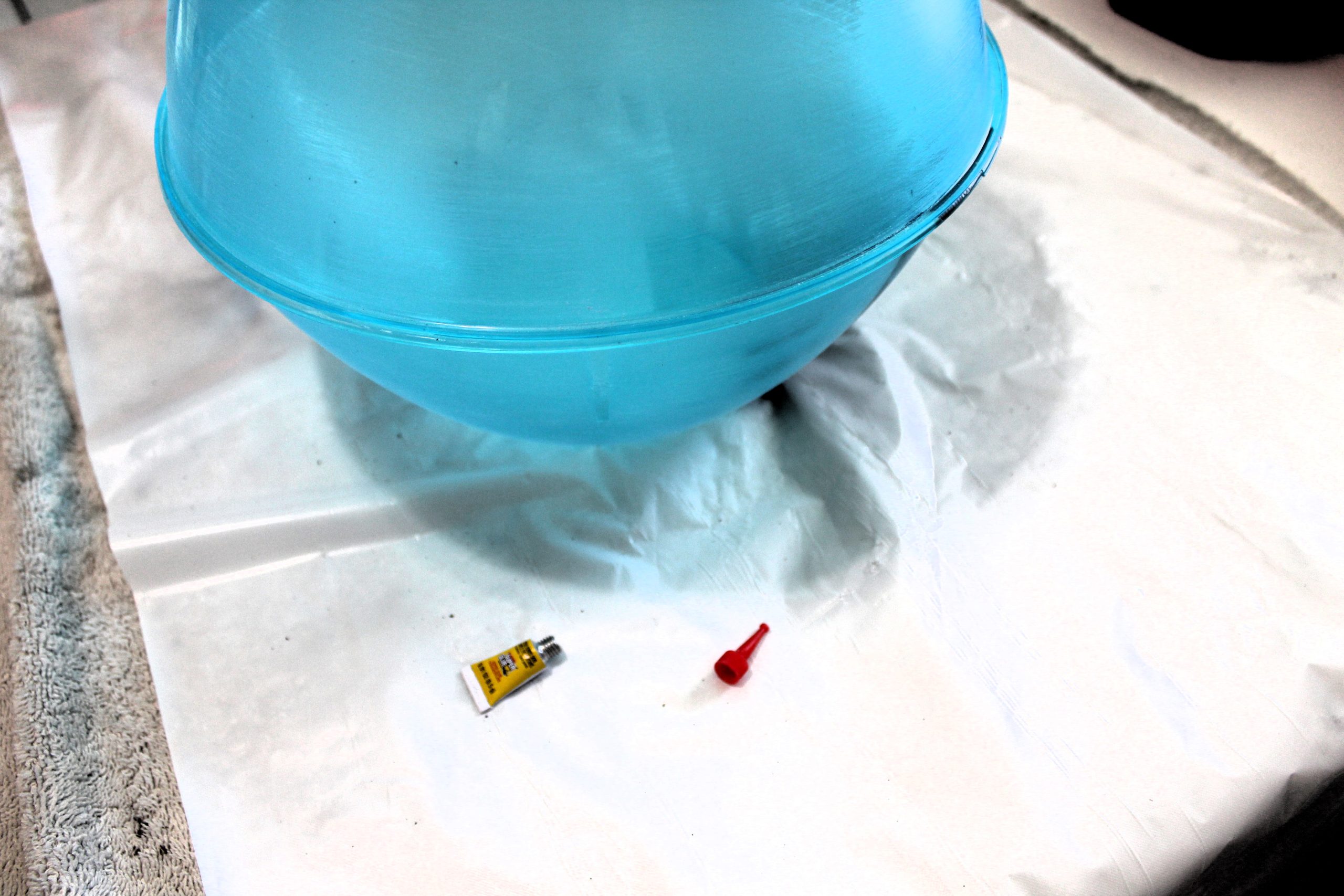 Wipe each bowl with a damp cloth to remove any dust from sanding. Taking super glue, add the glue to one top edge of the bowl. Making sure the glue doesn’t drip over to the outer part of the bowl. Place the bowl’s edges together to make one large ball.