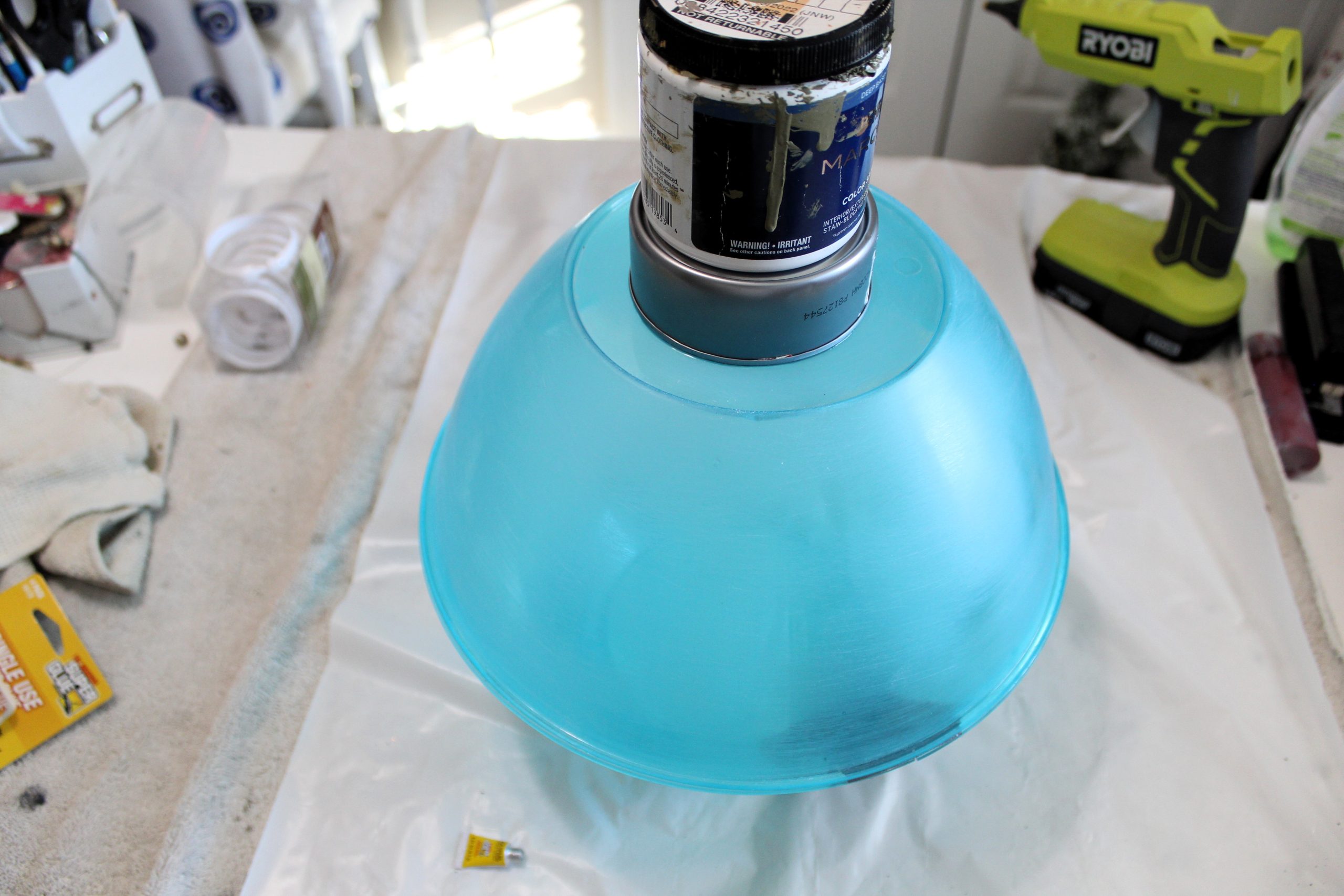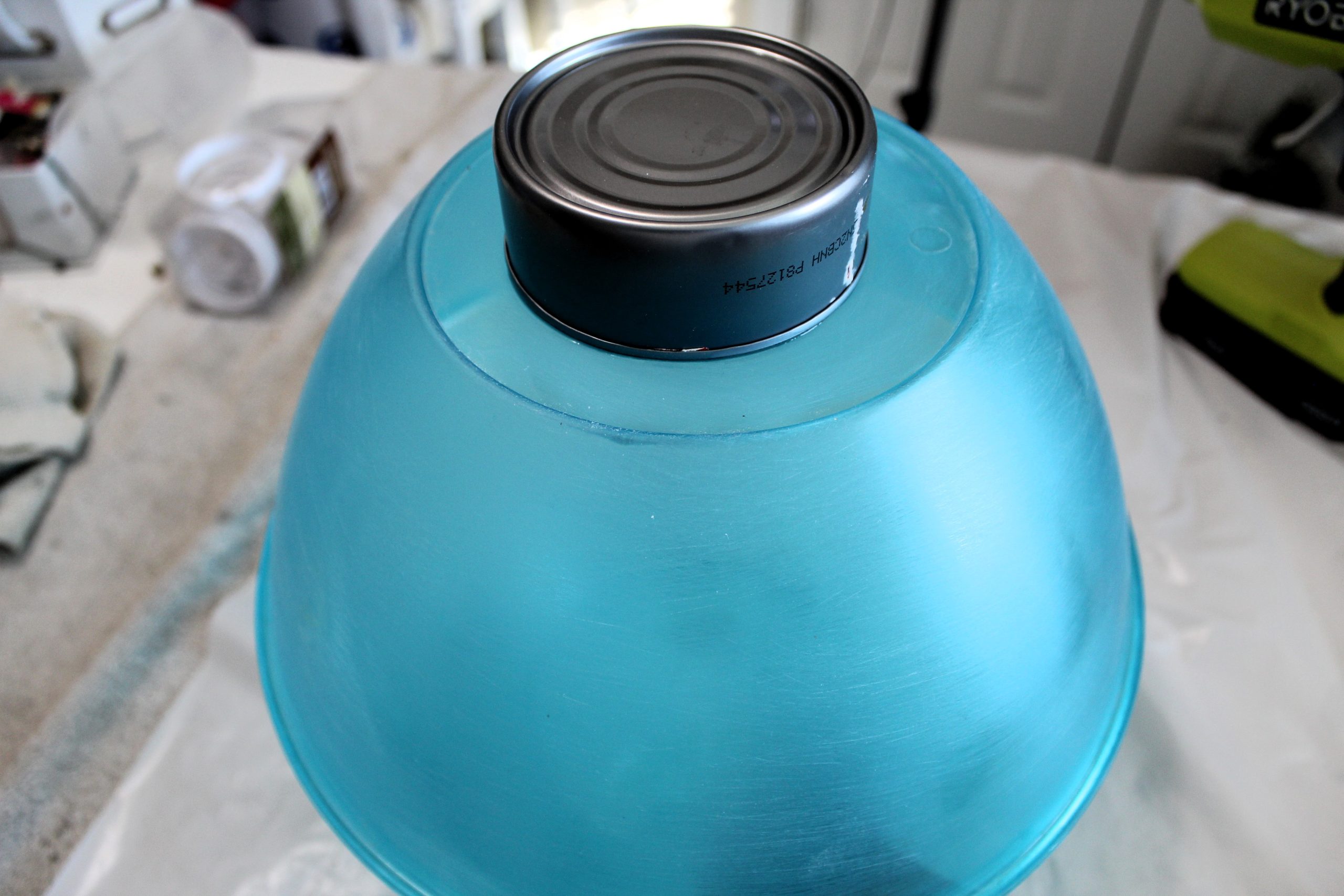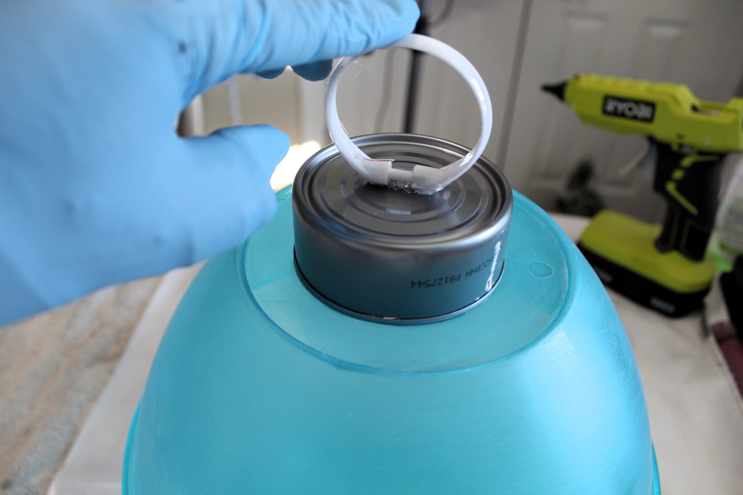 Grabbing the can of tuna, I emptied the can, washed it and dried it well. Added glue to the open side and placed it on the top of the bottom bowl. Place something heavy on top of the tuna can until the glue has time to dry.