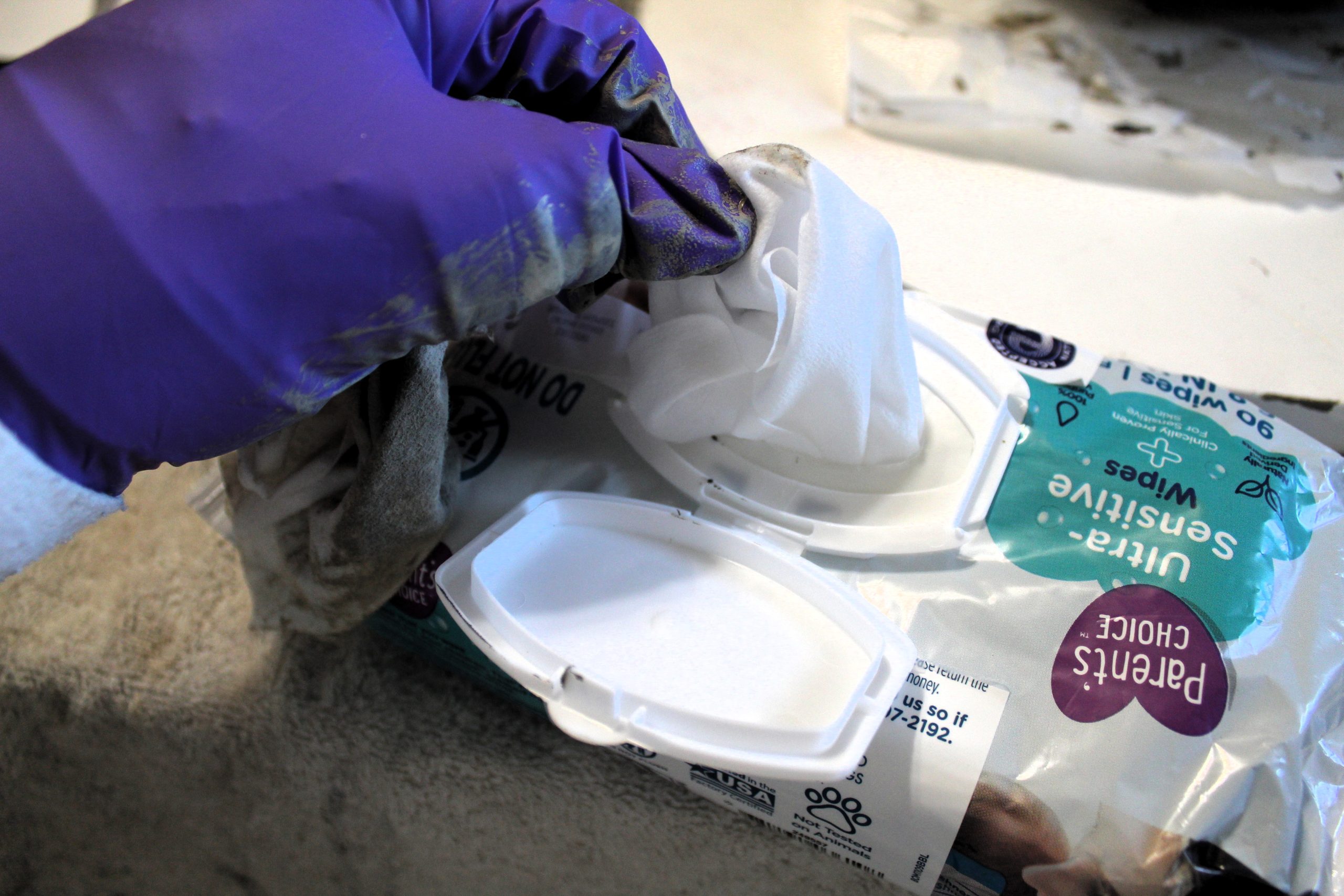 Distressing the body with a baby wipe, as you would do with sandpaper until you get the look you want.