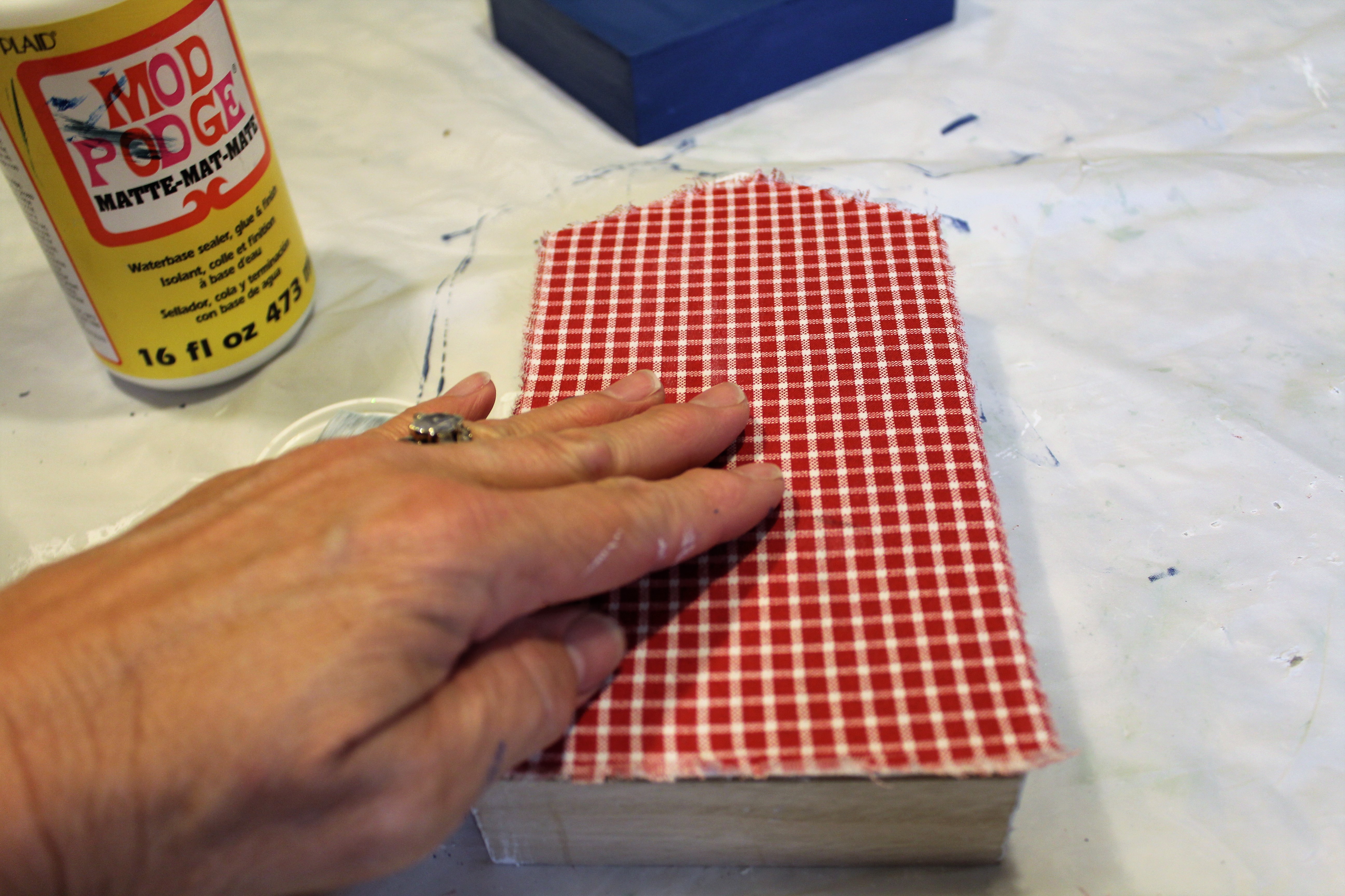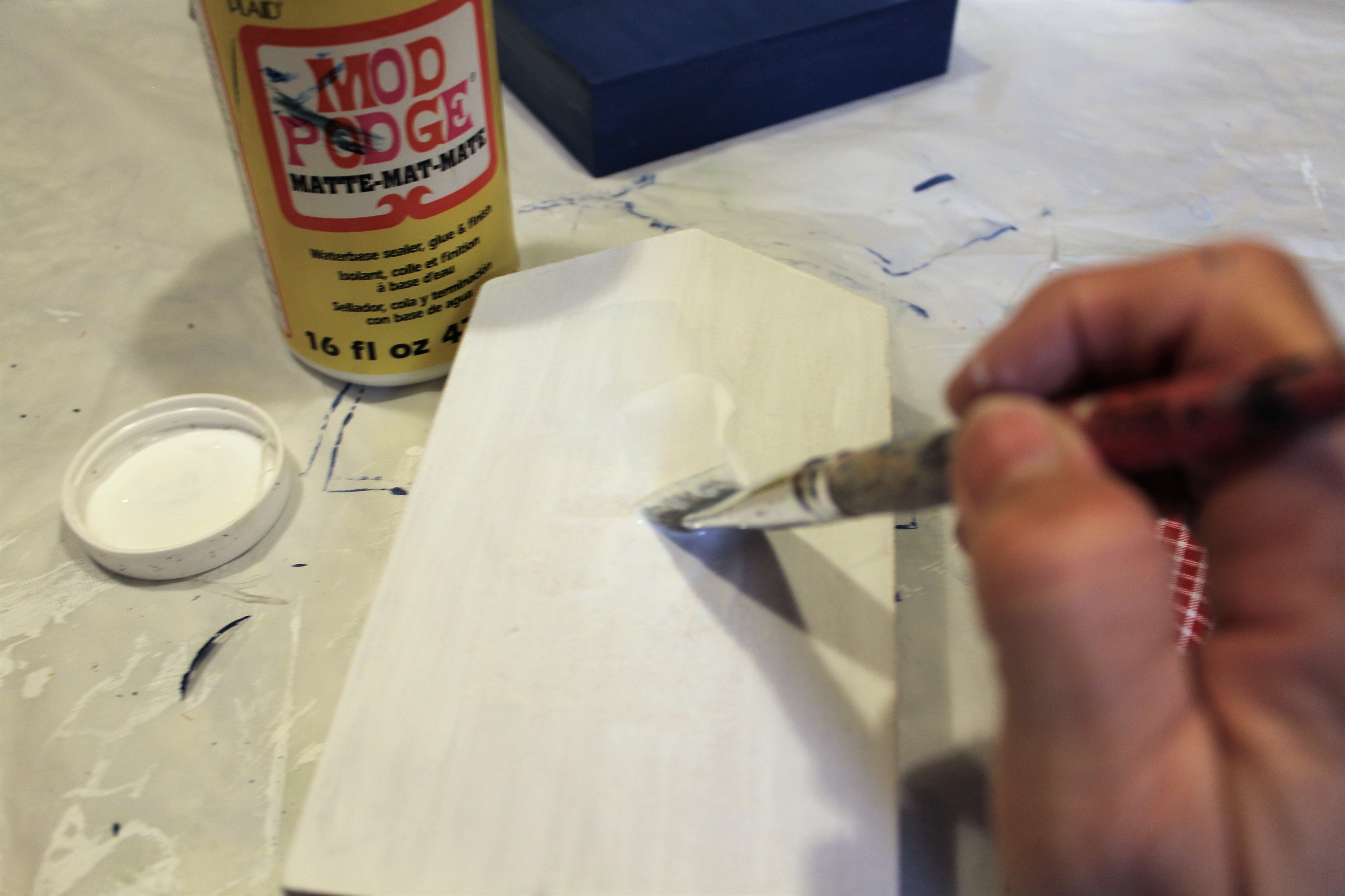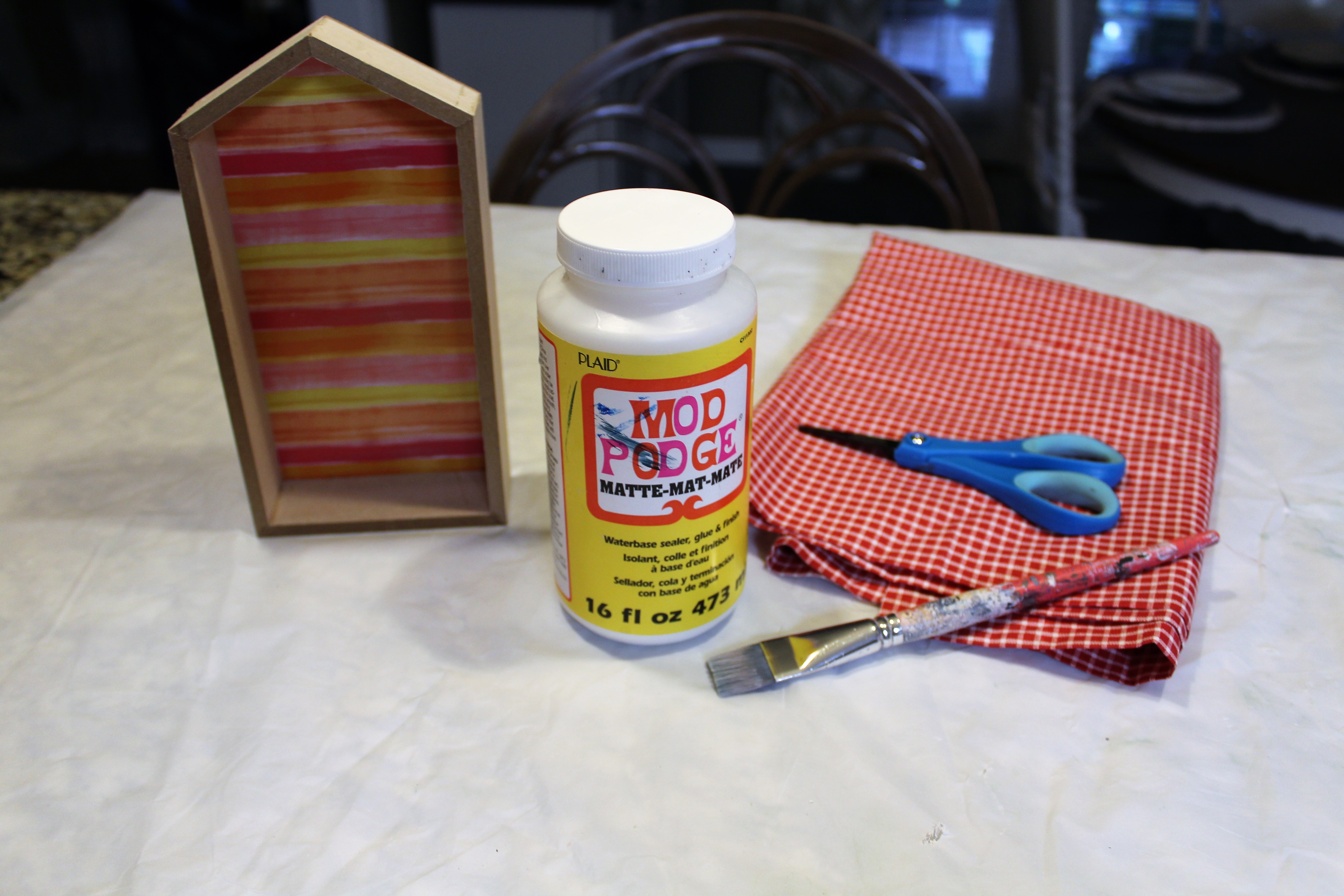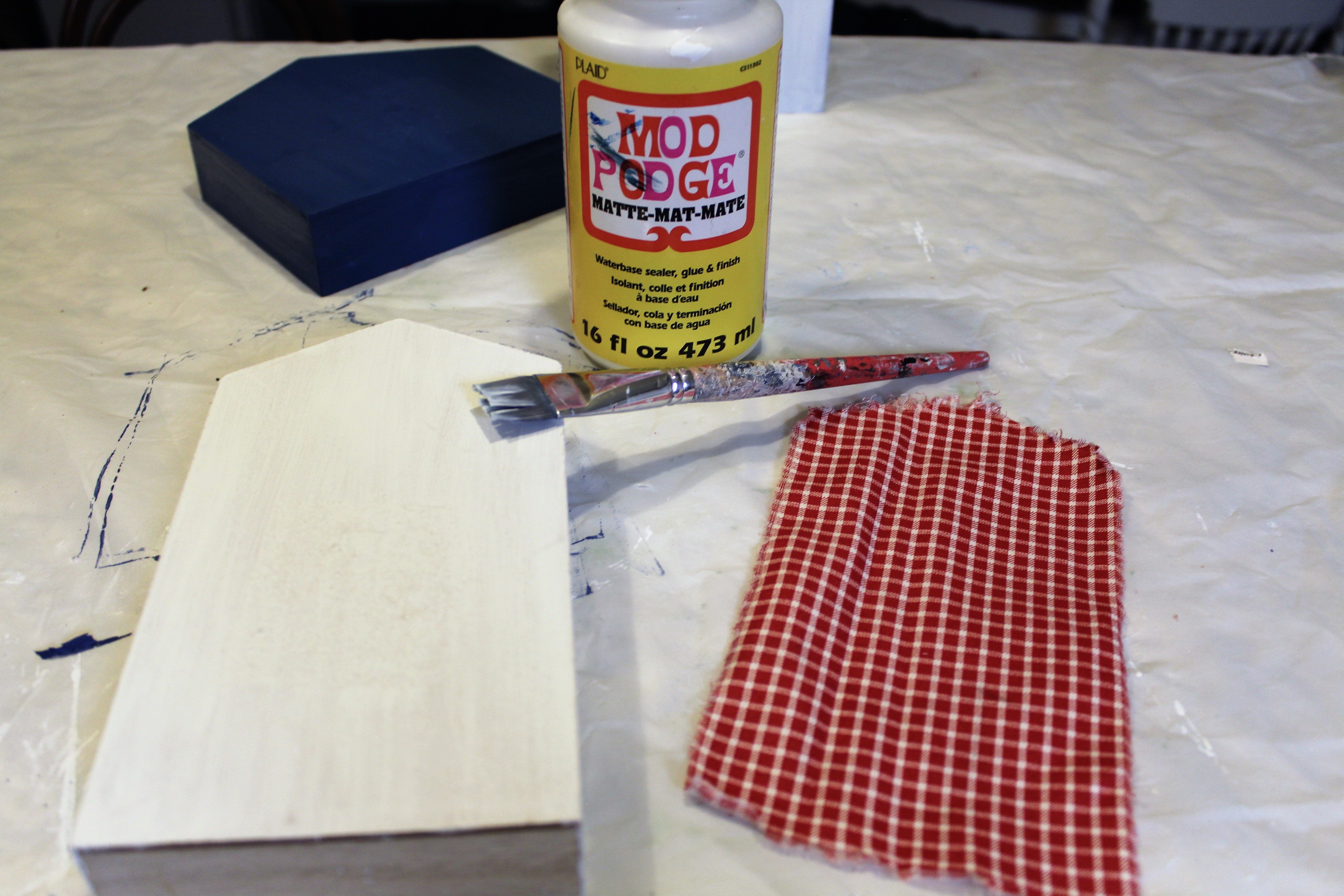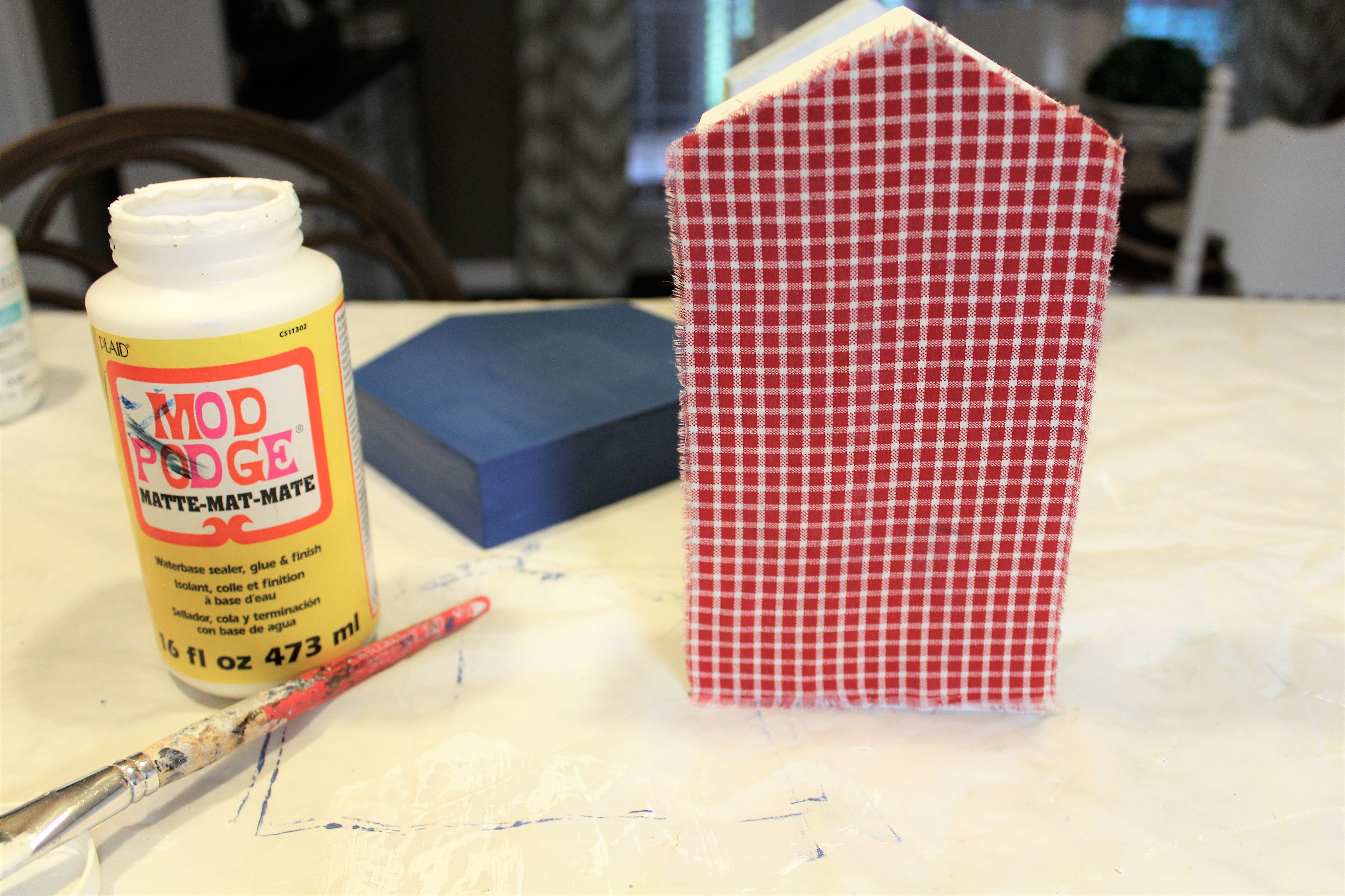 After the paint dried I took the tallest house and applied the material with Mod Podge.