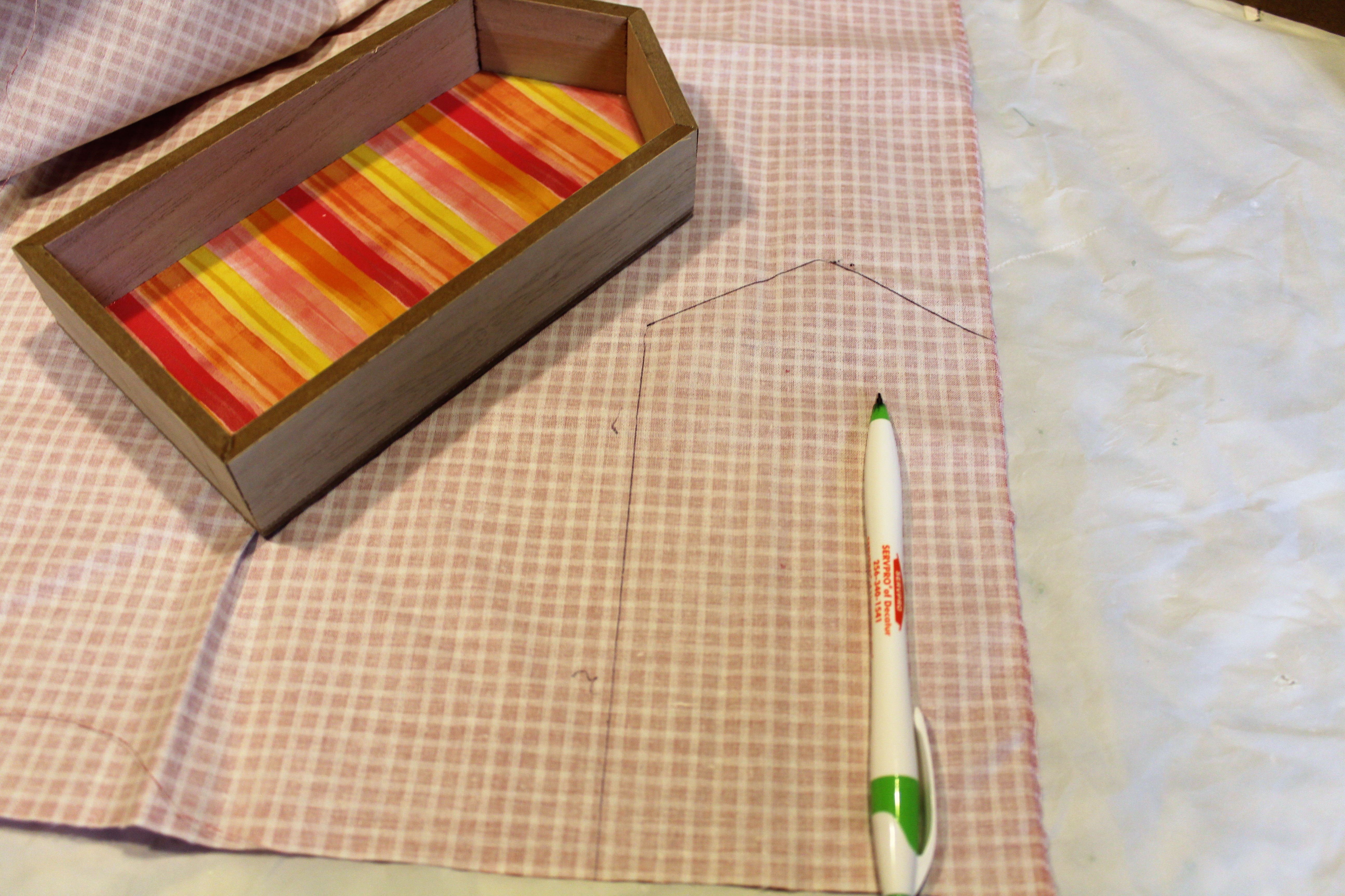 Taking the tallest of my house shapes and the material, I traced the house onto the fabric. I cut on the lines and freyed the ends. To see how I fray material you can check out how I do that FRAY MATERIAL. Sitting the cut out material to the side for now.