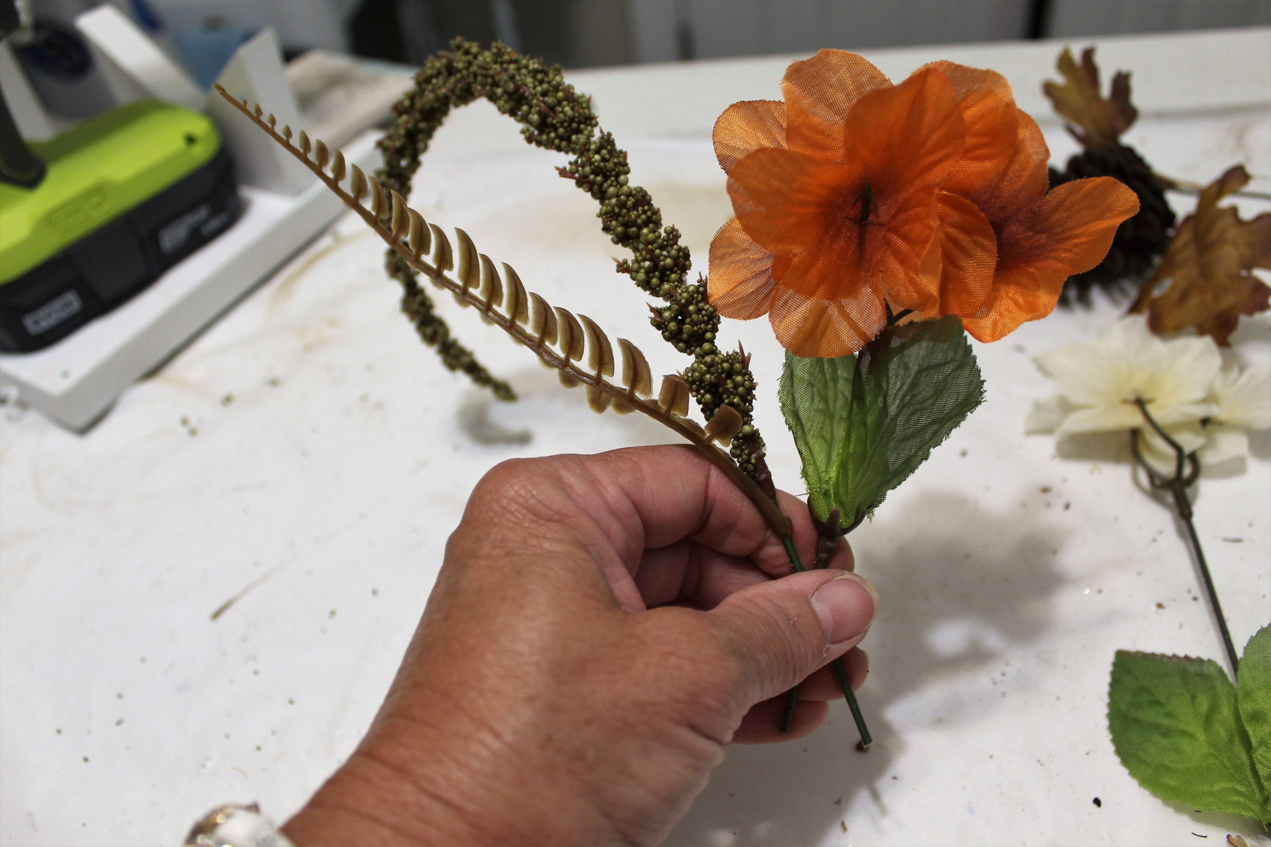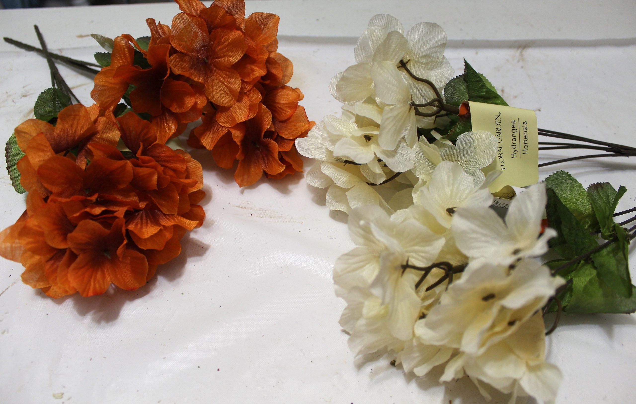 - Two bundles of each: Orange and off-white Hydrangeas, green Amaranthus, blooming branch, yellow wheat and fall leaves