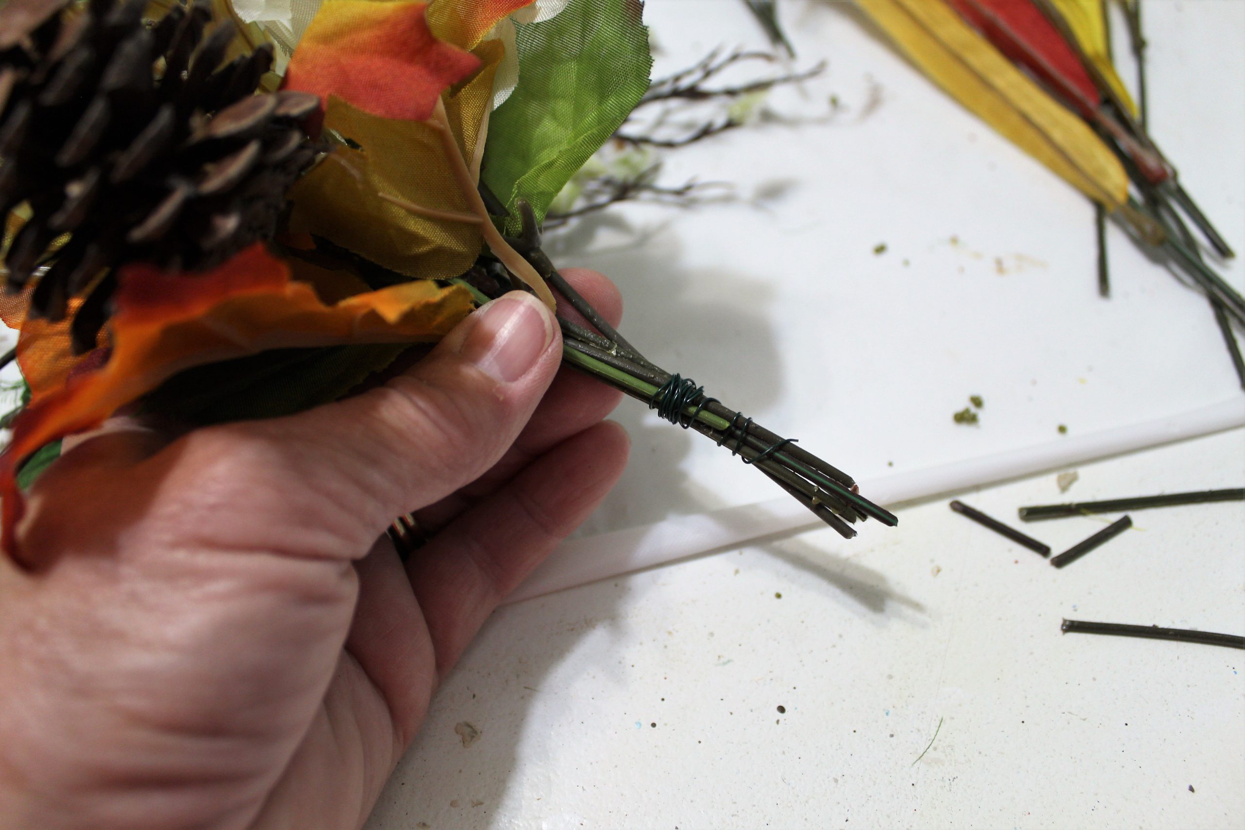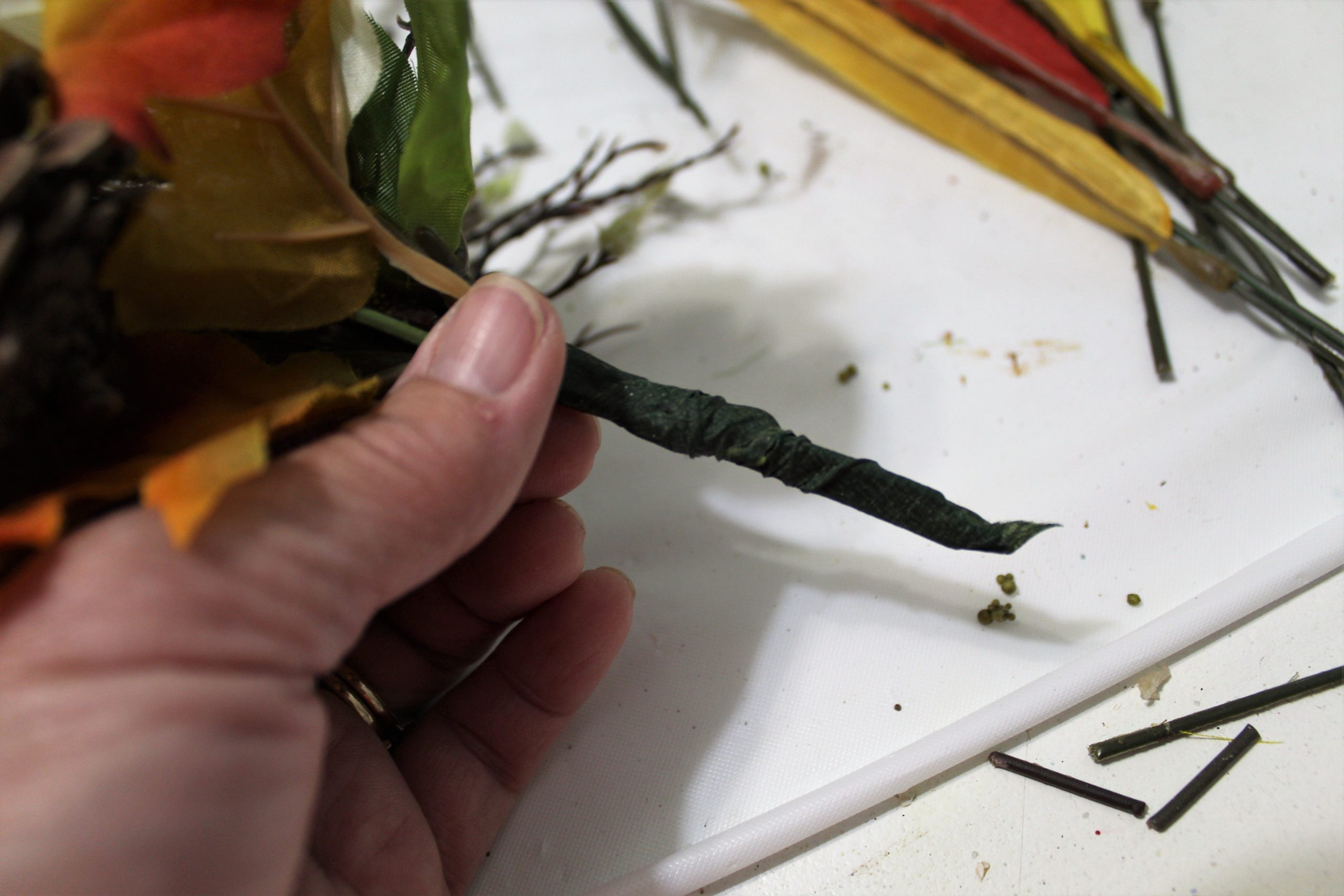 Wrap floral wire to secure the stems together, hide the wire with floral tape.