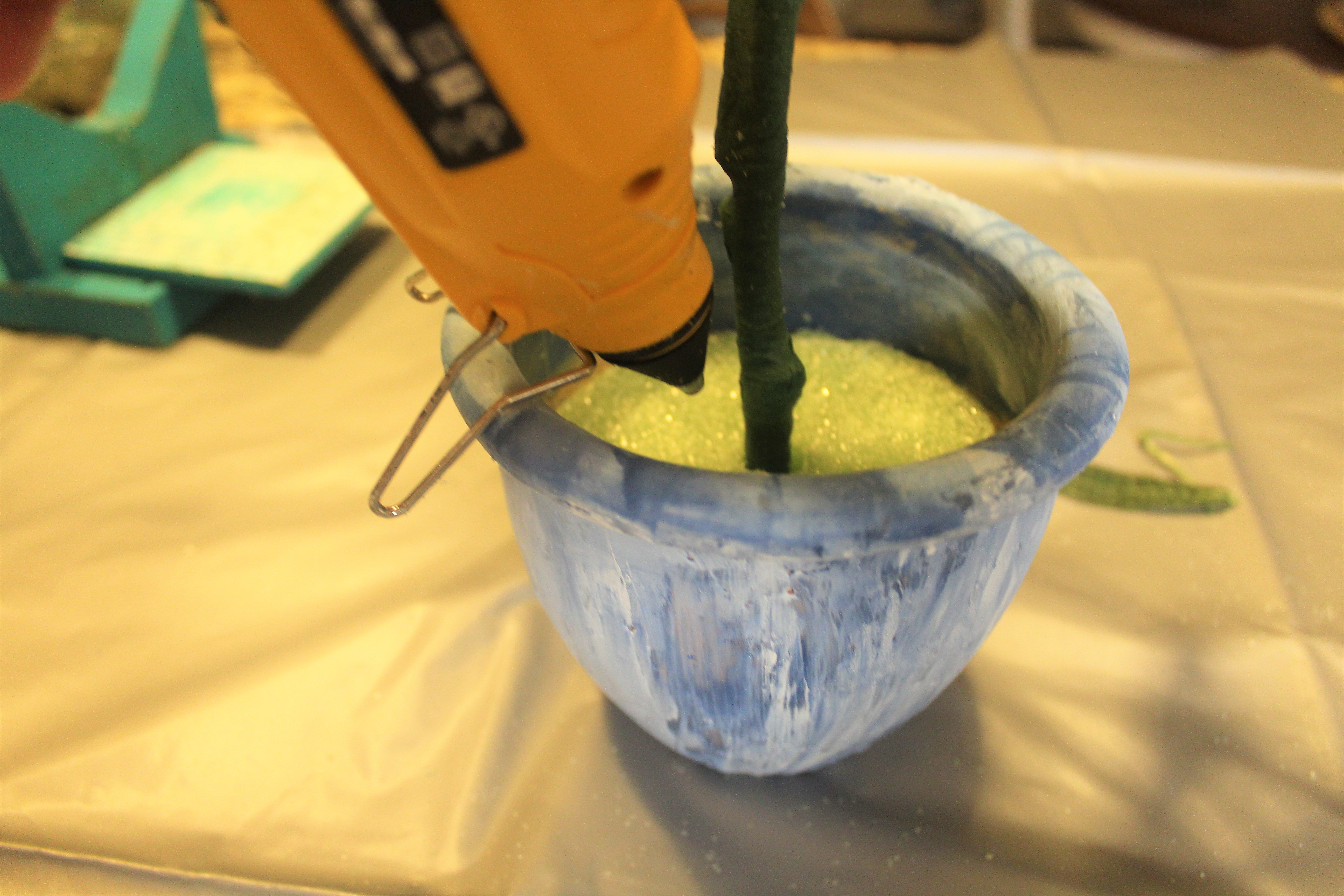 • Taking the floral foam, hot glue gun and glue sticks, container.