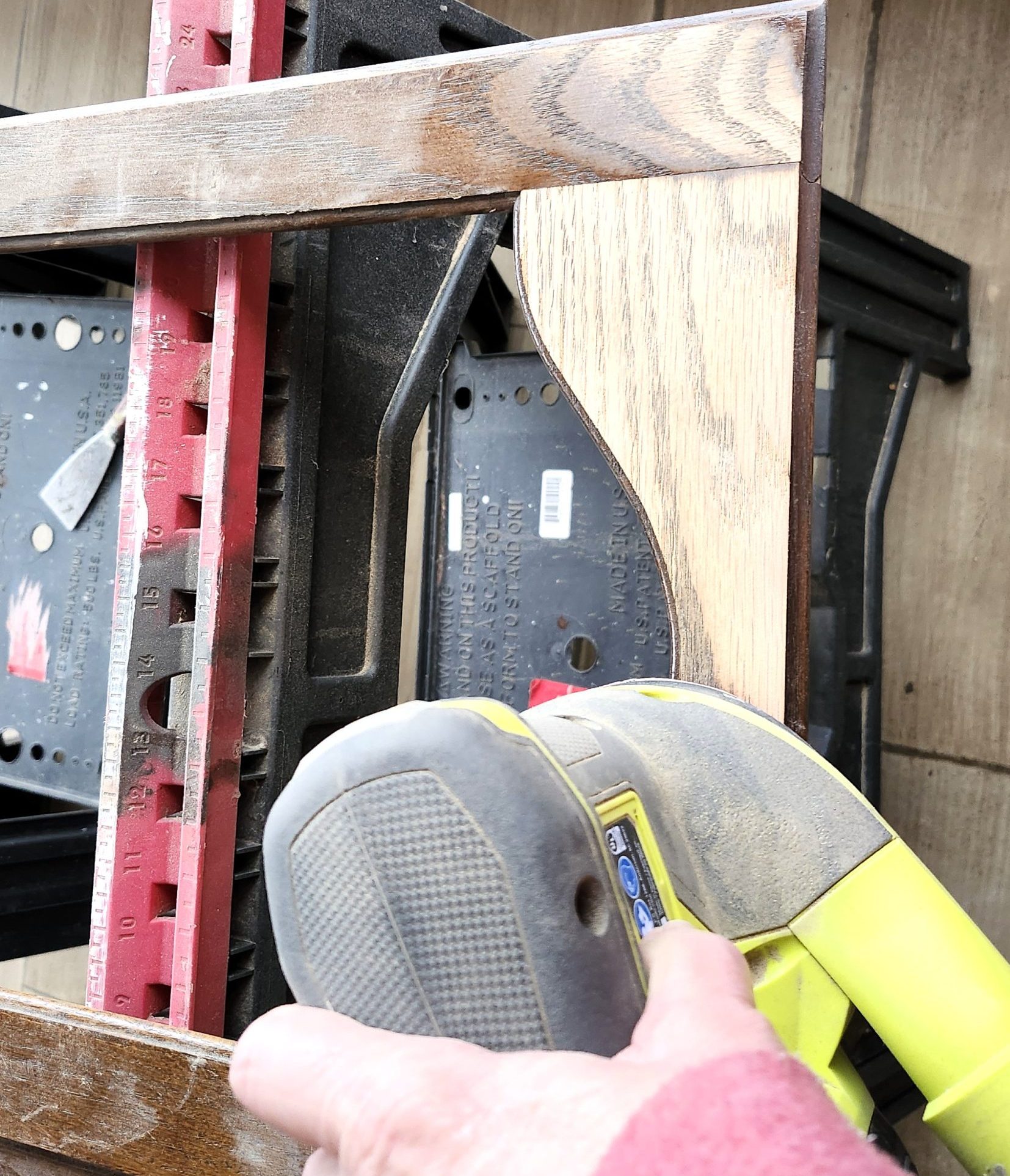 Since the wood was dry, I sanded off the stain instead using stripper. I used 80 grit sandpaper and then 120 to smooth the surface.