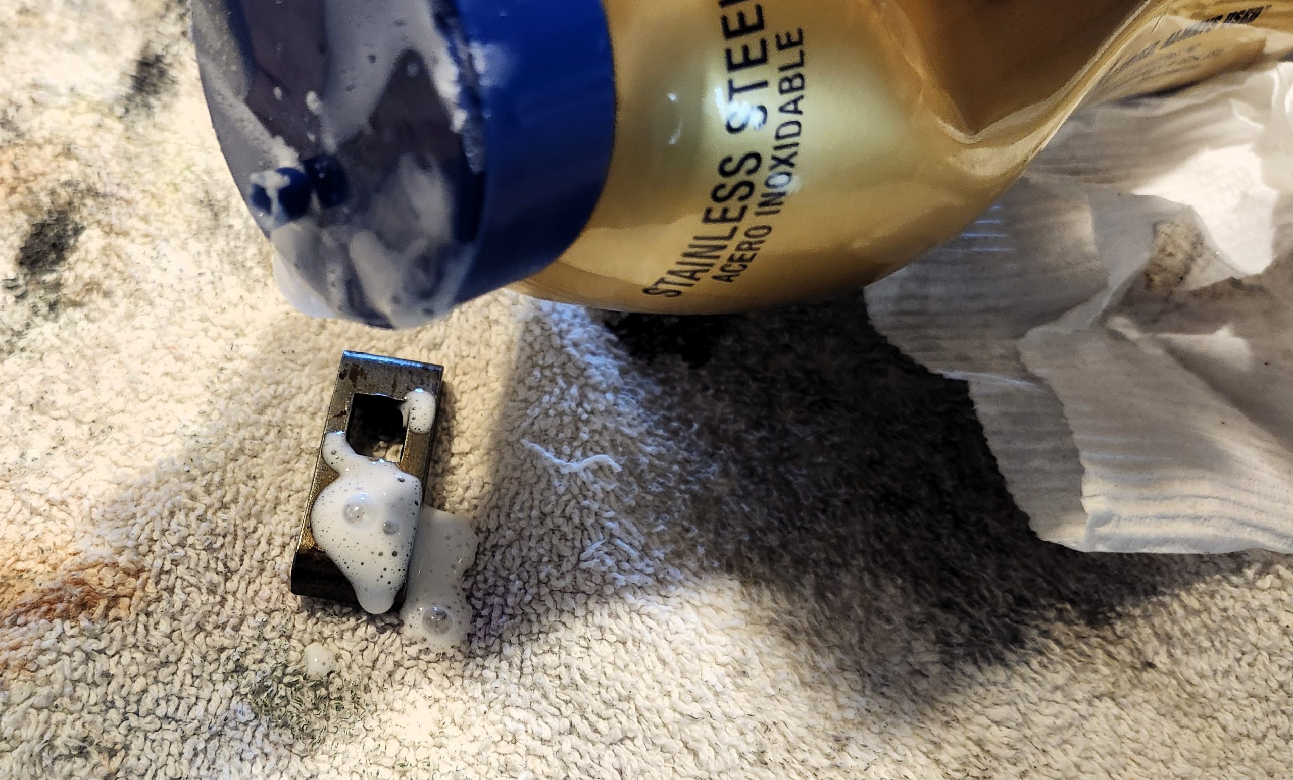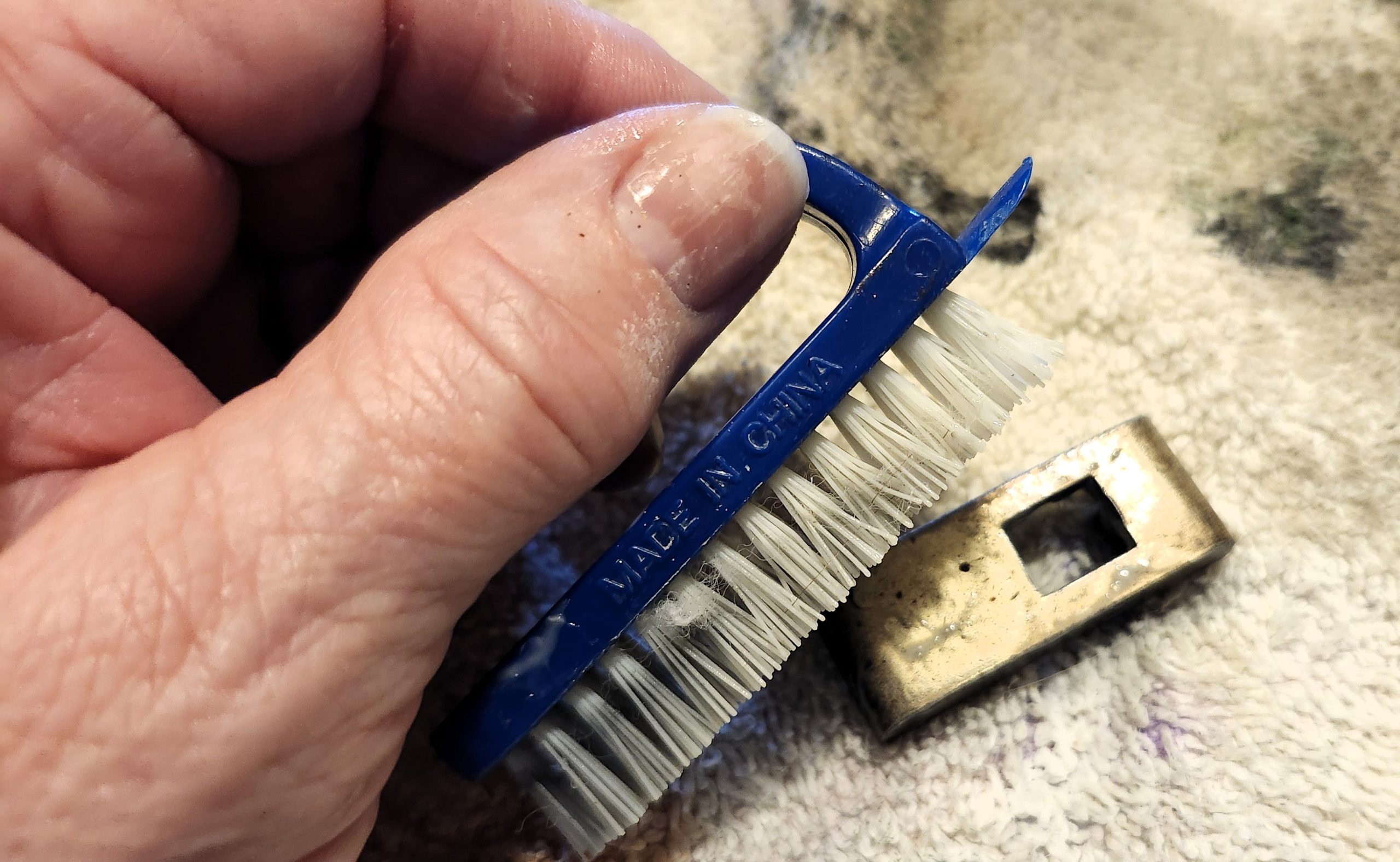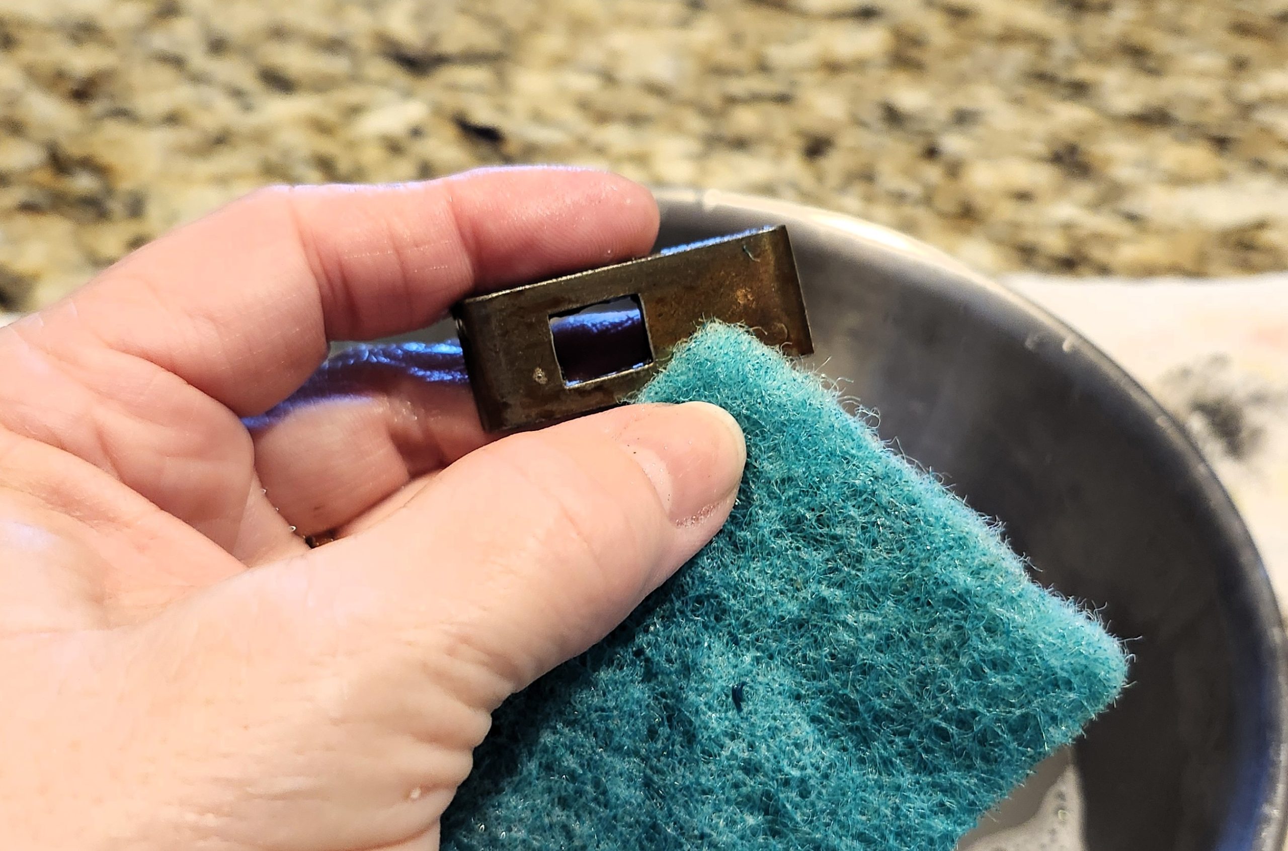 I added the hardware to the soapy water to clean dust, dirt and grease. Applied the cleanser to the piece, using both a brush and a green scouring pad to help remove the tarnish.
