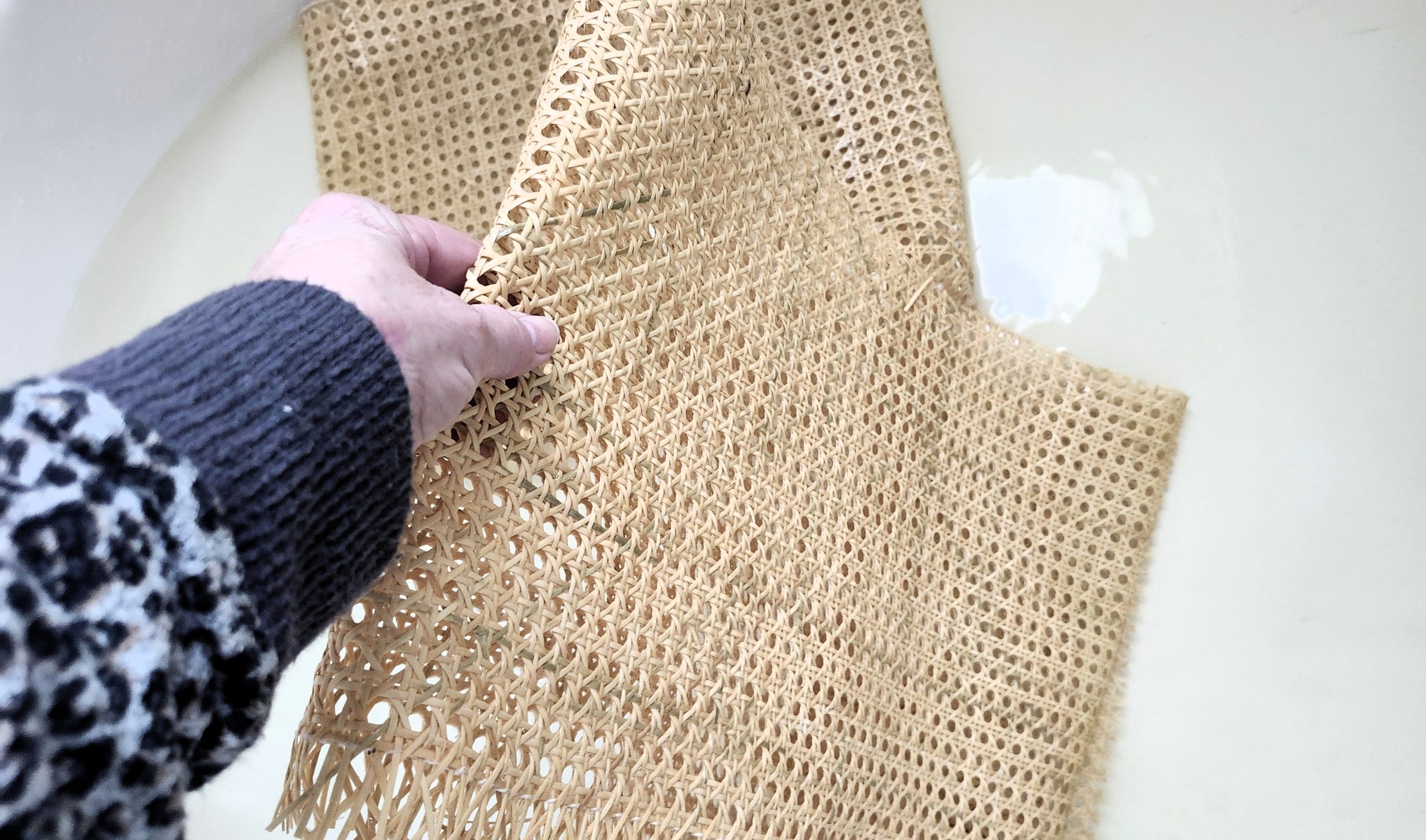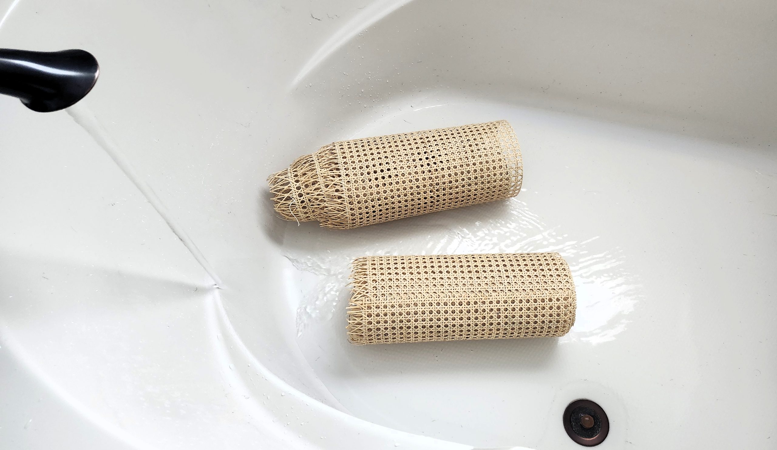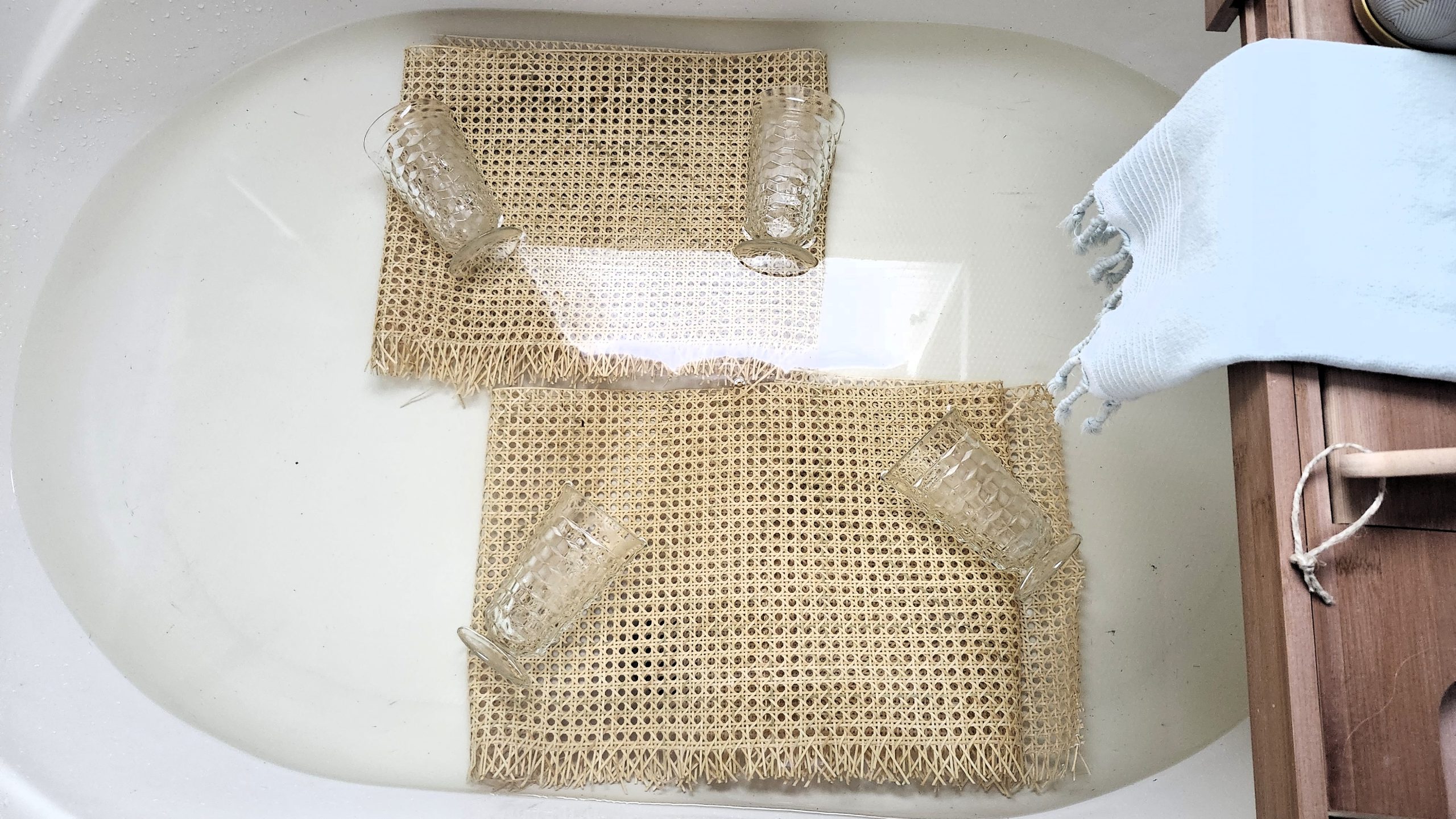 After cutting the webbing to size, I placed the webbing in warm water to soak for 30 minutes. To hold the webbing down in the water I sat glasses on top of them.