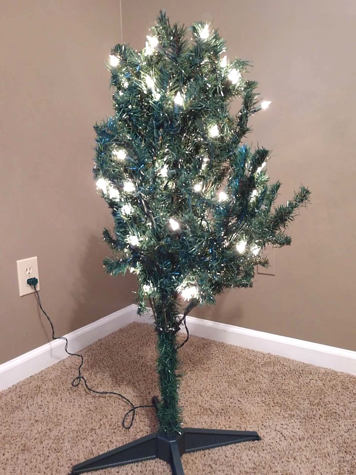 I like the looks of a little movement in the tree. I add a strand of twinkle lights to the inner part of the tree. I stay close to the pole of the tree running it up and down.