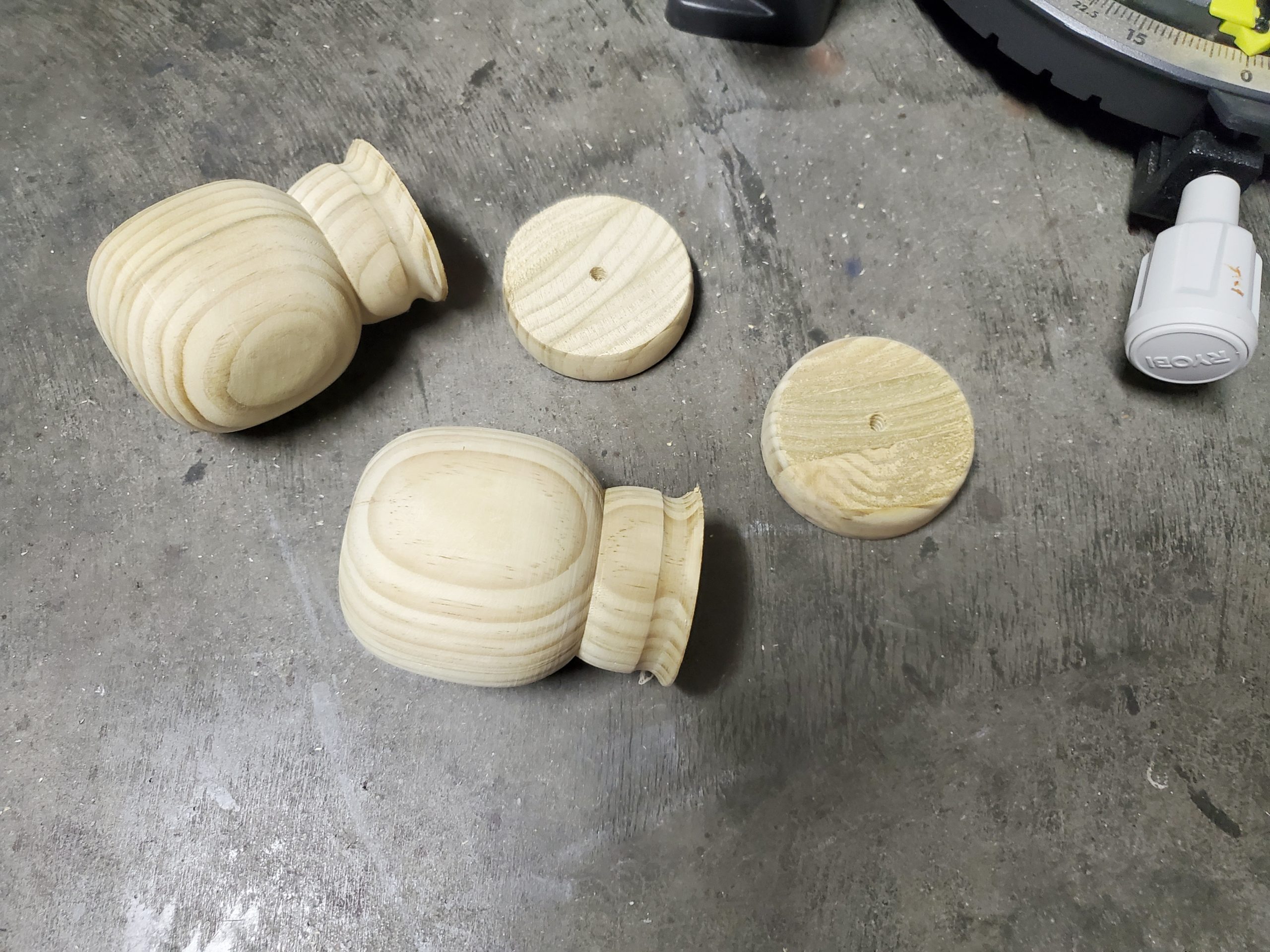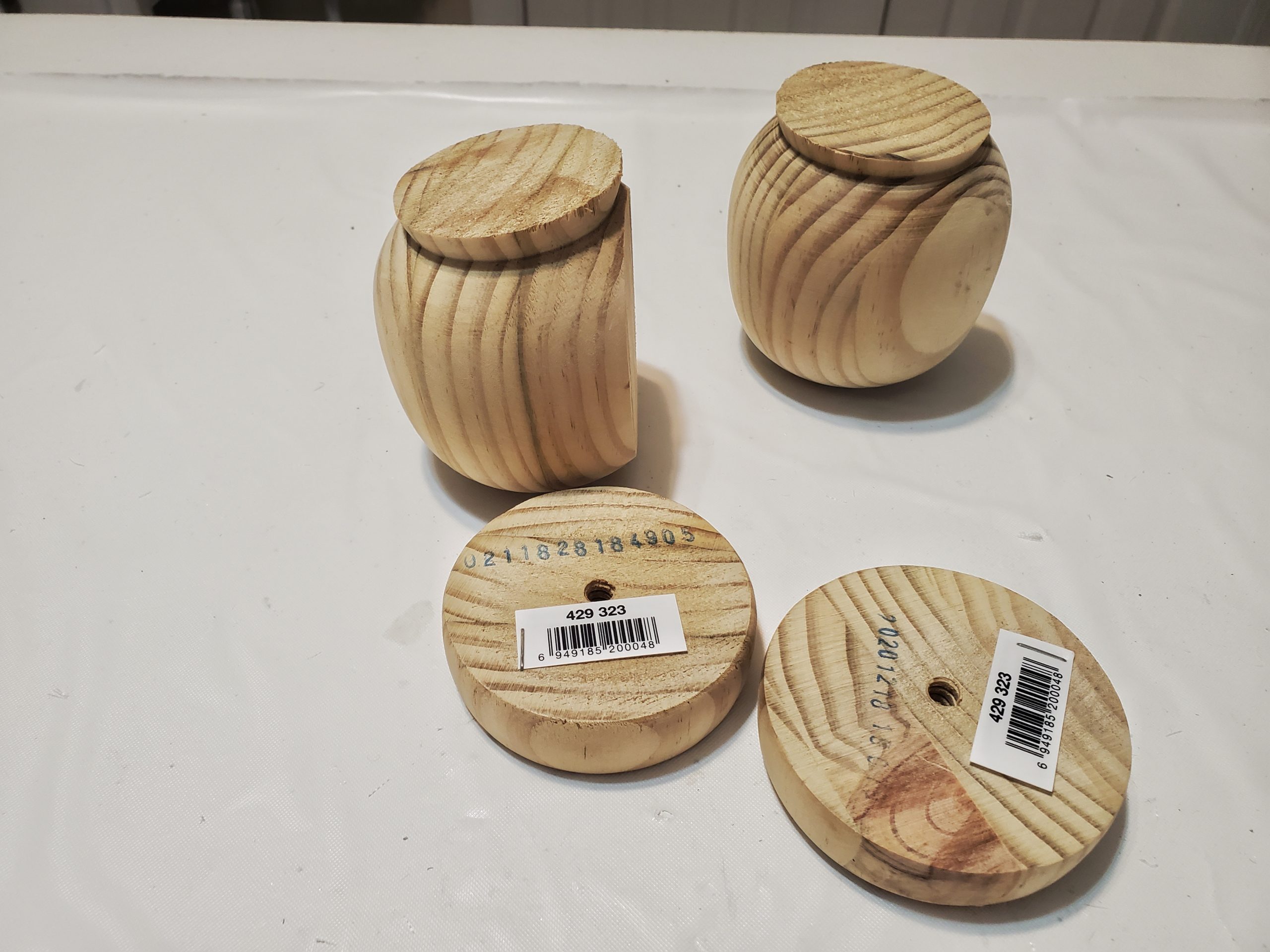 I found wooden ball finials in Home Depot, they had a couple styles to choose from. I had to do some trimming to fit the bottom of our cabinet.