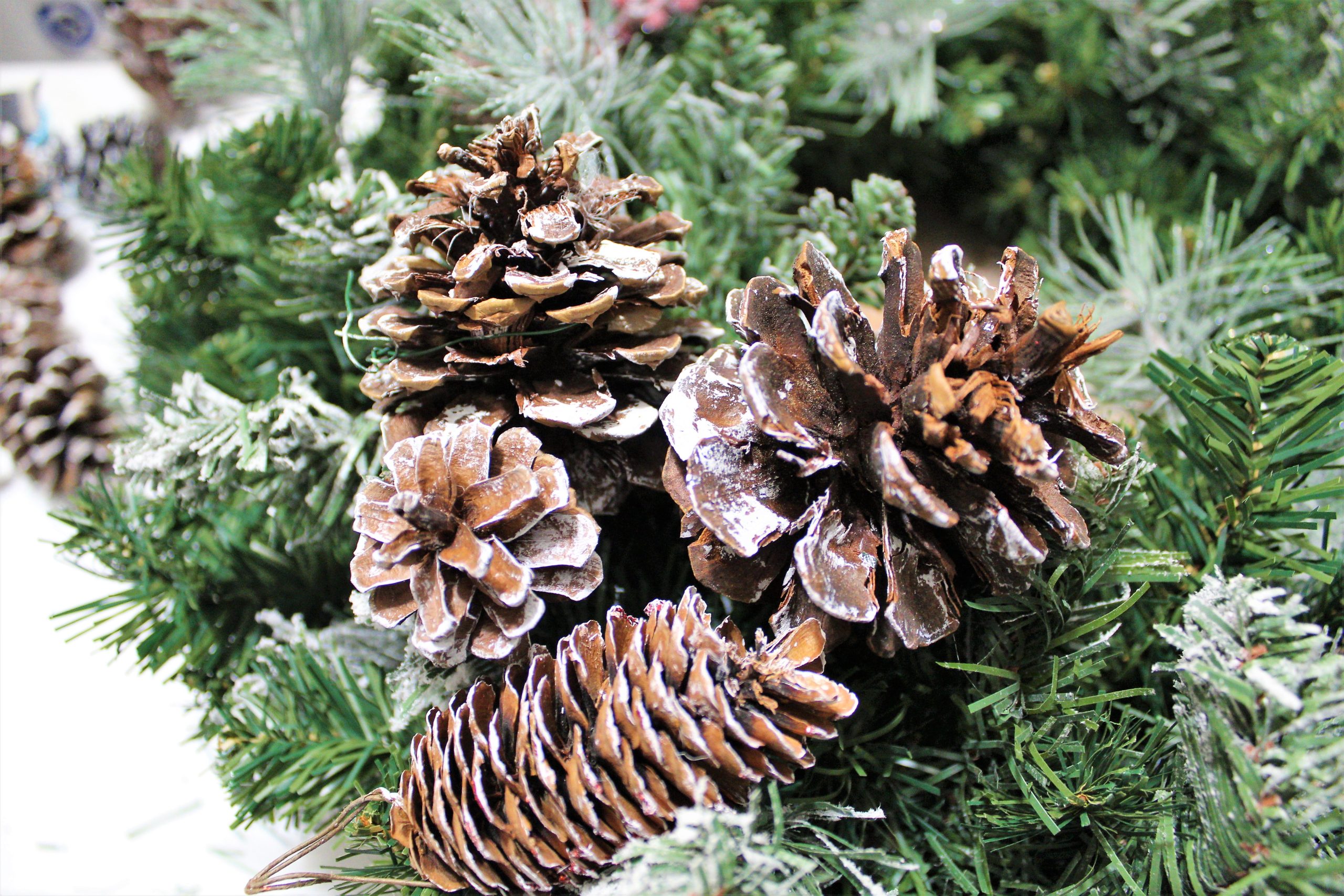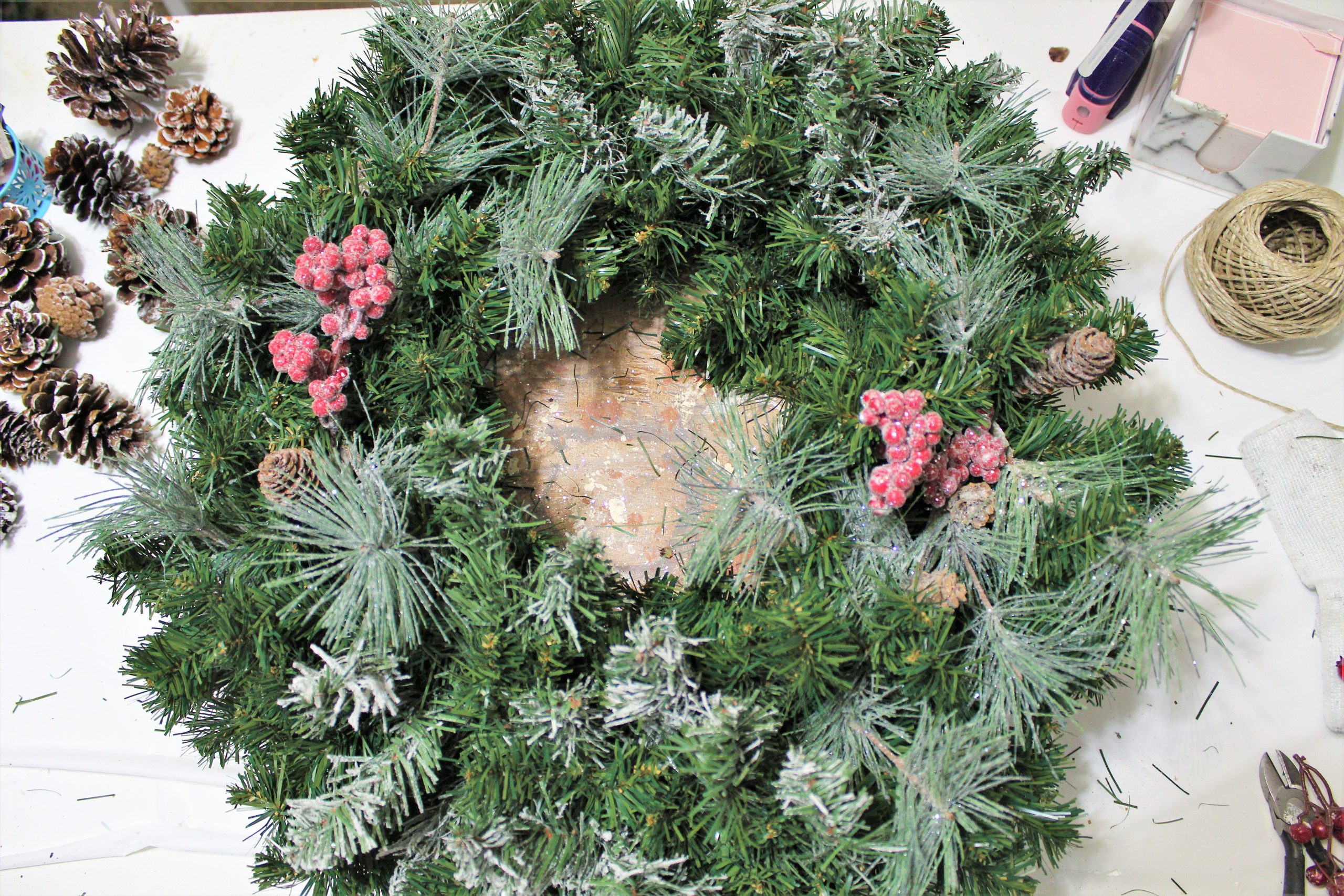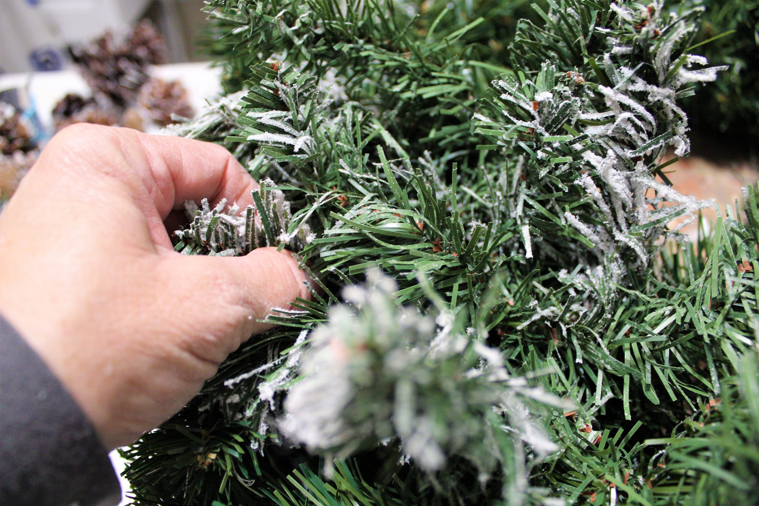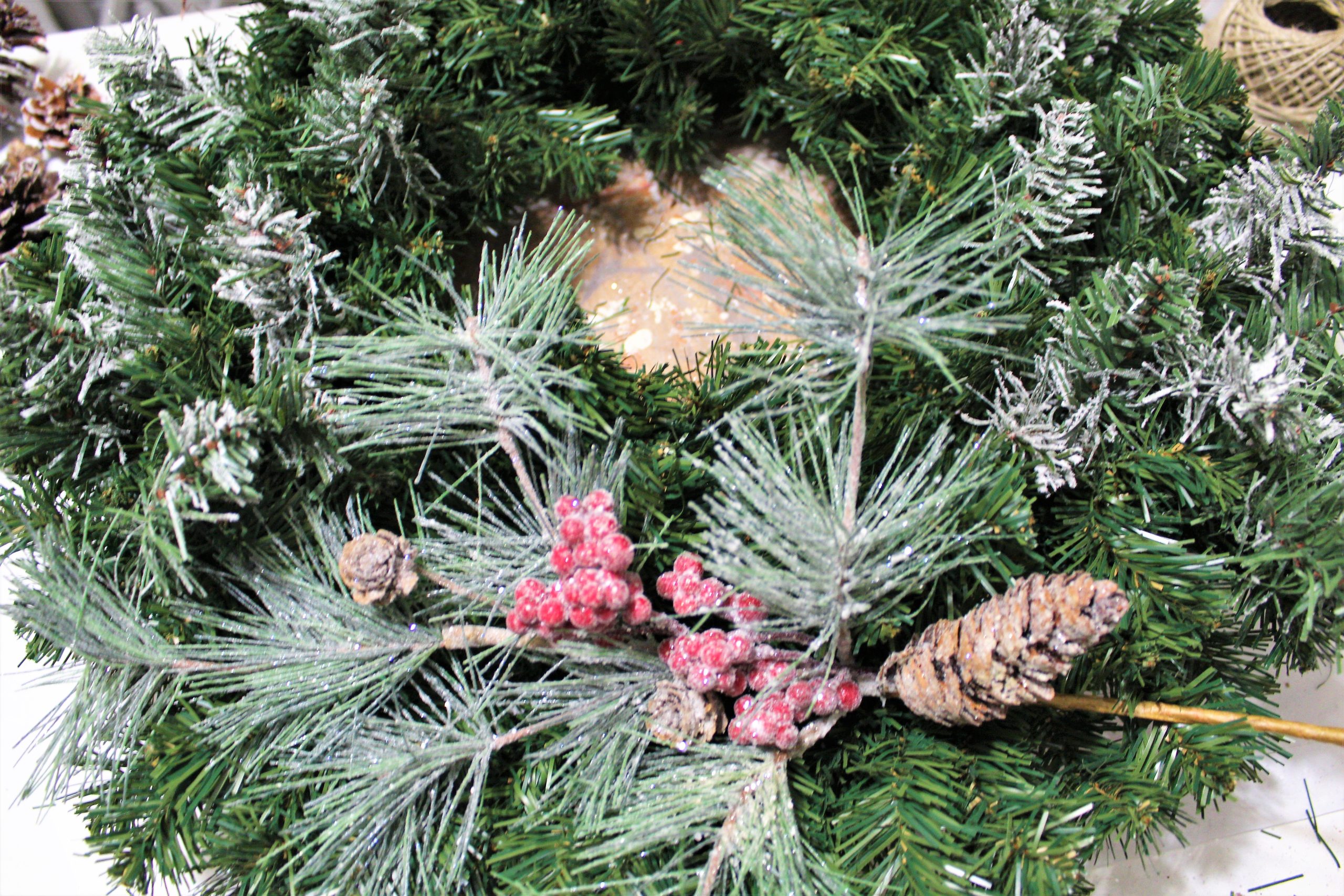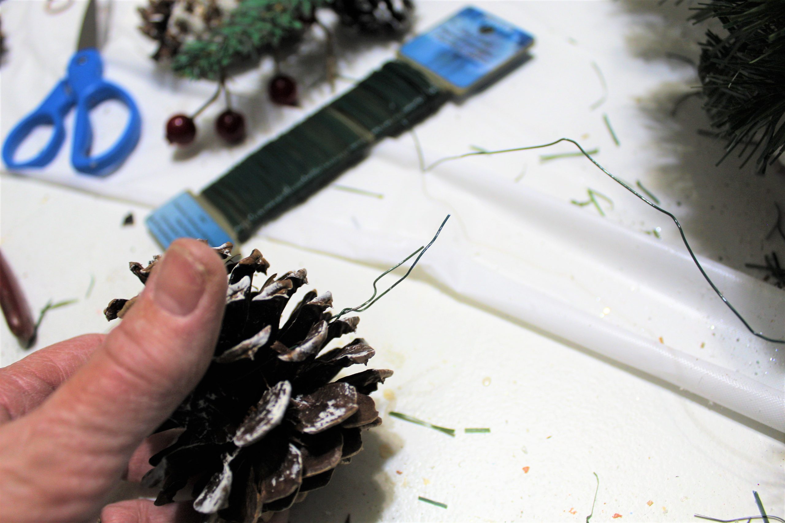 Adding a few painted white pinecones. I added floral wire to the pinecone to attach to the wreath.
