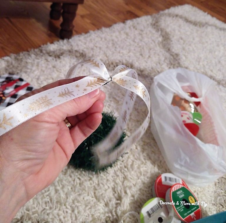 I cut 4 streamers and used floral wire to form a pick and stuck it into the ball. Made a bow and added a pine cone and some gold berries. You can hot glue it to the ball if you would like. I used the floral wire and poke it into the ball.