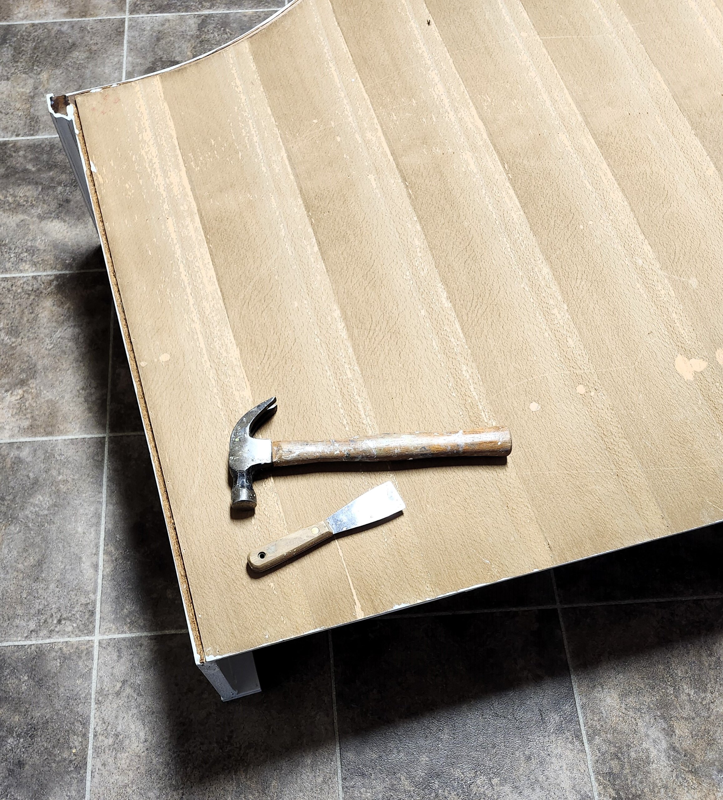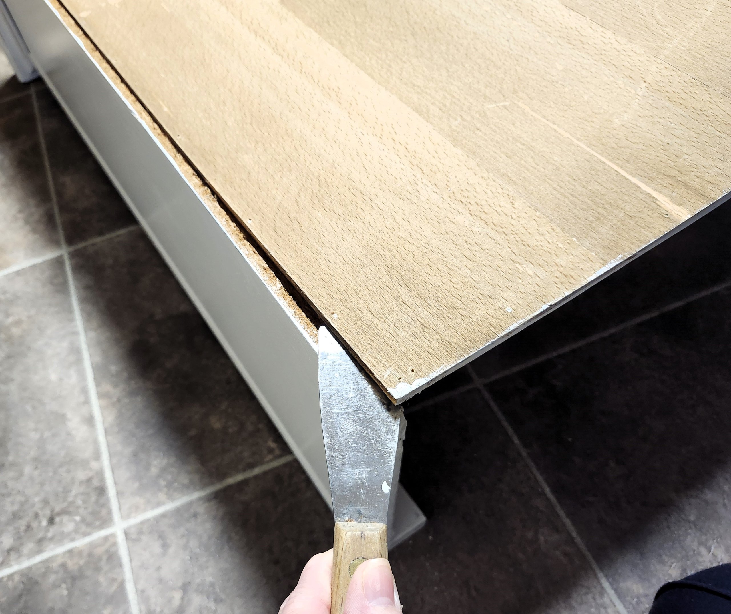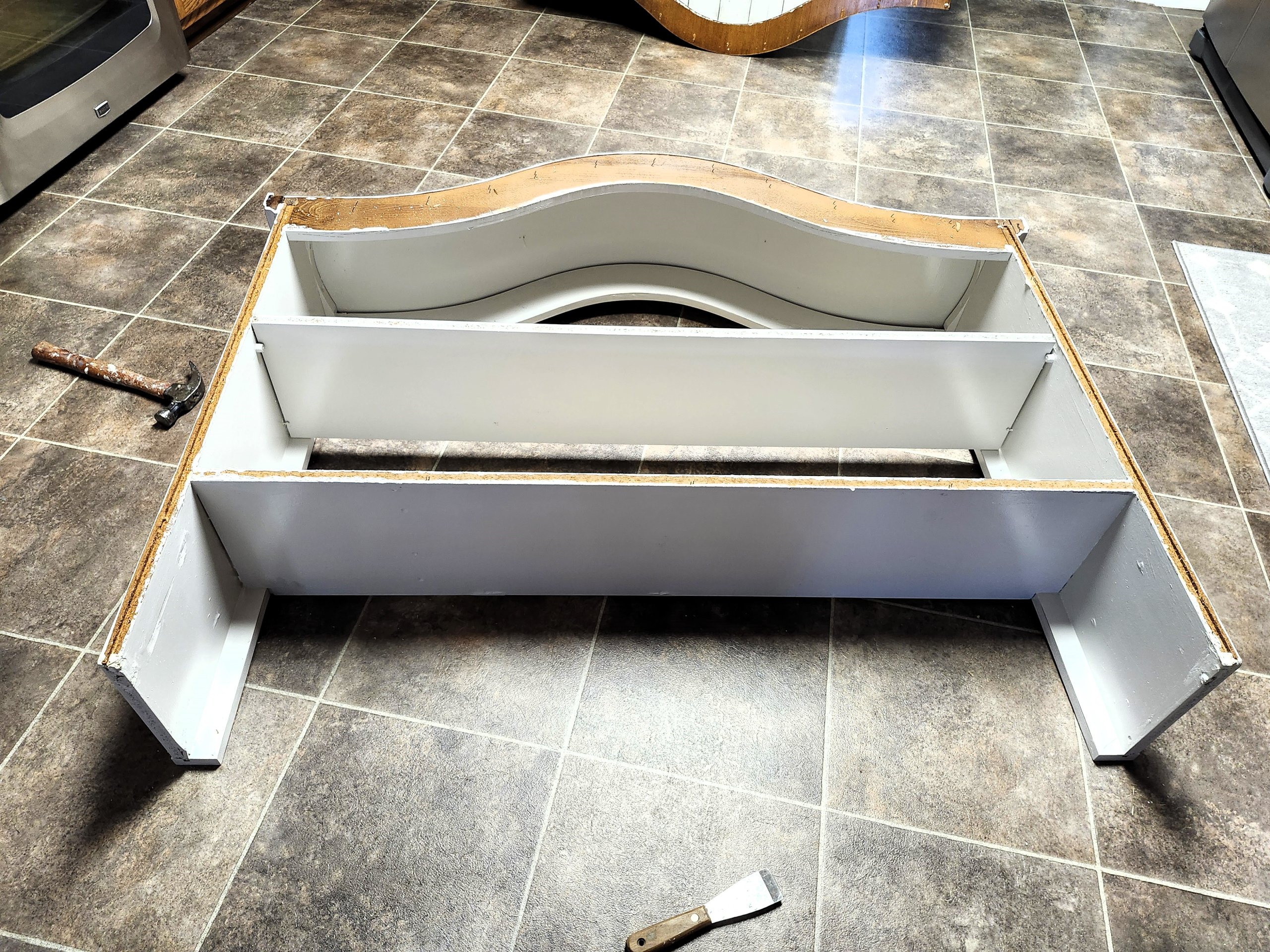 Laying the hutch on the floor front side down, I pried the back off of the hutch with a putty knife.