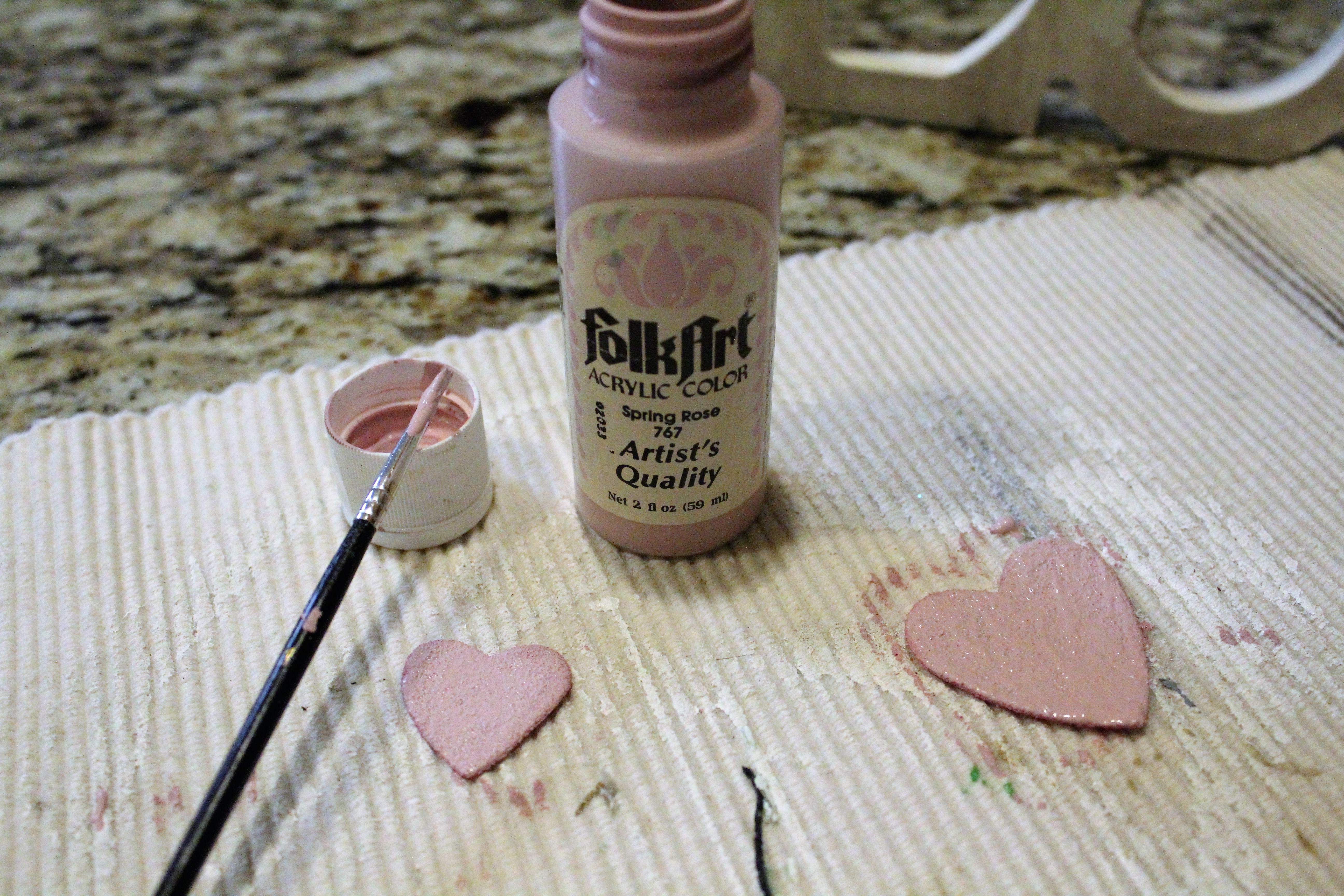 I had some hearts left over from last year’s Valentine’s project to add. I didn’t want the glitter look so I painted over the hearts with some Folk Art craft pink paint.