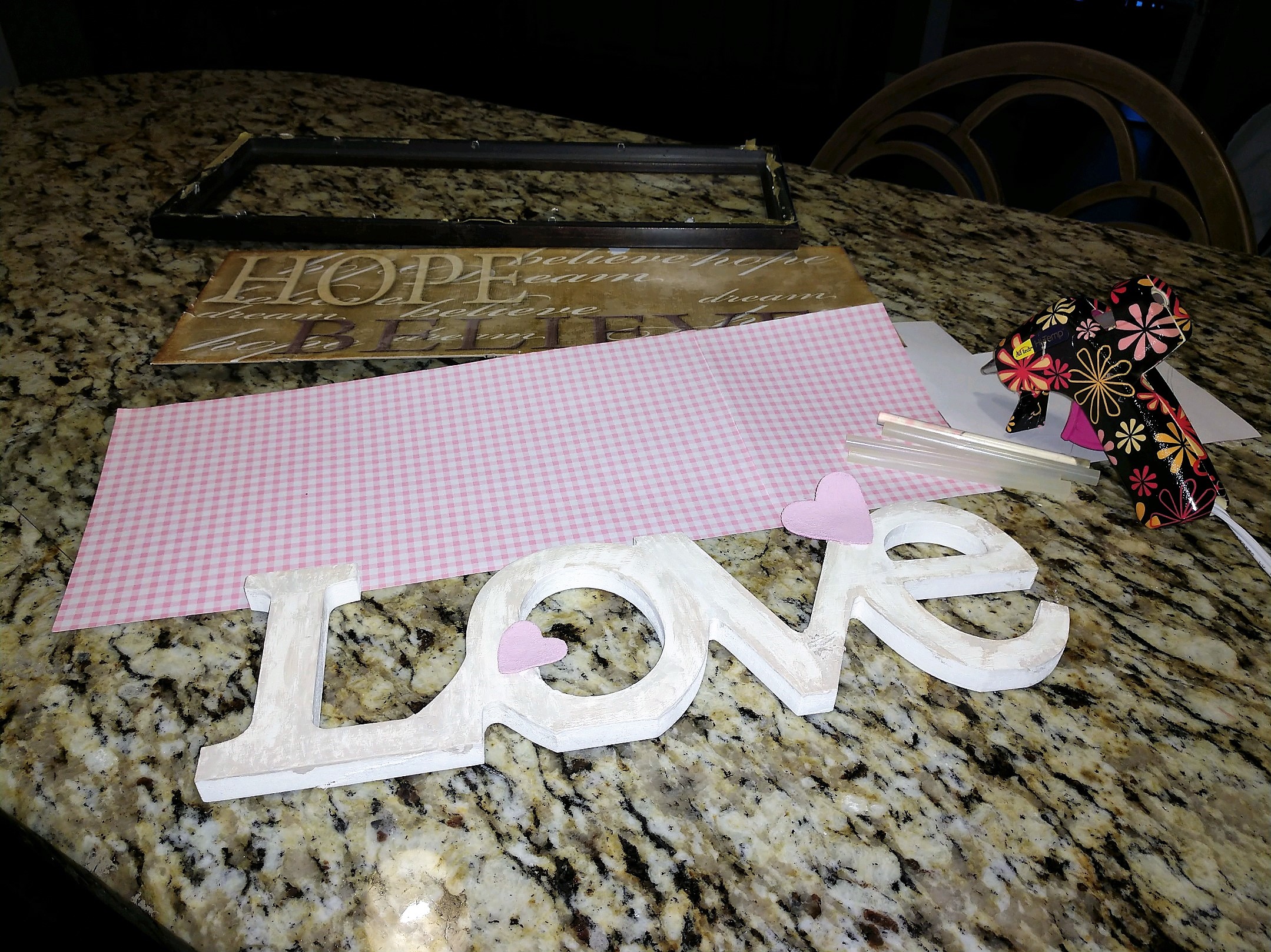 To restore my frame picture, all I have to do, is take the frame apart, remove the two pieces of tape that holds the scrap paper and Love sign, put the glass back in and put it all back together.