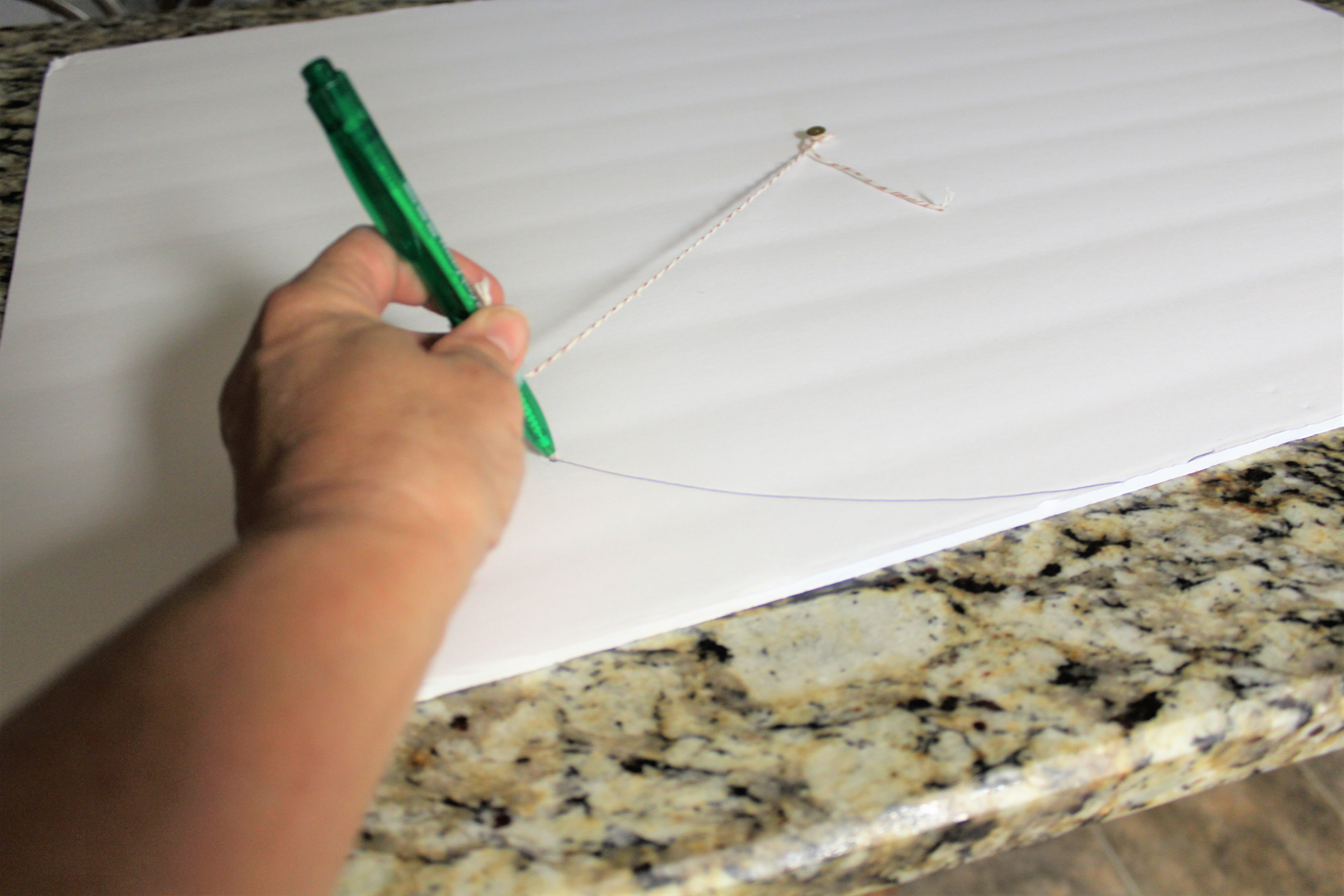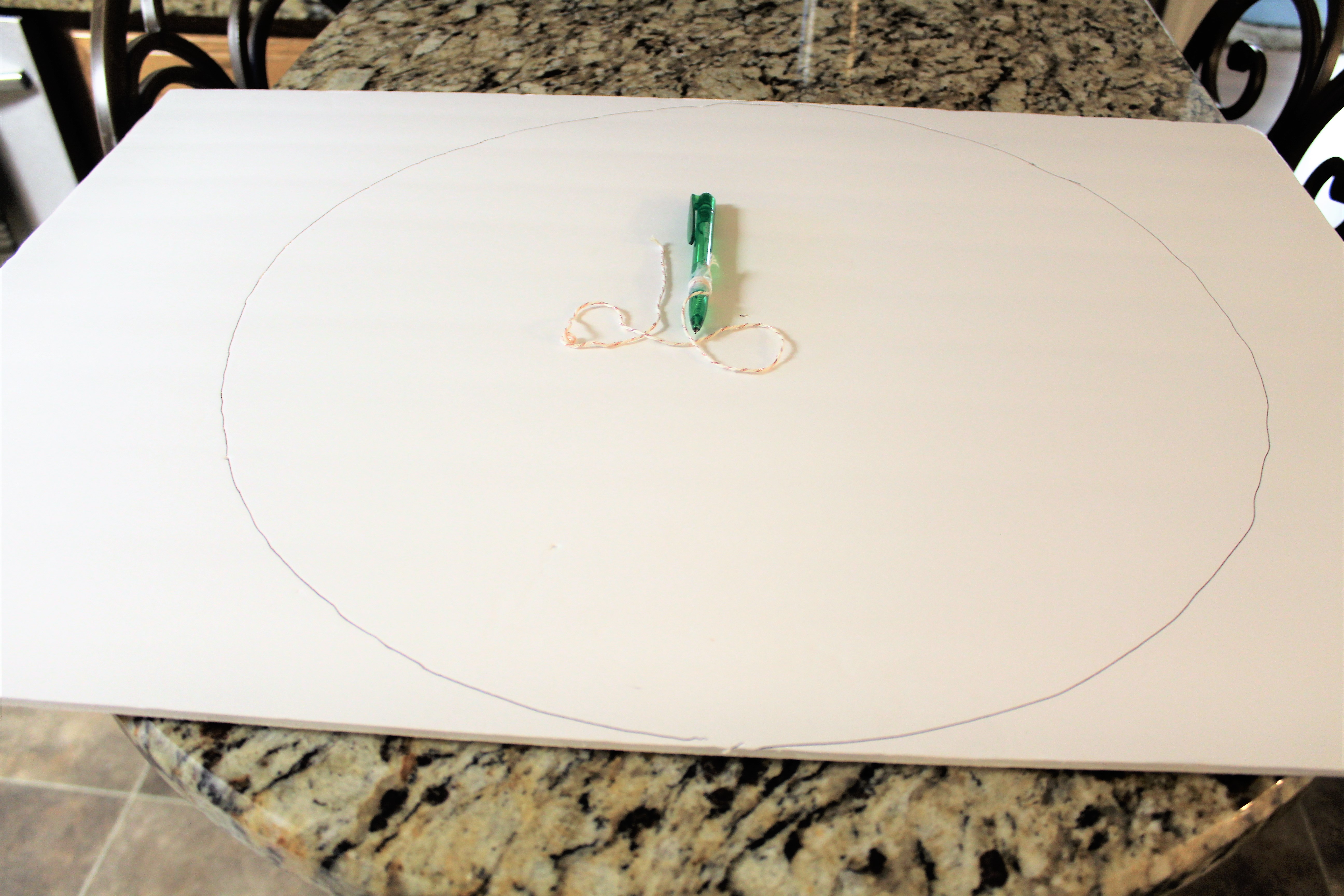 Finding the center of my foam board I placed a dot.  Taking the thumb tack wrapping the string around the tack in the length I needed to make the size of my circle.  I made sure I had 10 inches of string.  Taping my string around my pen I drew a circle on my foam board.