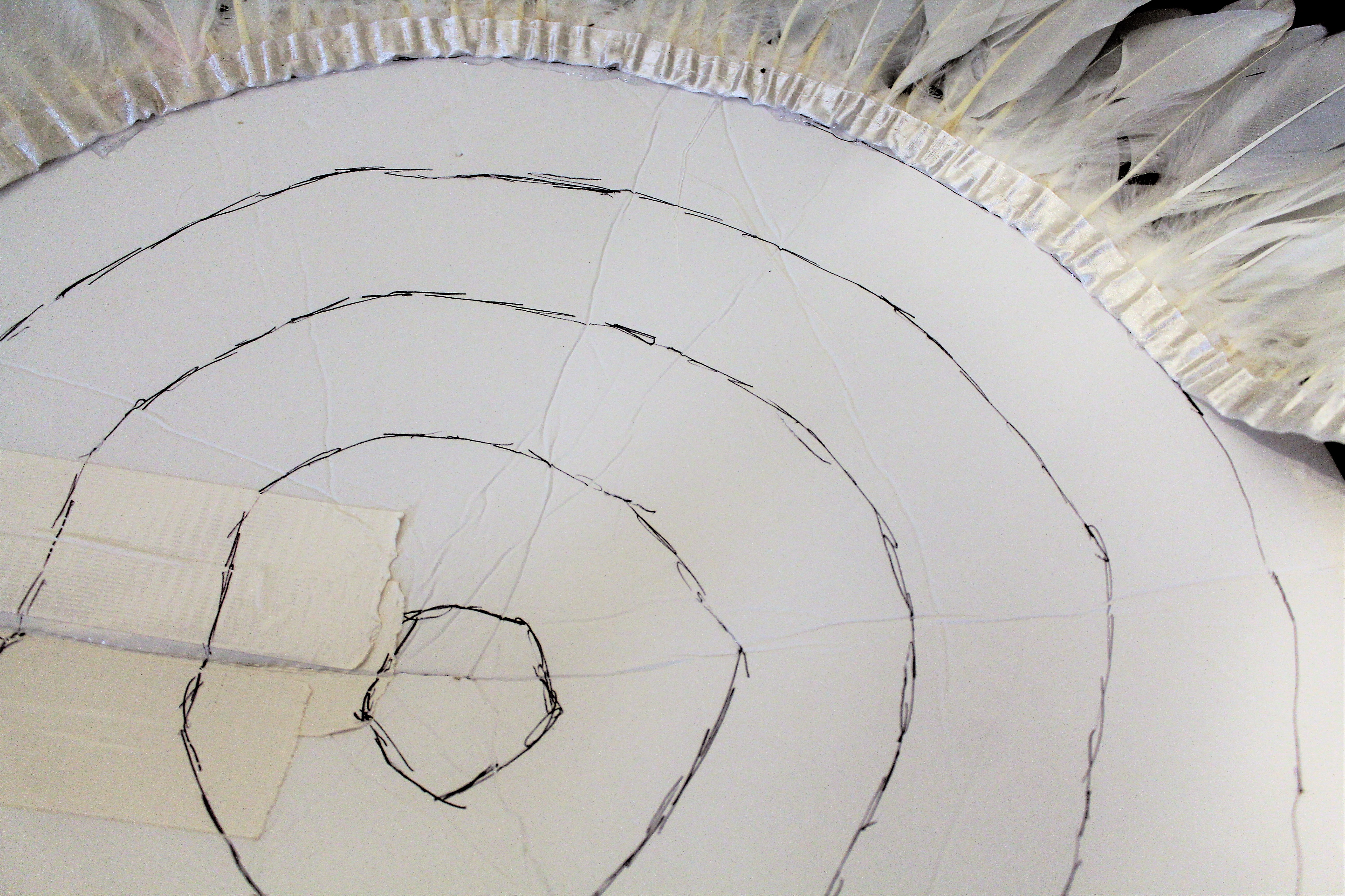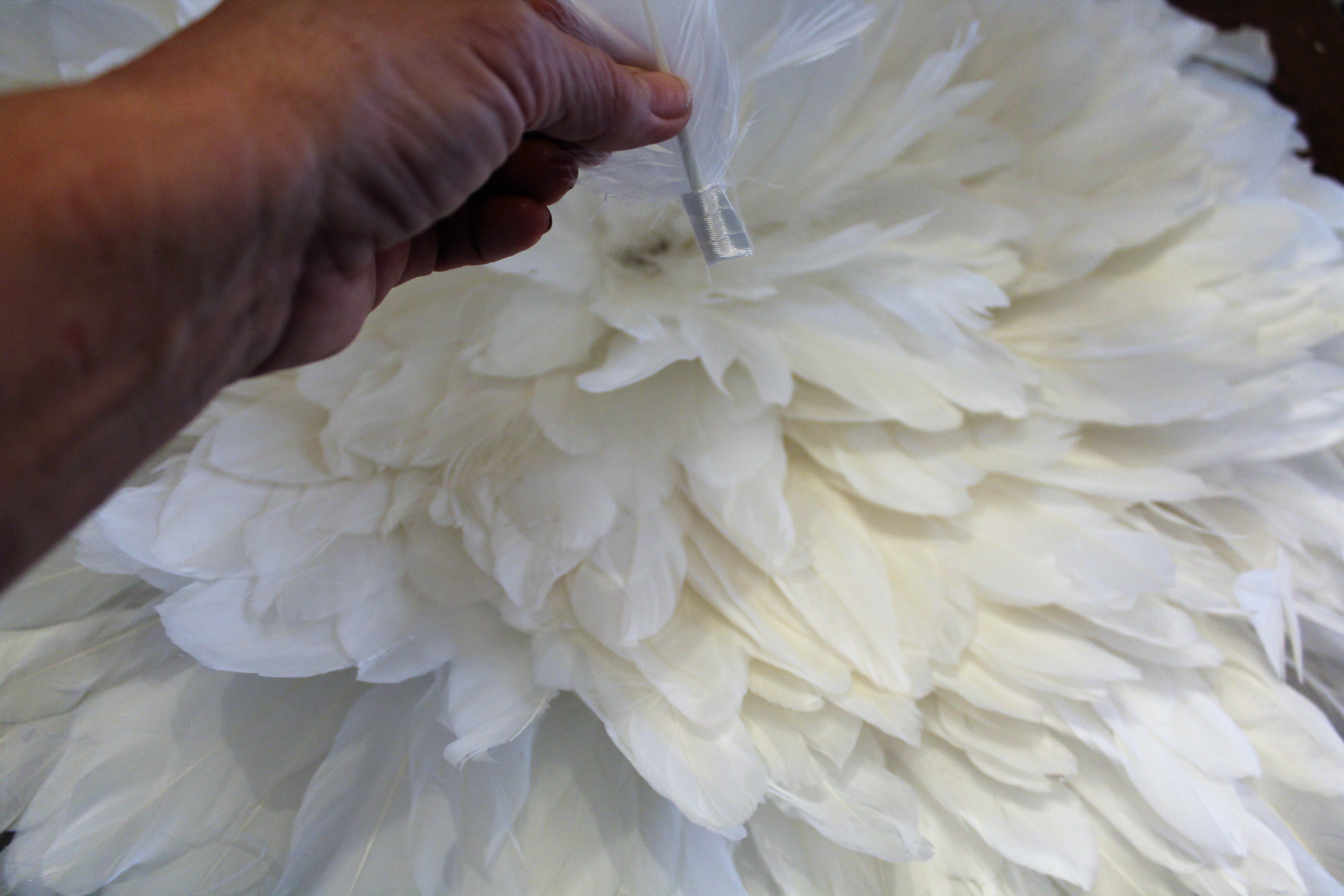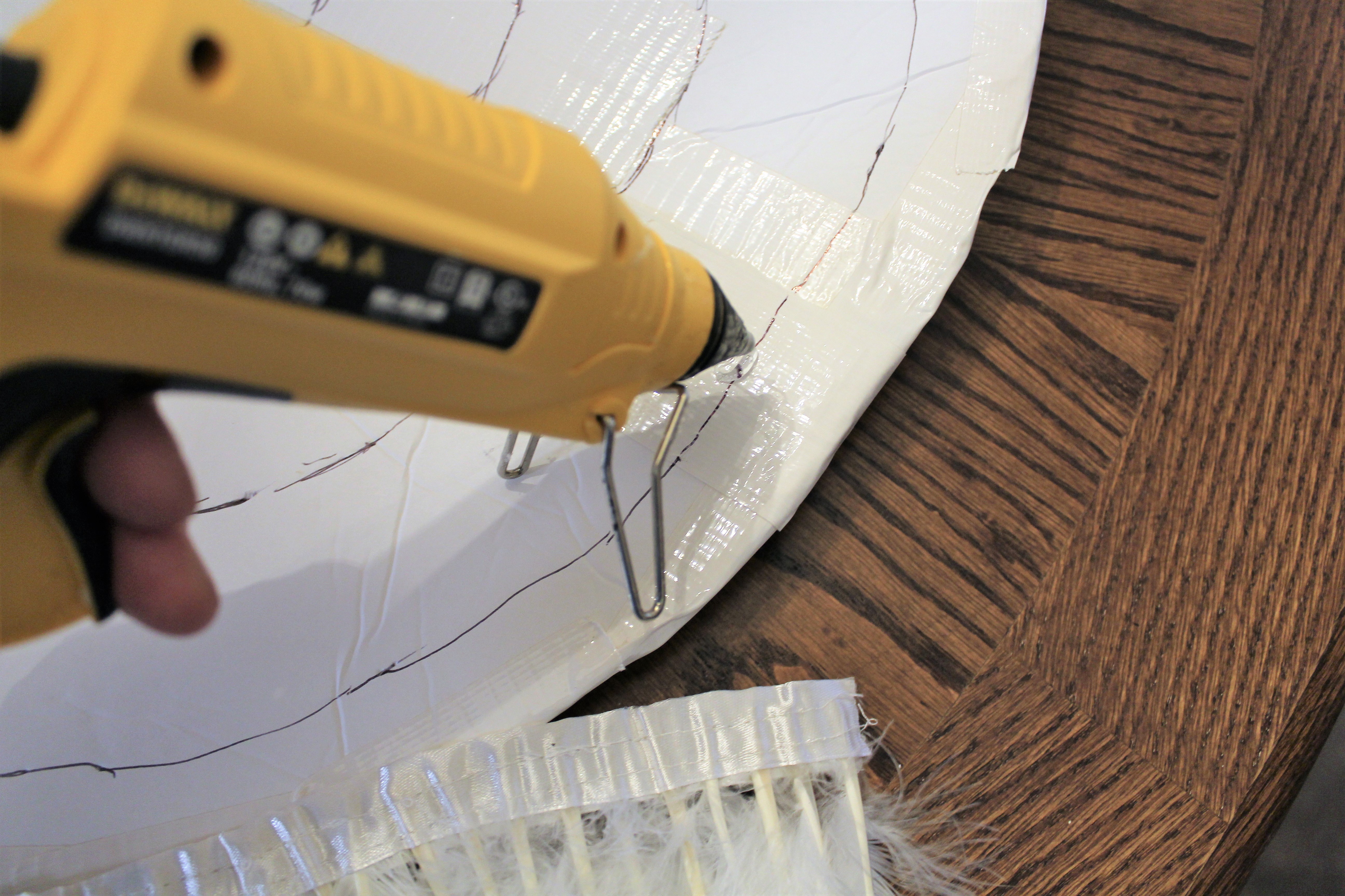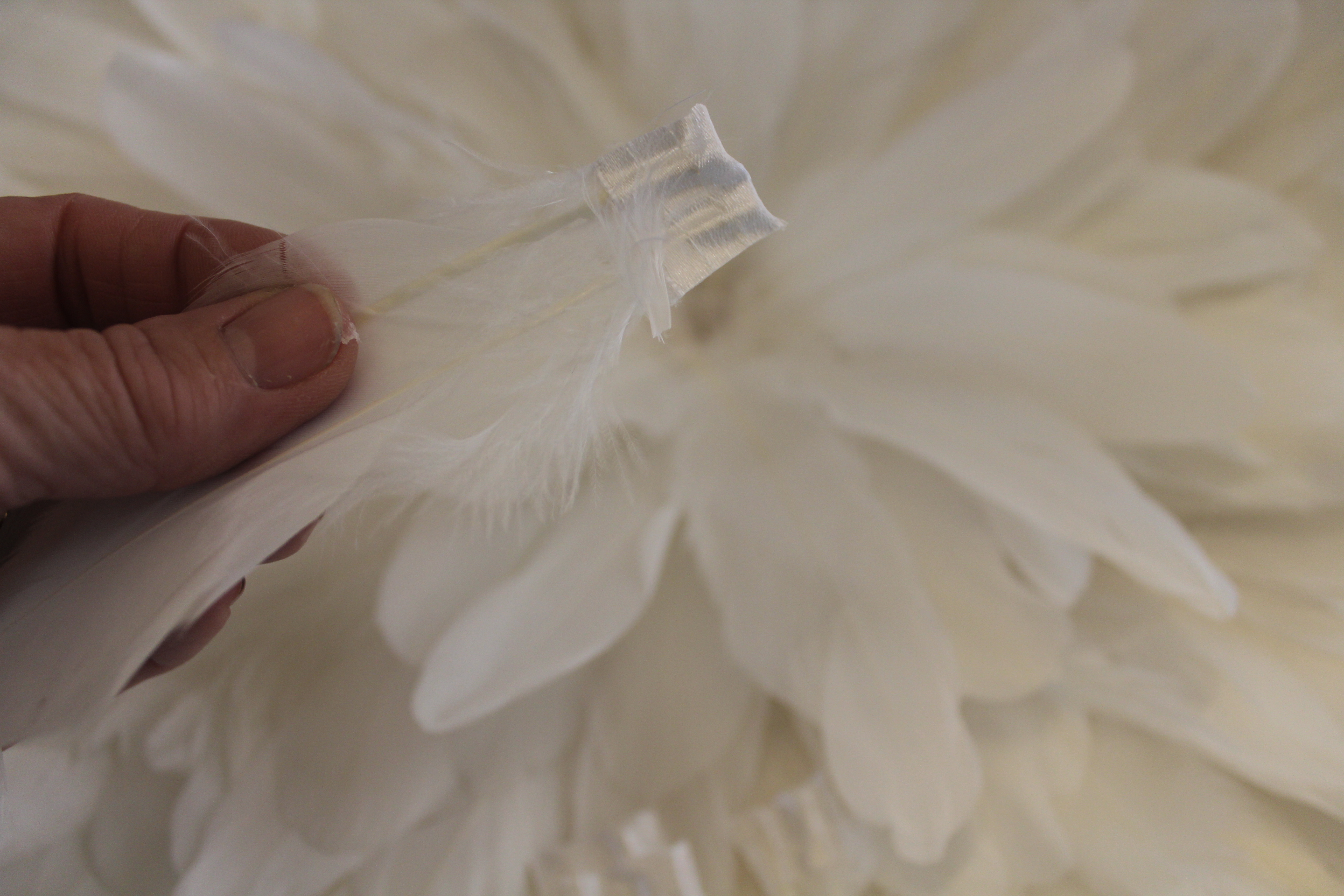 From here I cut my feather ribbon into smaller sections and hot glued them into the center.