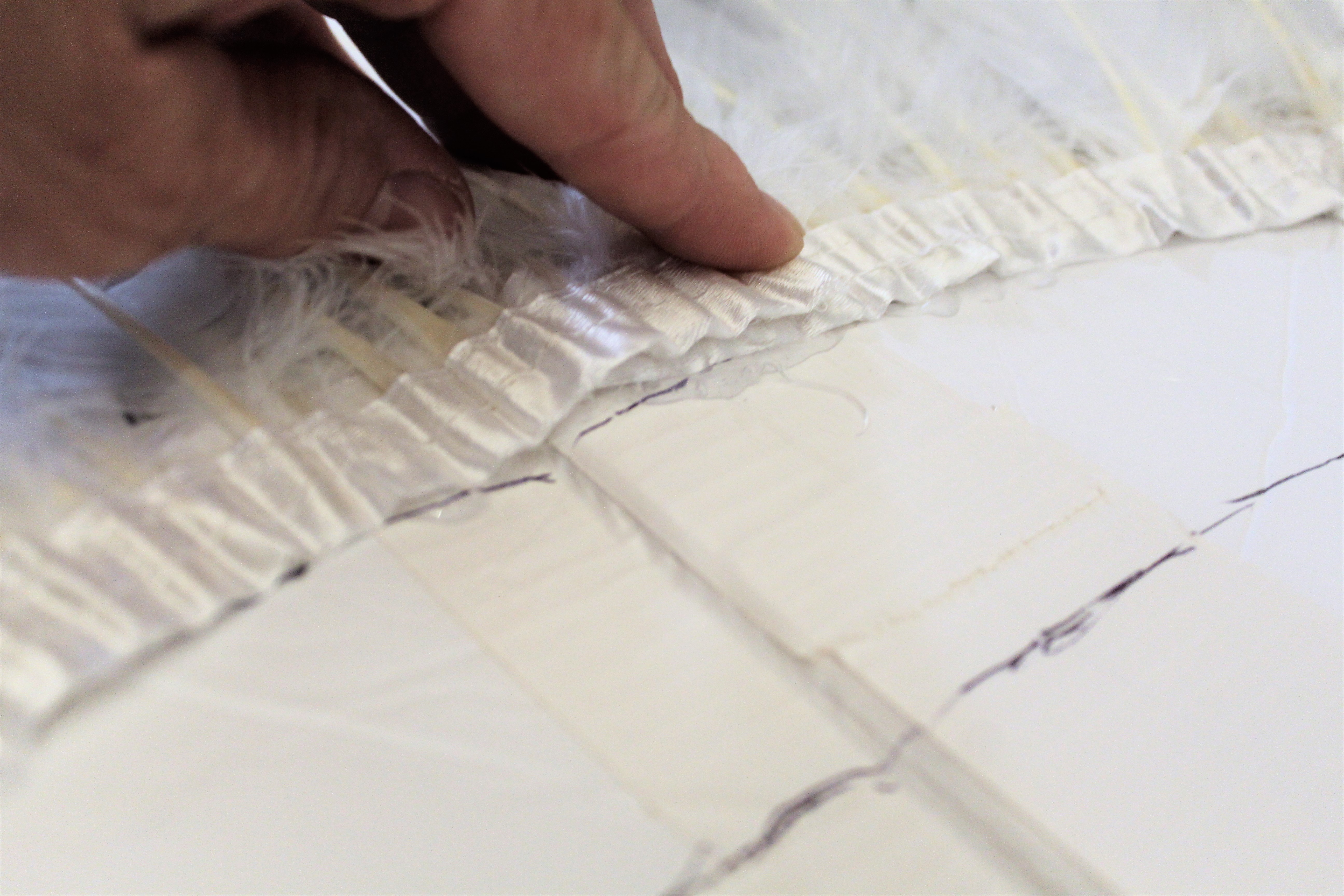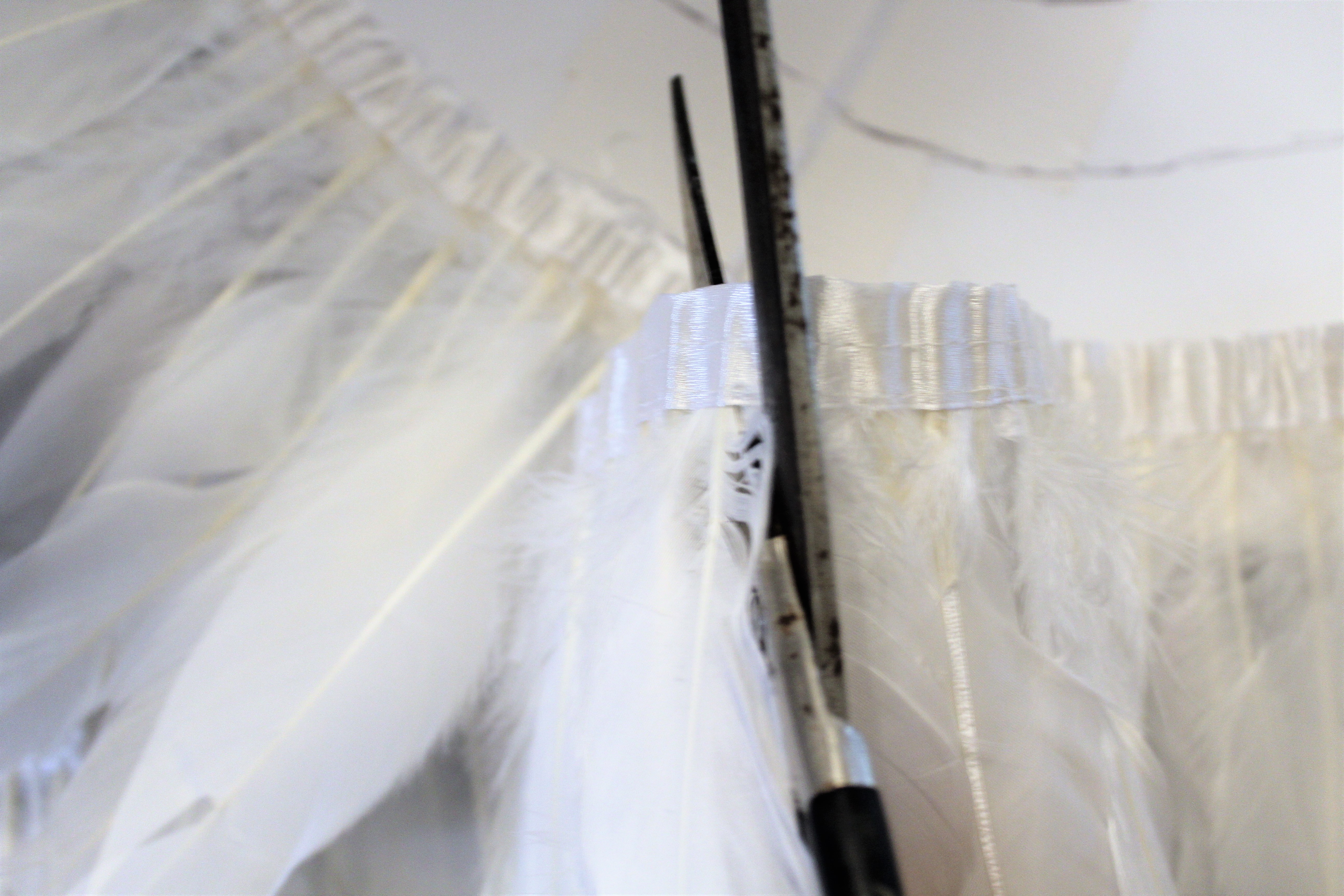 Taking the feather ribbon, a hot glue gun, many glue sticks and scissors.
