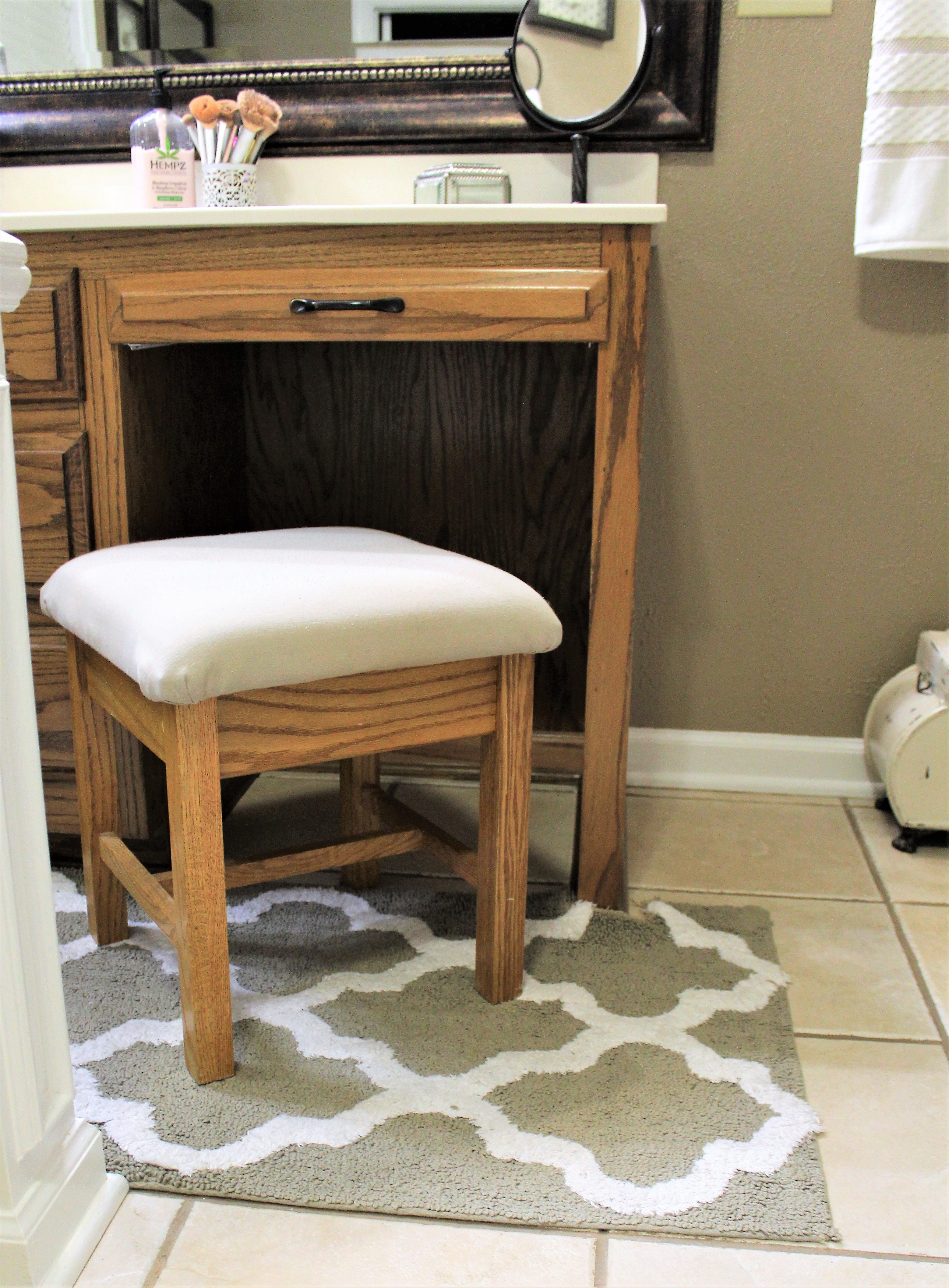 I also painted my little vanity chair and changed up the fabric.  To see the step by step tutorial you can check that out ⇒ VANITY STOOL UPDATE.