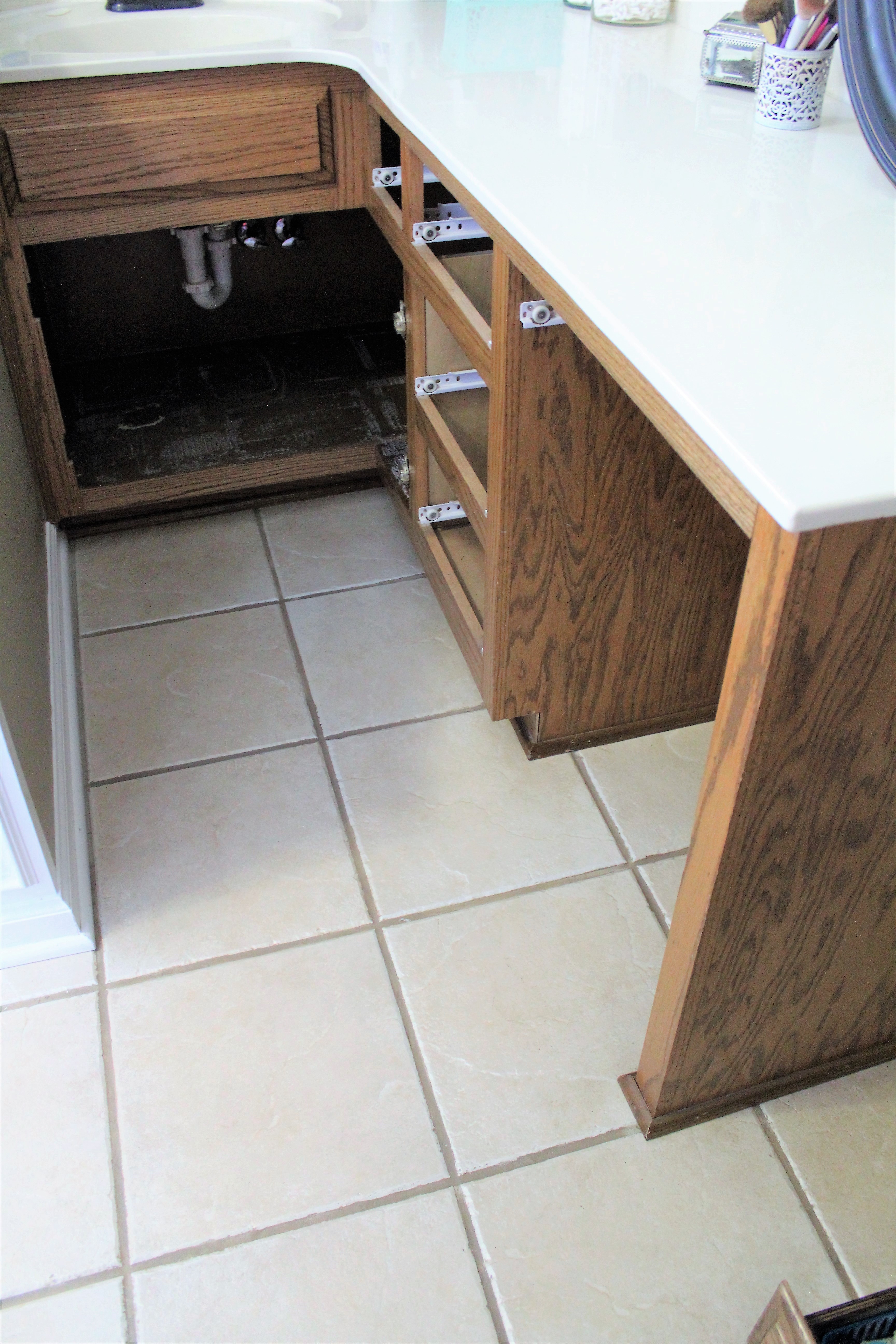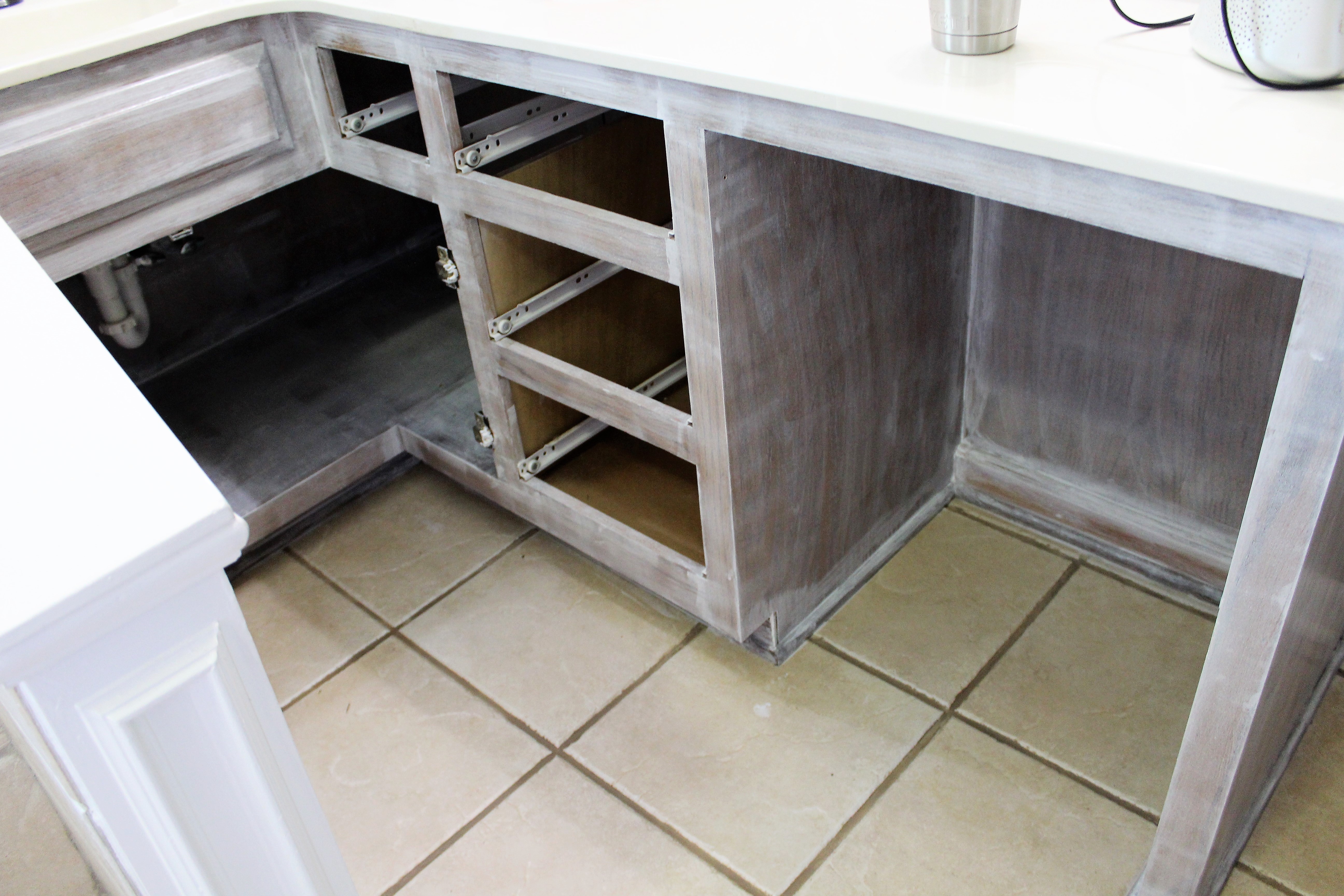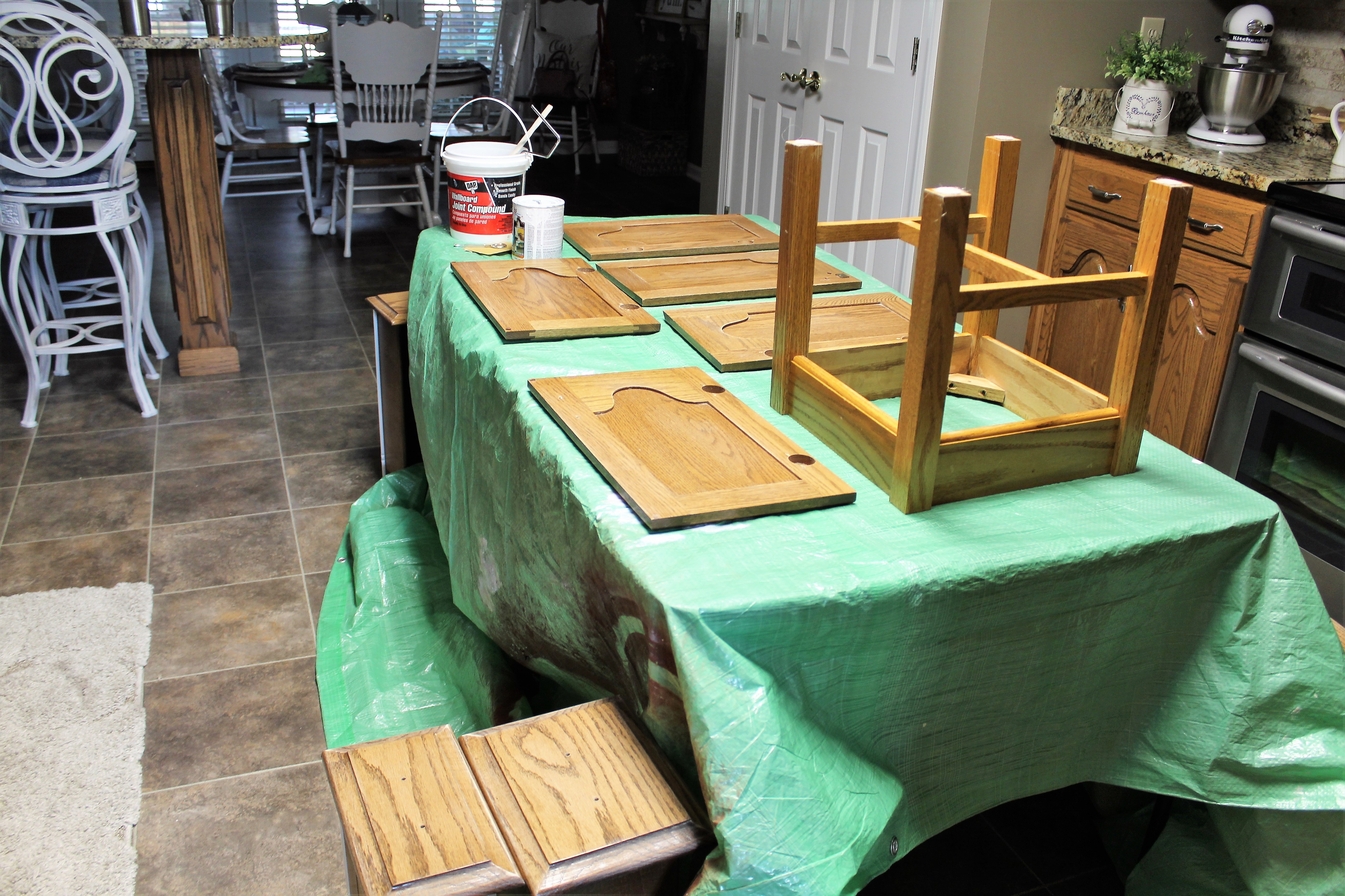 Now the mirrors are finished it is time to tackle the cabinets.  I removed all the drawers and doors from the cabinets.  Since it’s so hot out in the garage I decided to turn our kitchen into my work station.