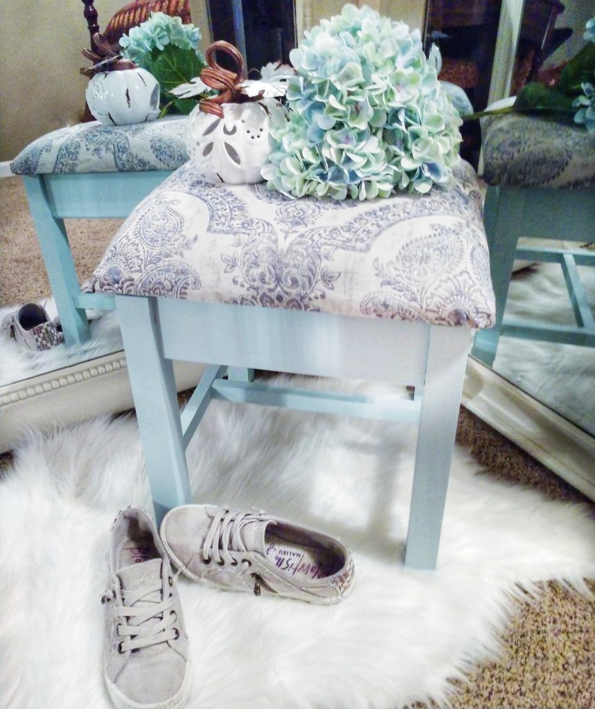 1. Cindy what you are seeing is the primer. Girl! I am using Benjamin Moore Edgecomb gray. Which actually is a pale white. I have to make a decision on the wall paint. I am torn between a pale blue or a pale khaki color. I hate the decision making. I know it is just paint but I want to do it and keep it. Thanks the stool one another one I painted the color once didn’t like it and painted it again blue. Easy fix but doing the walls would cost a lot more to replace. So glad you are joining us on the challenge. It will be so fun looking at everyone’s reveal.