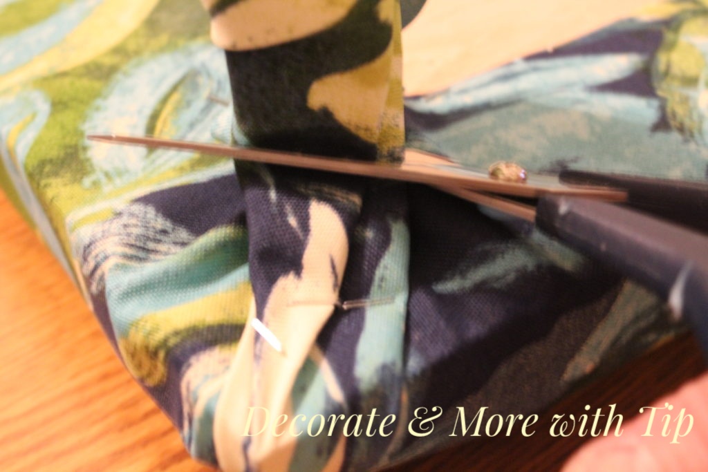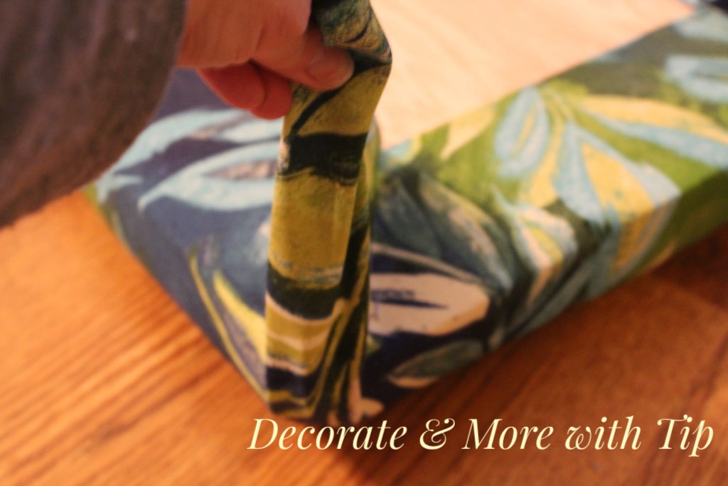 I cut a piece of foam cushion the size of the board. I also cut a piece of fabric larger than the foam and insert. I placed the fabric face down and the foam and board on top.