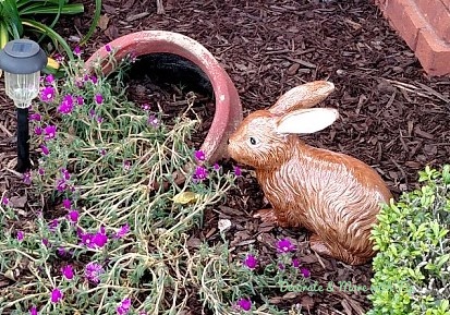Like I stated earlier, I have nothing when it comes to rabbits or anything Easter. No wait! I have a rabbit! I remember that I have a yard ornament that was given to us back in 1986 by a sweet family friend. She made this for us. Both ears were broken and glued back on, but we keep it just because she made that for us. It sits in my flower bed every year.