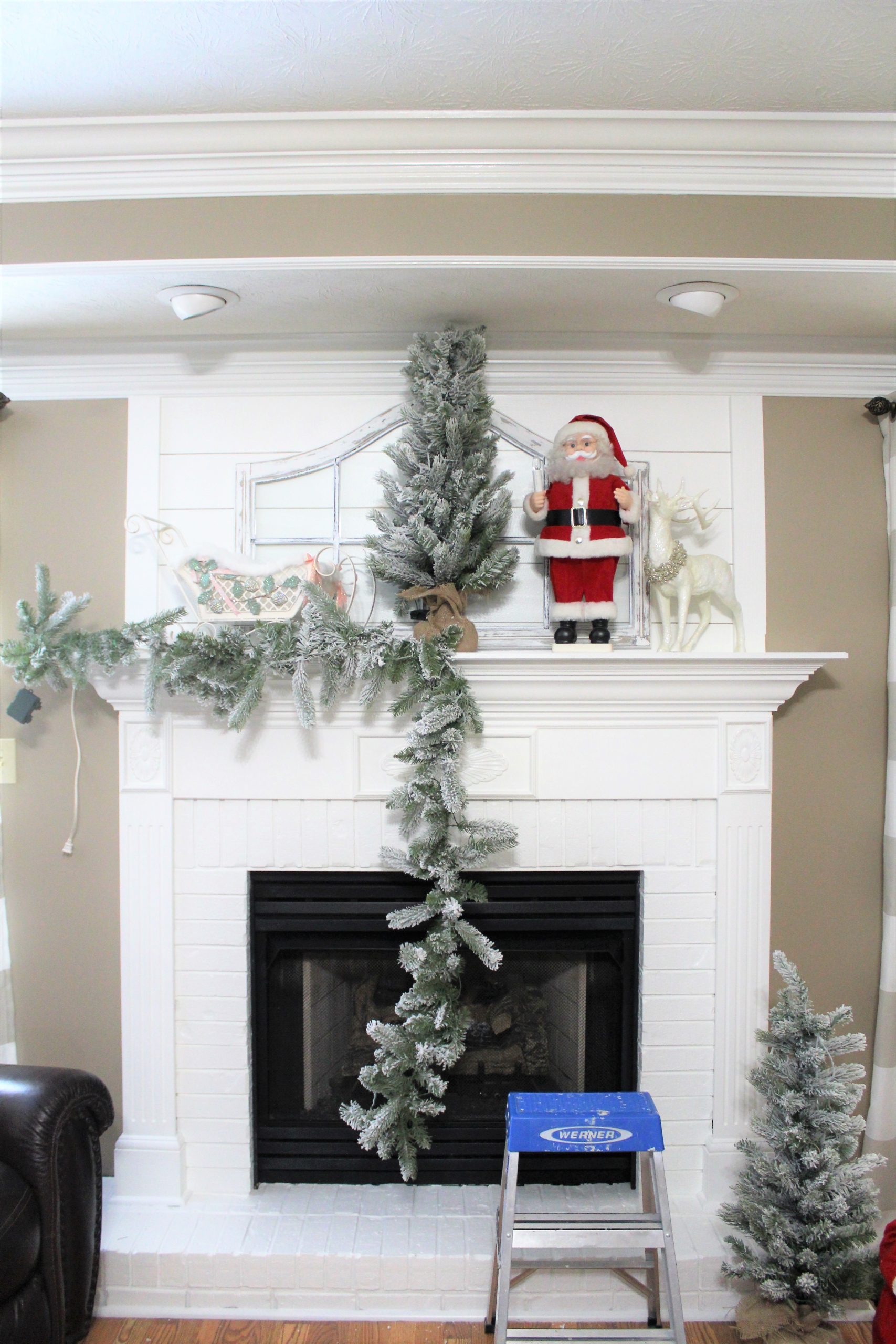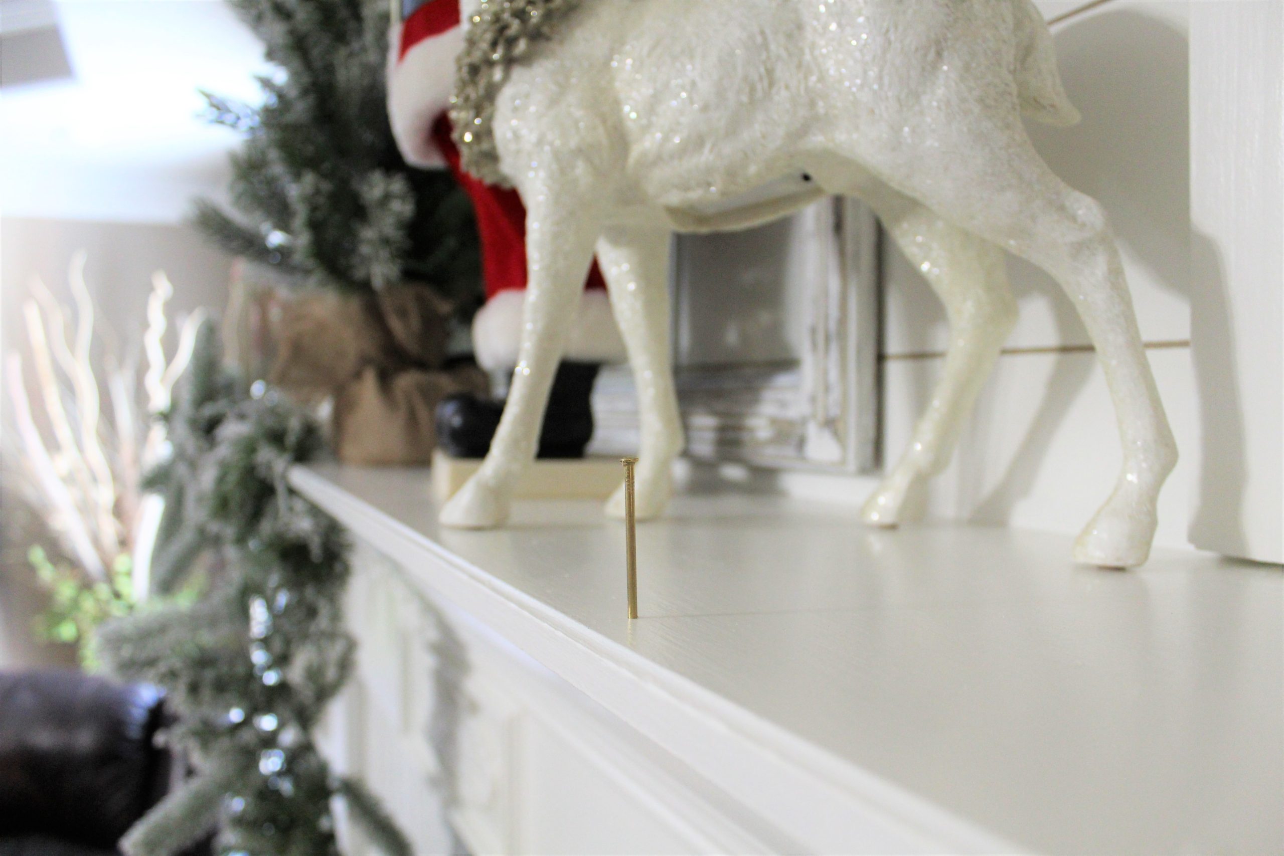 Next is placing my King of Christmas flock garland.  I use large nails, which I have pre-drilled holes in my mantel to place the nails into every year.  I never have had luck with command hooks.